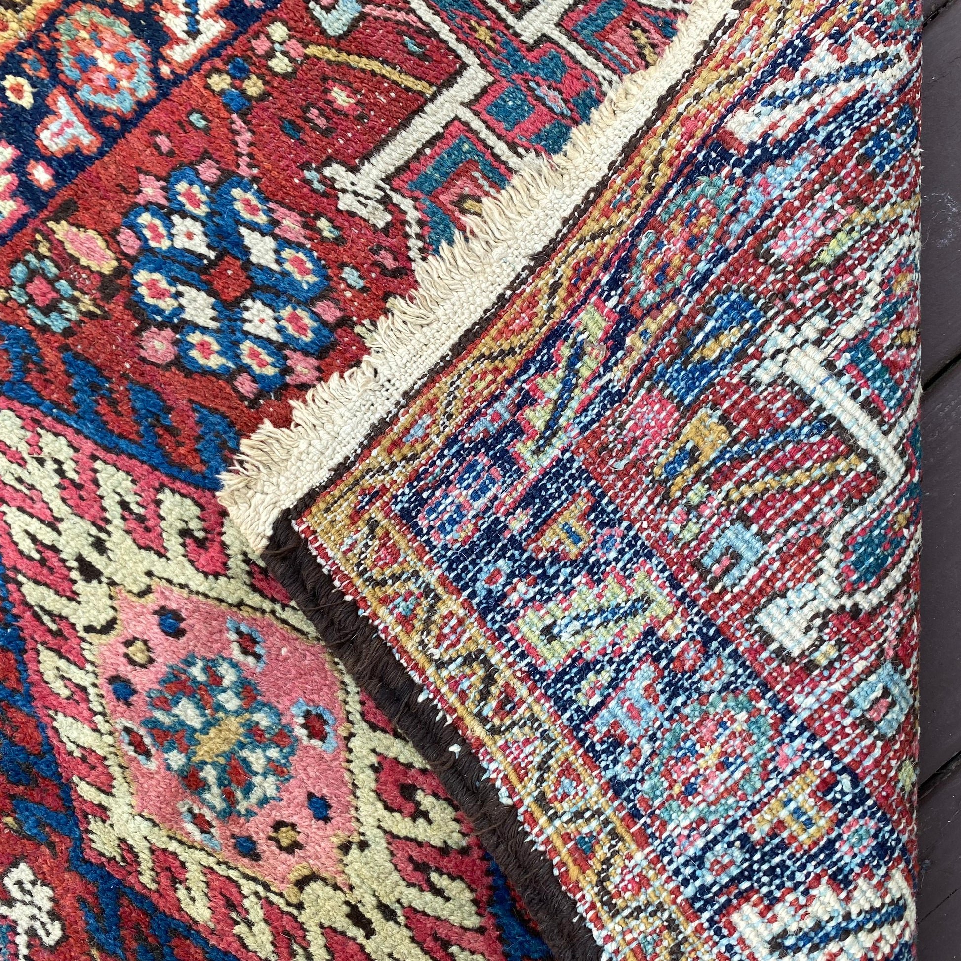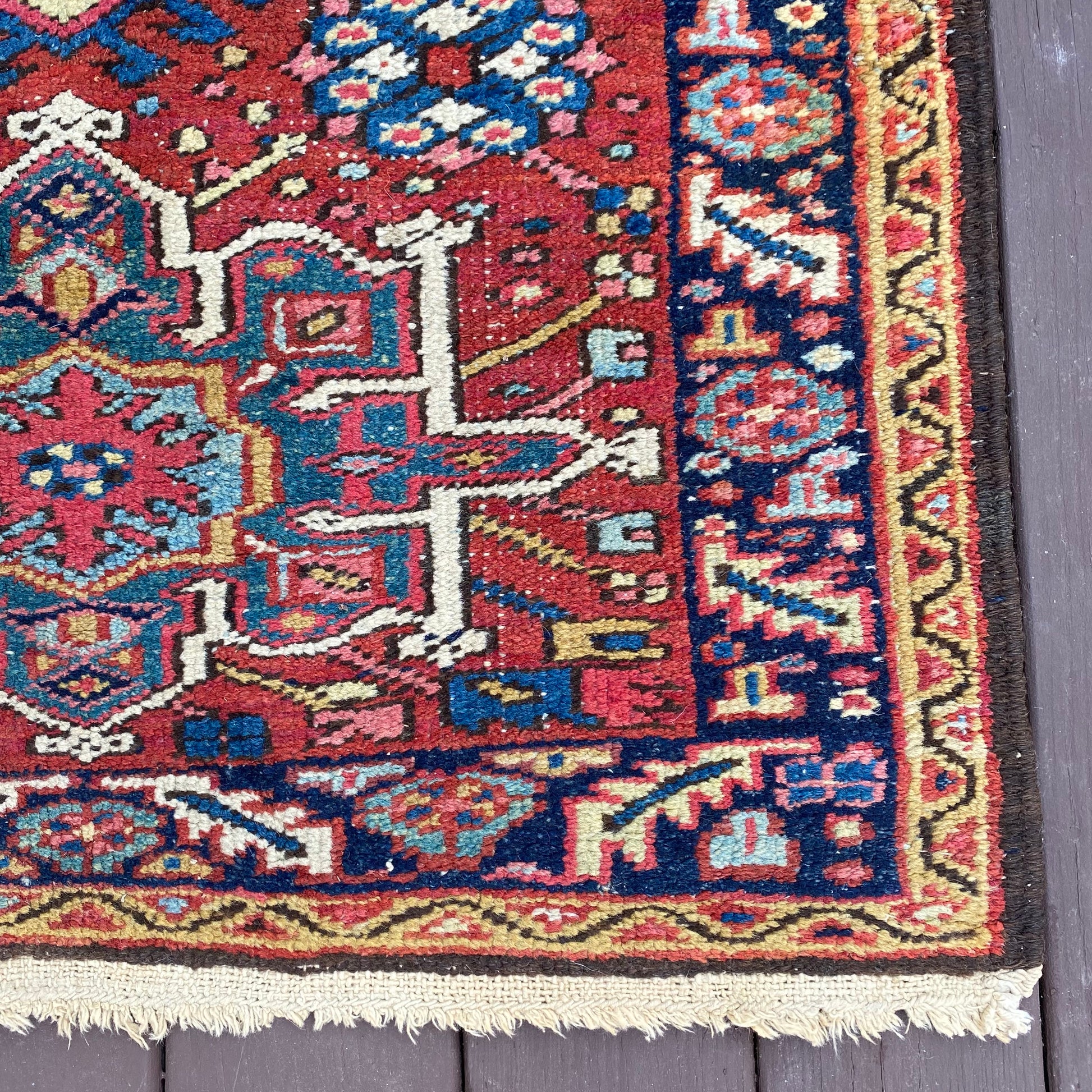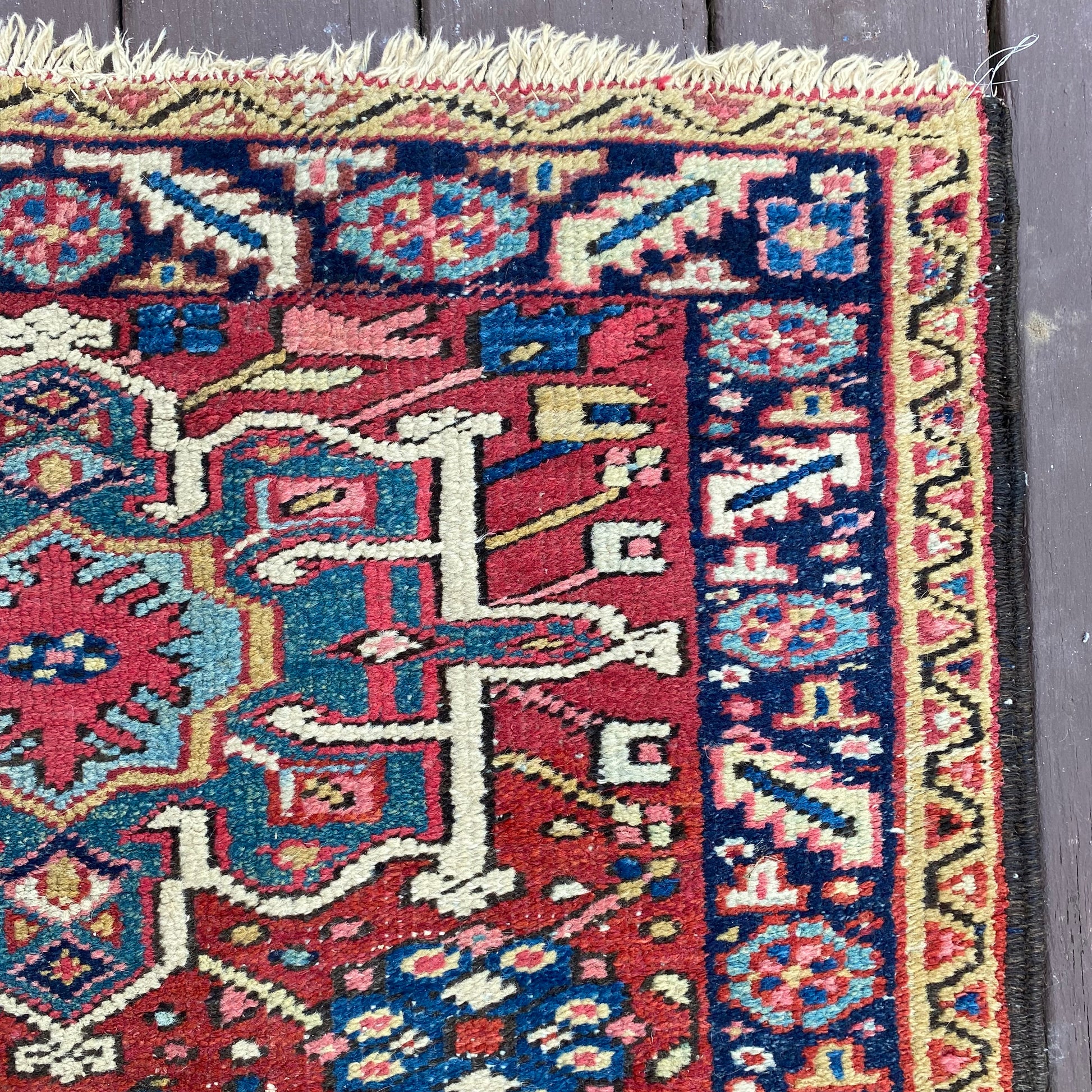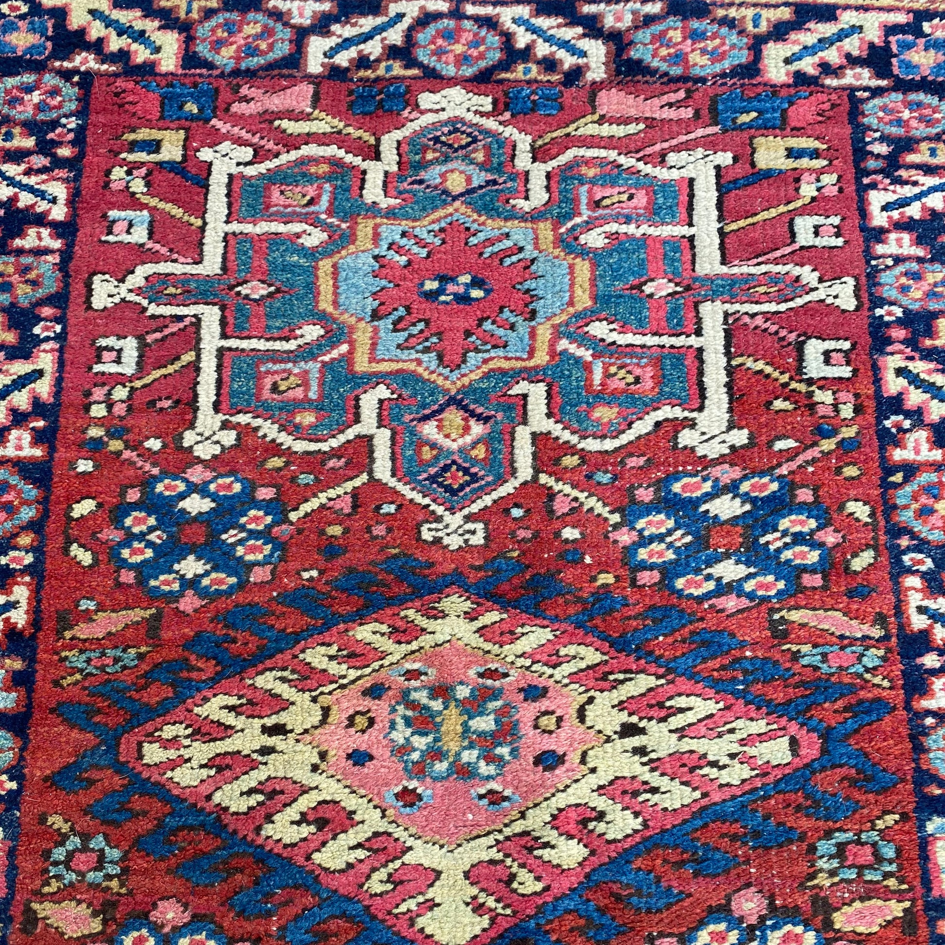 This vintage rug is in good condition. The design features a tribal pattern set in a red field with blue and white highlights. There is wear throughout as seen in the photos.