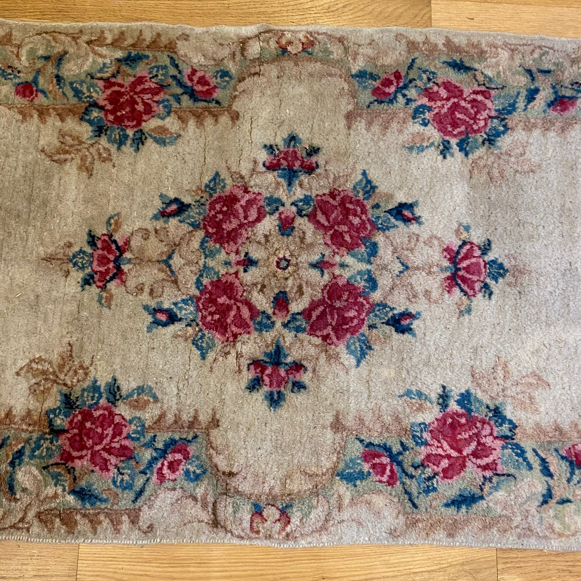 This vintage rug is in good condition. The design features a floral pattern set in a cream field with pink and blue highlights. There is wear throughout and some minor blemishes as seen in the photos.
