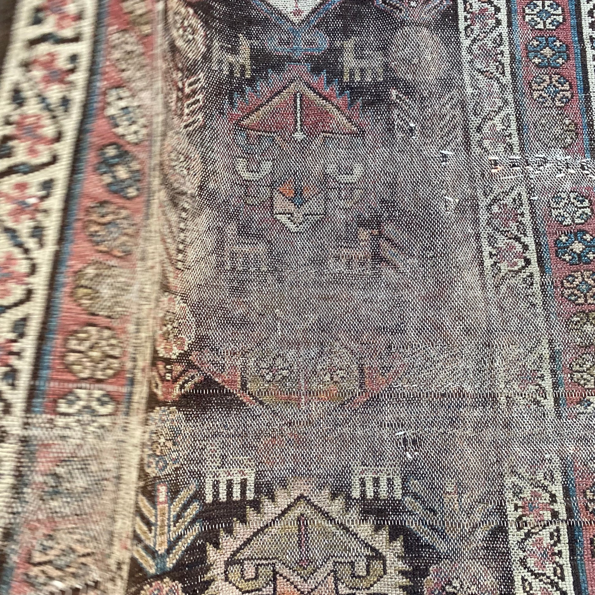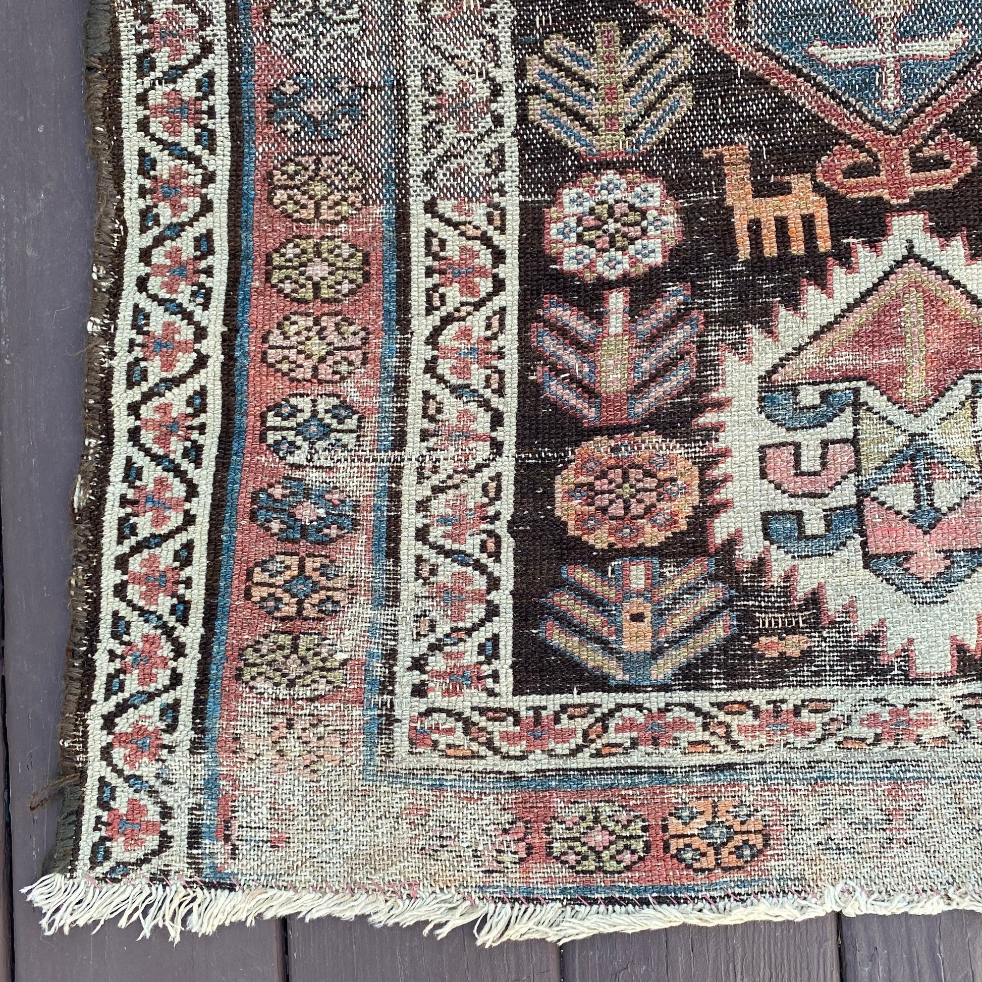 This antique rug is in poor condition. The design features an all-over tribal pattern set in a brown field with blue and white highlights. There is heavy wear throughout as seen in the photos.