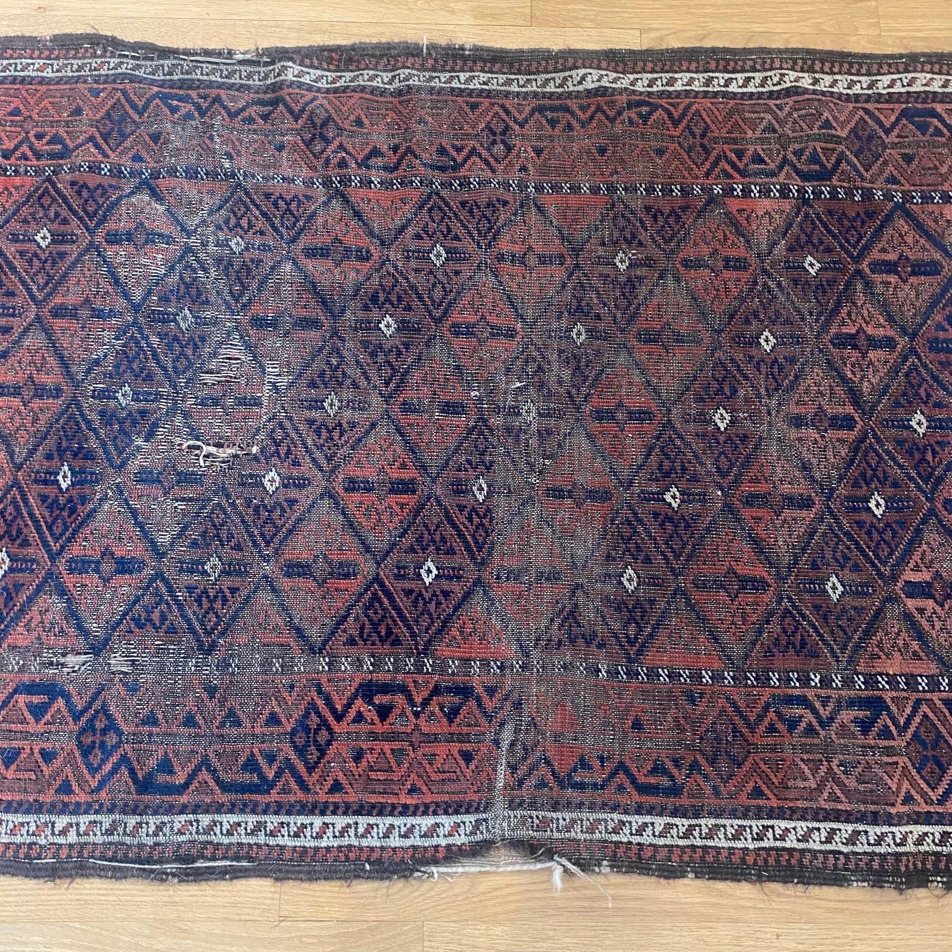 This vintage rug is in fair condition. The design features a tribal pattern set in a blue field with red brown and white highlights. There is wear on the edges, fringe ends and throughout. There are some minor repairs.