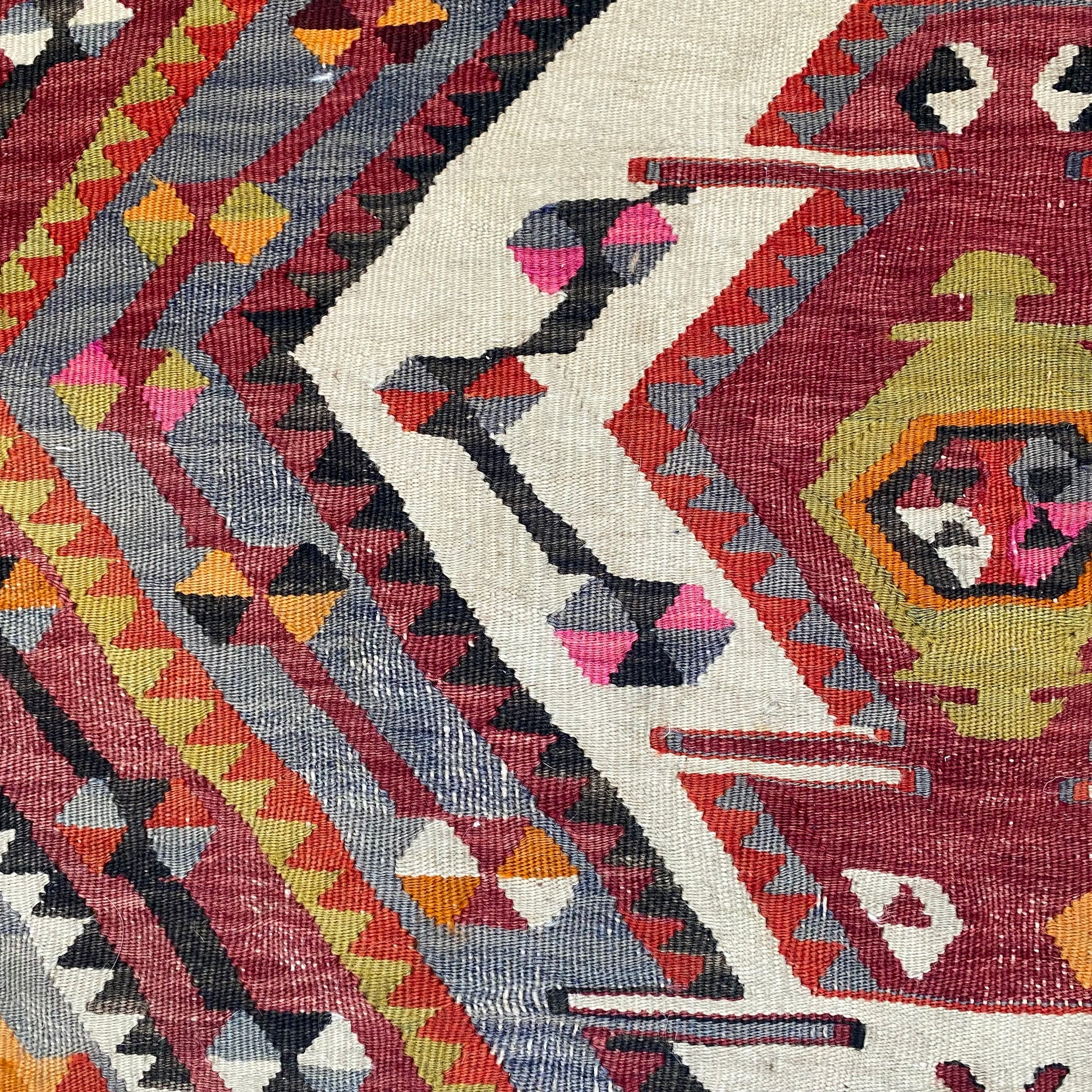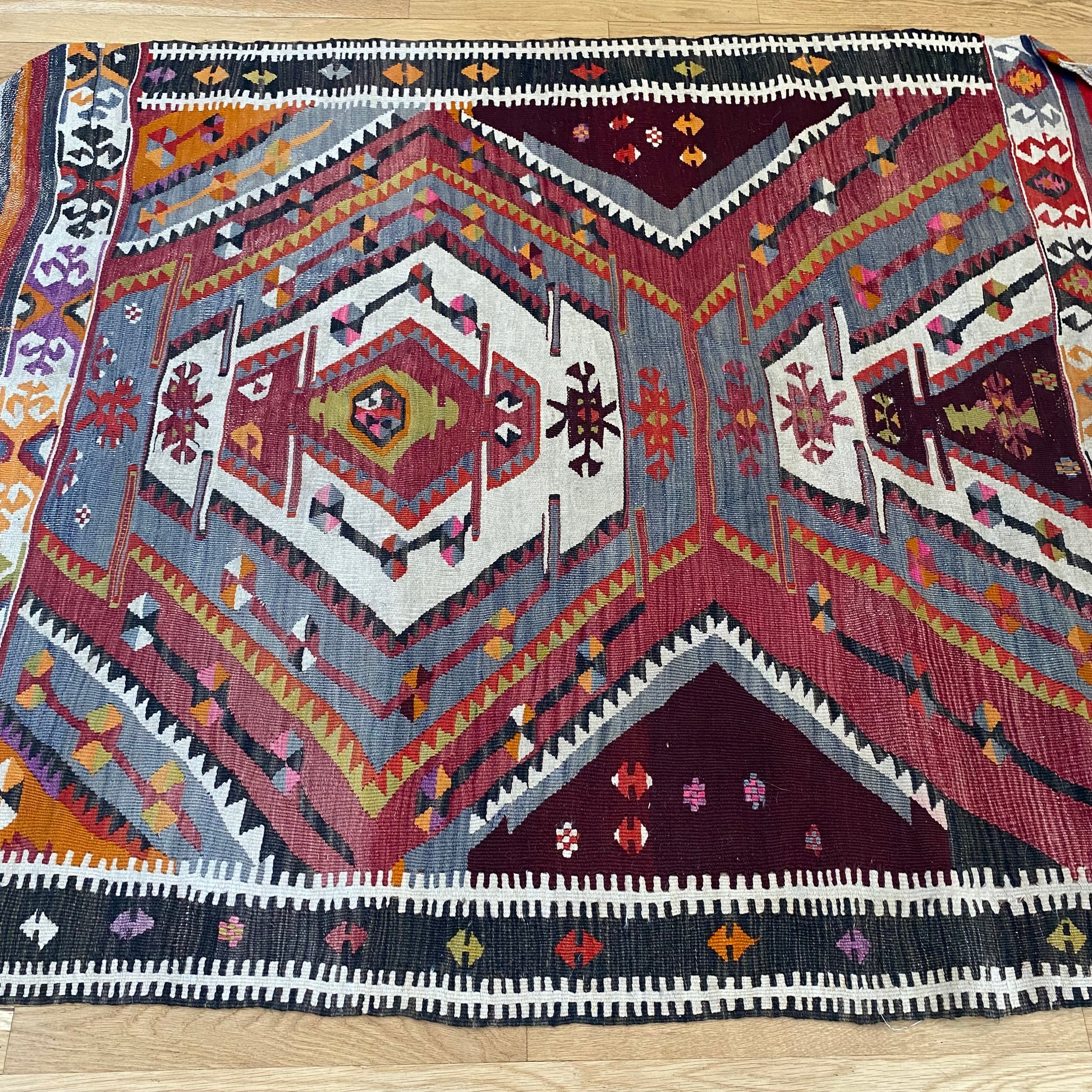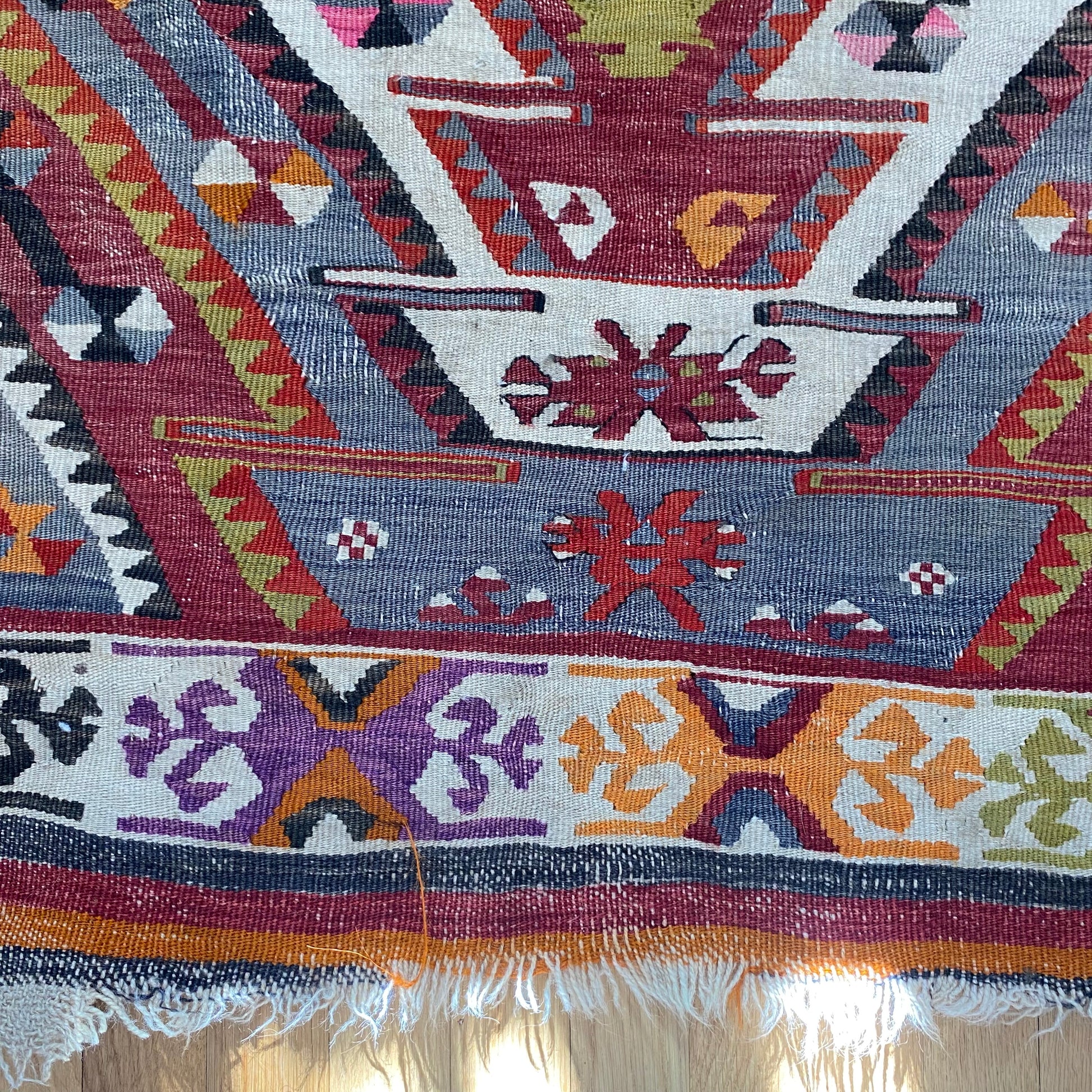 This vintage rug is in good condition. The design features a geometric tribal pattern with red, purple and white highlights. There is wear on the edges, fringe ends and throughout as well as some blemishes as seen in the photos. There is some curling in one corner.