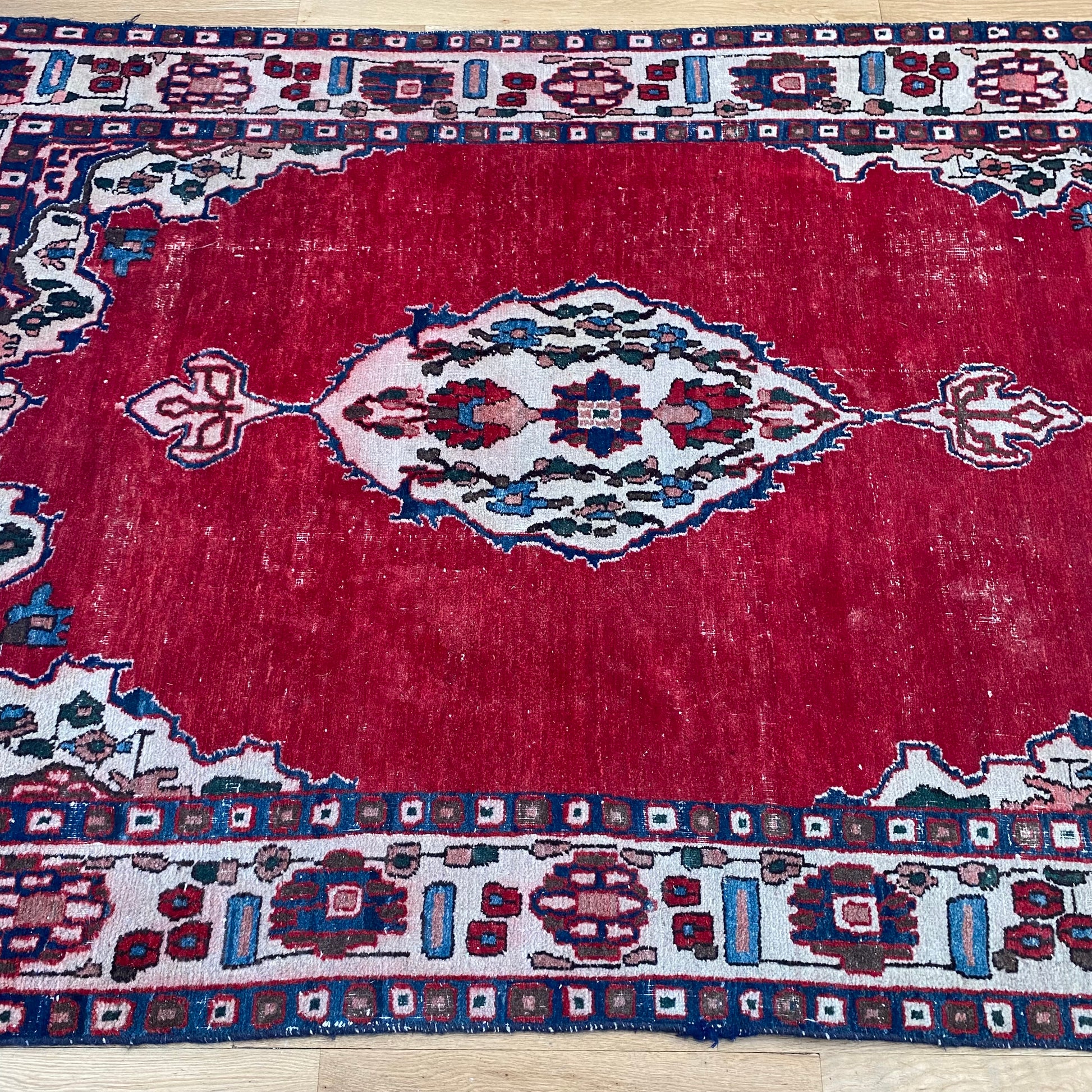 This vintage rug is in good condition. The design features a central medallion set in a red field with blue and white highlights. There is wear throughout and some color run as seen in the photos.