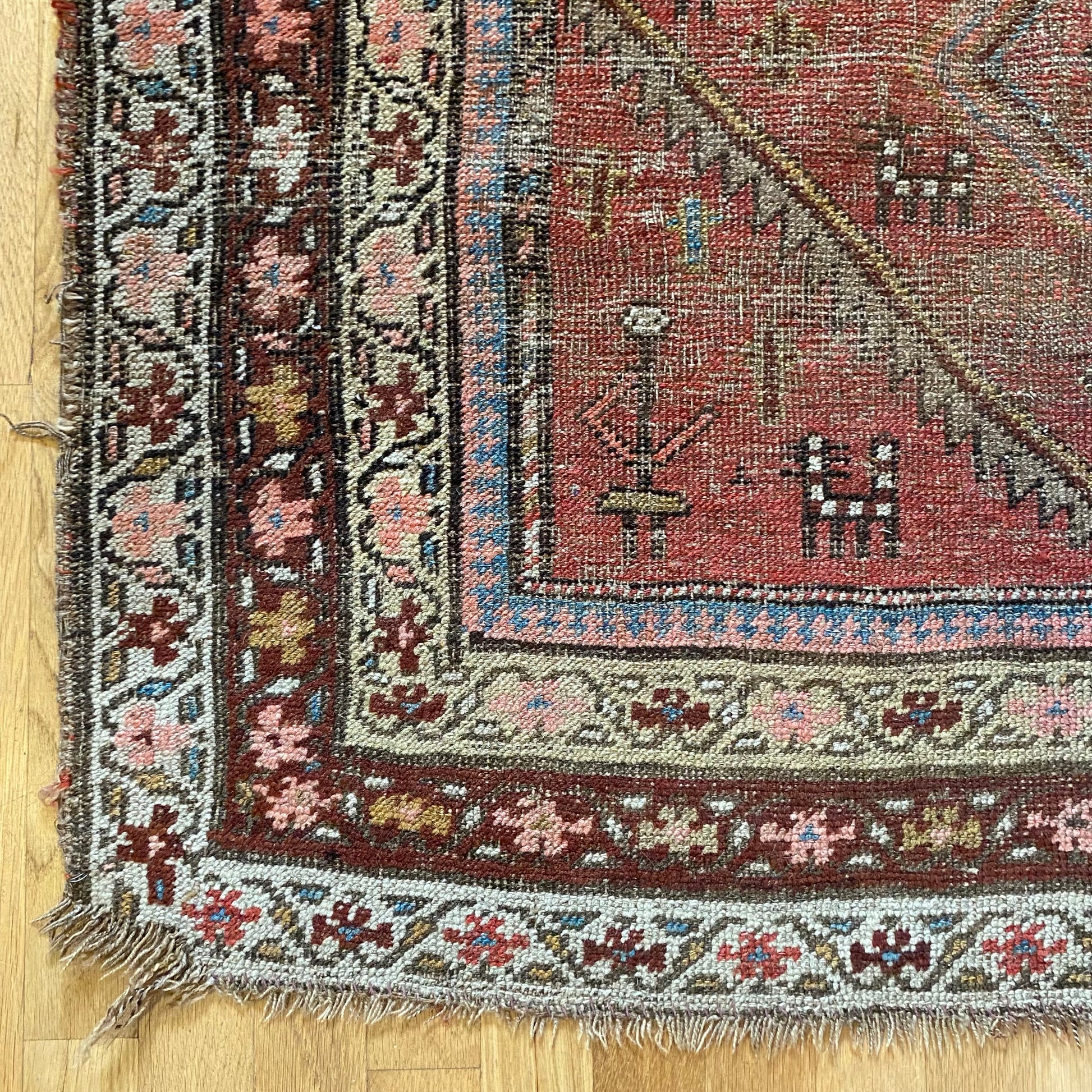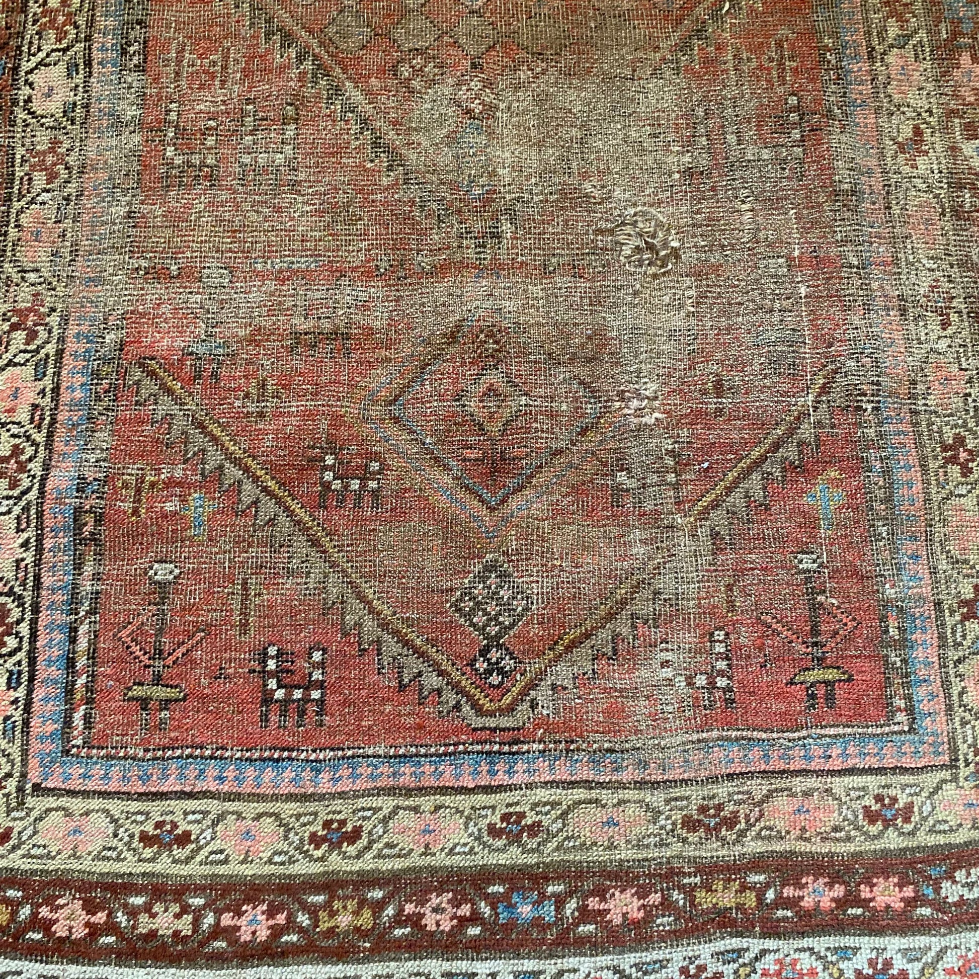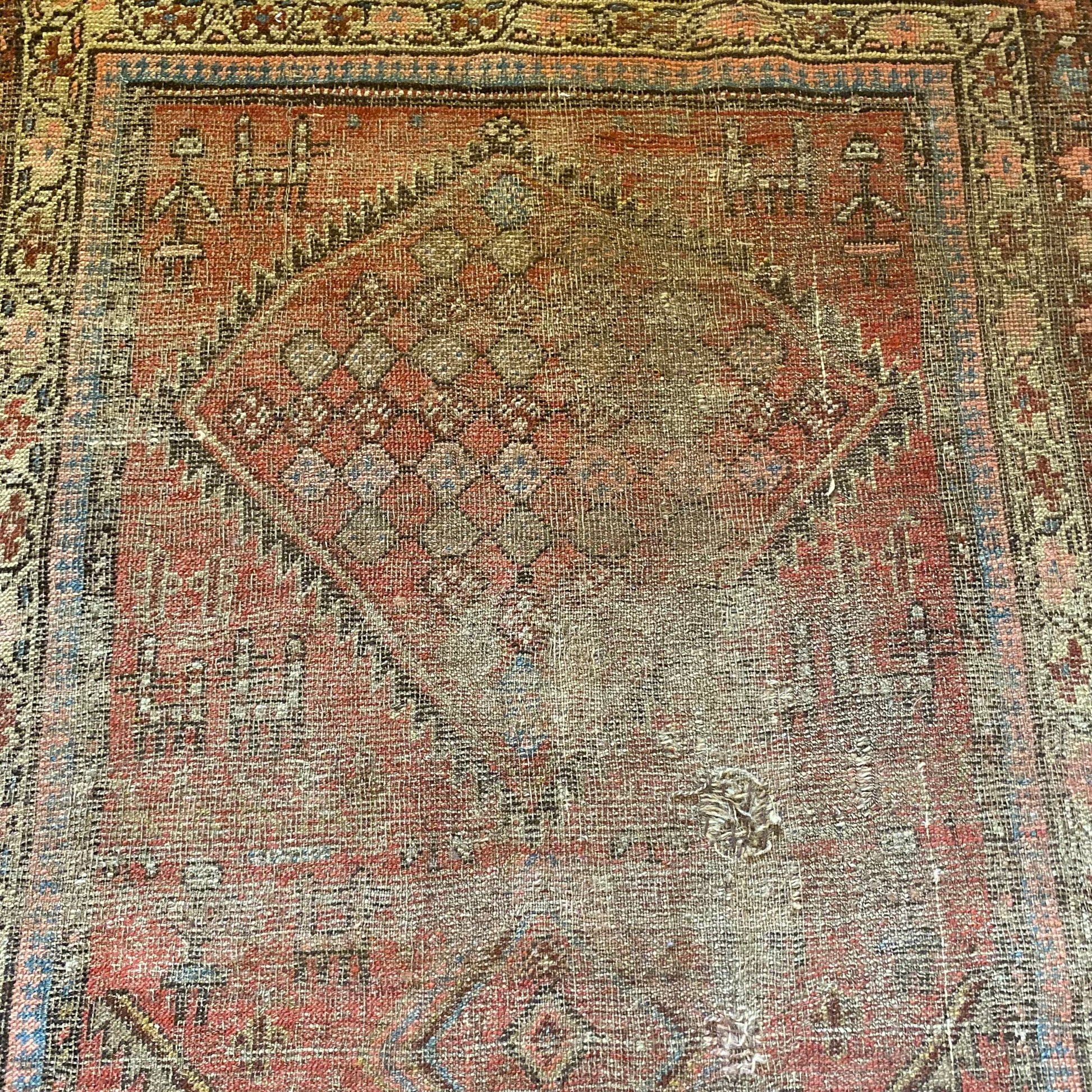 This antique rug is in fair condition. The design features a tribal pattern set in a red field with brown and blue highlights. There is heavy wear throughout as seen in the photos.