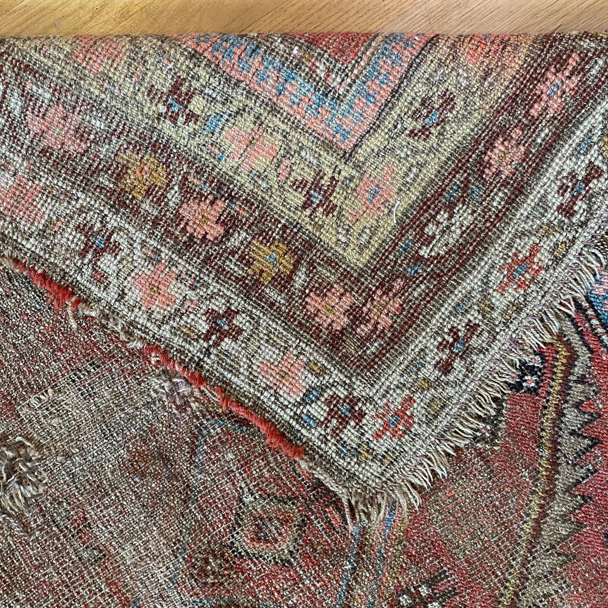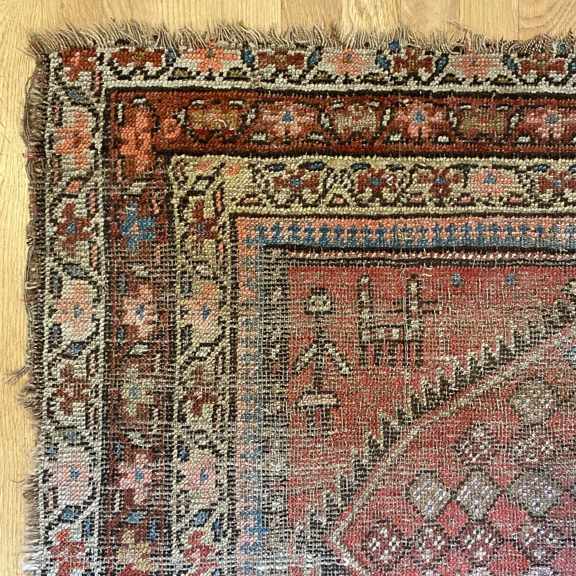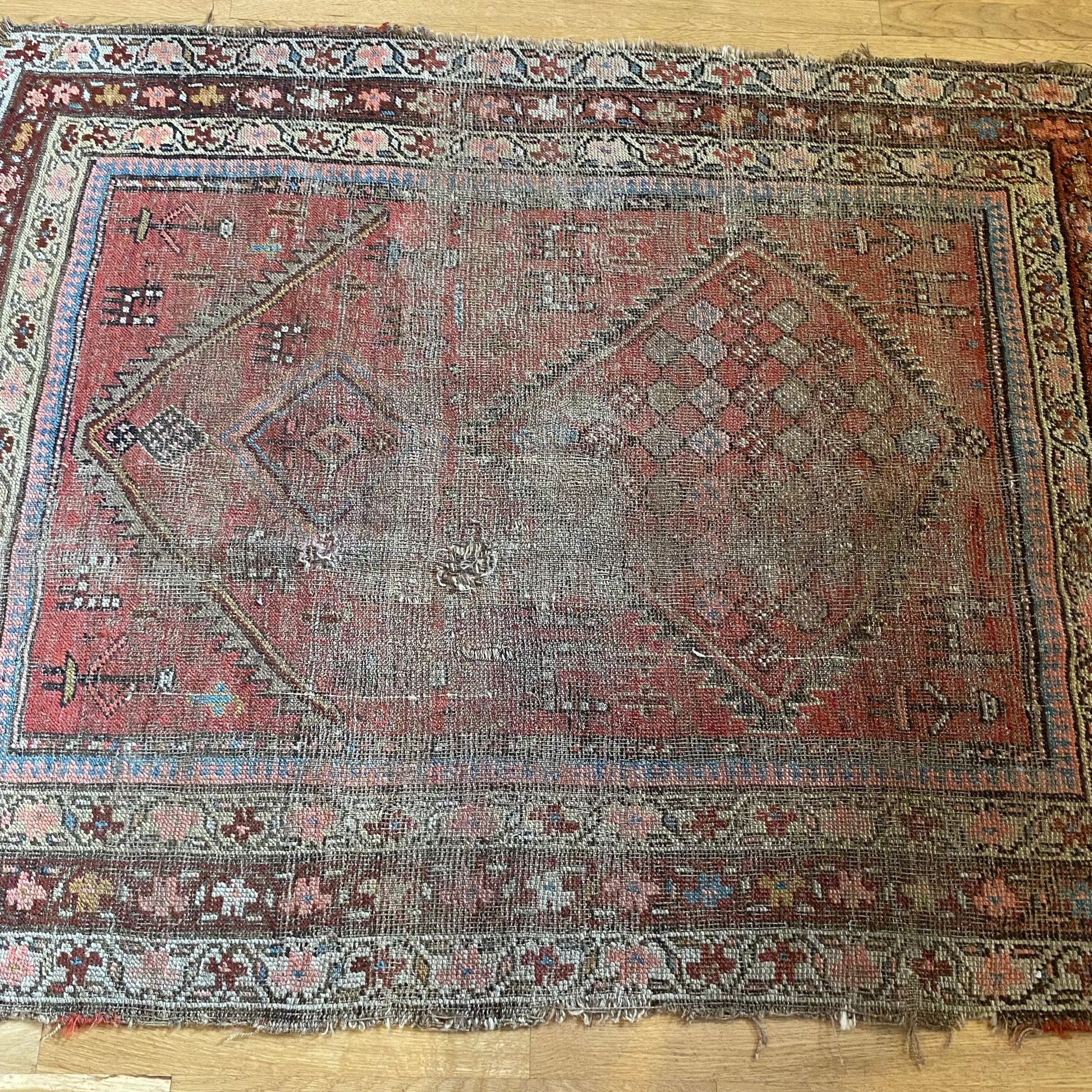 This antique rug is in fair condition. The design features a tribal pattern set in a red field with brown and blue highlights. There is heavy wear throughout as seen in the photos.