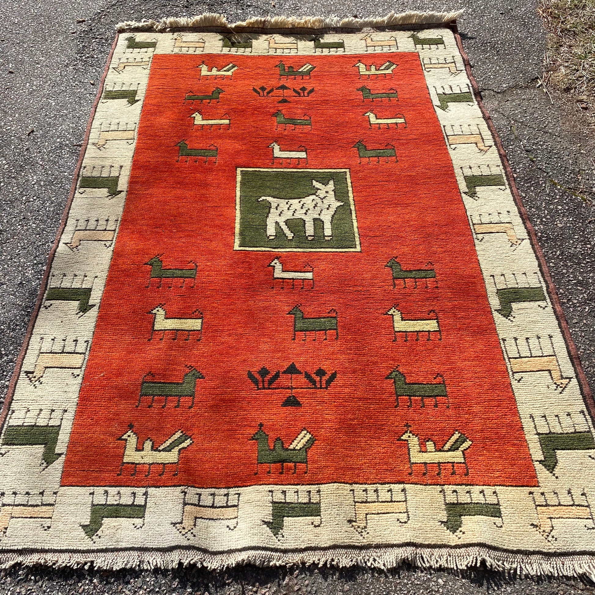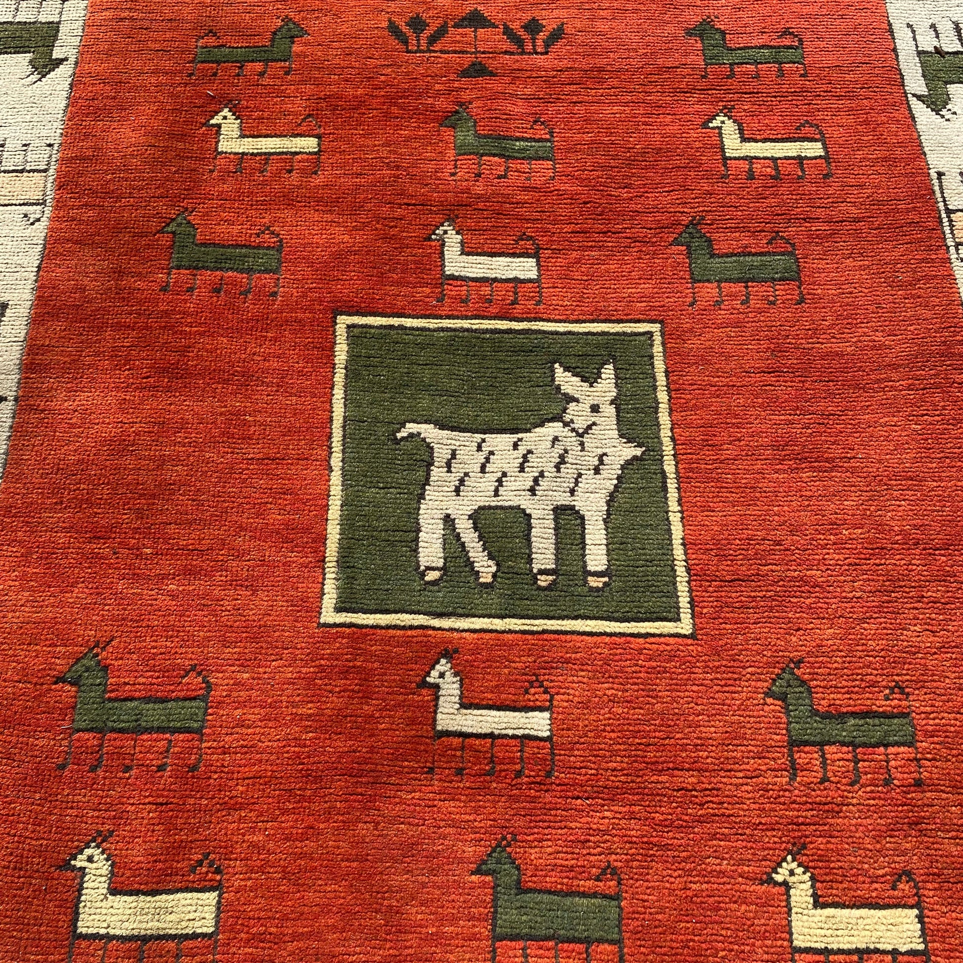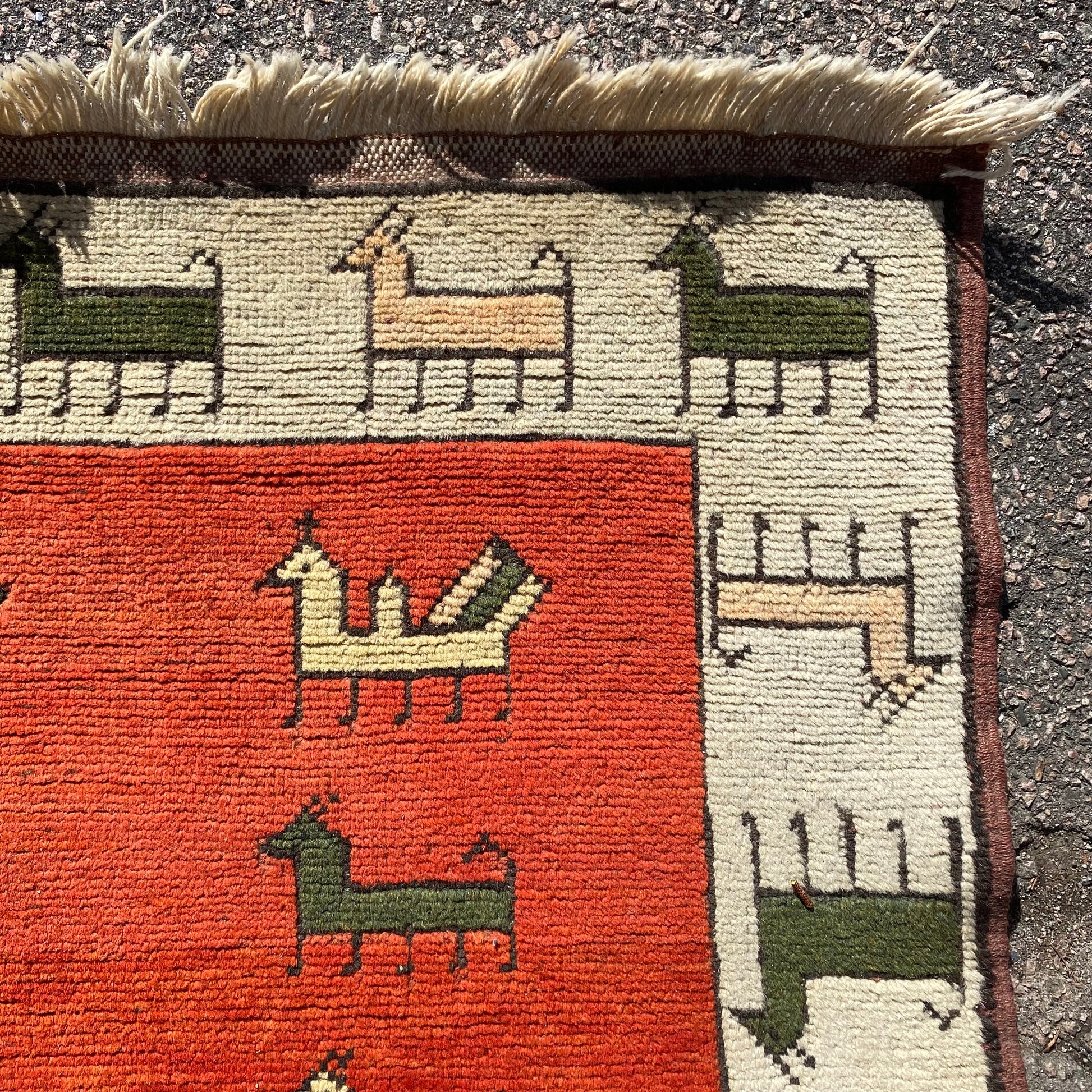 This vintage rug is in very good condition. The design features animal motifs set in an orange field with white and green highlights. There is even wear throughout.