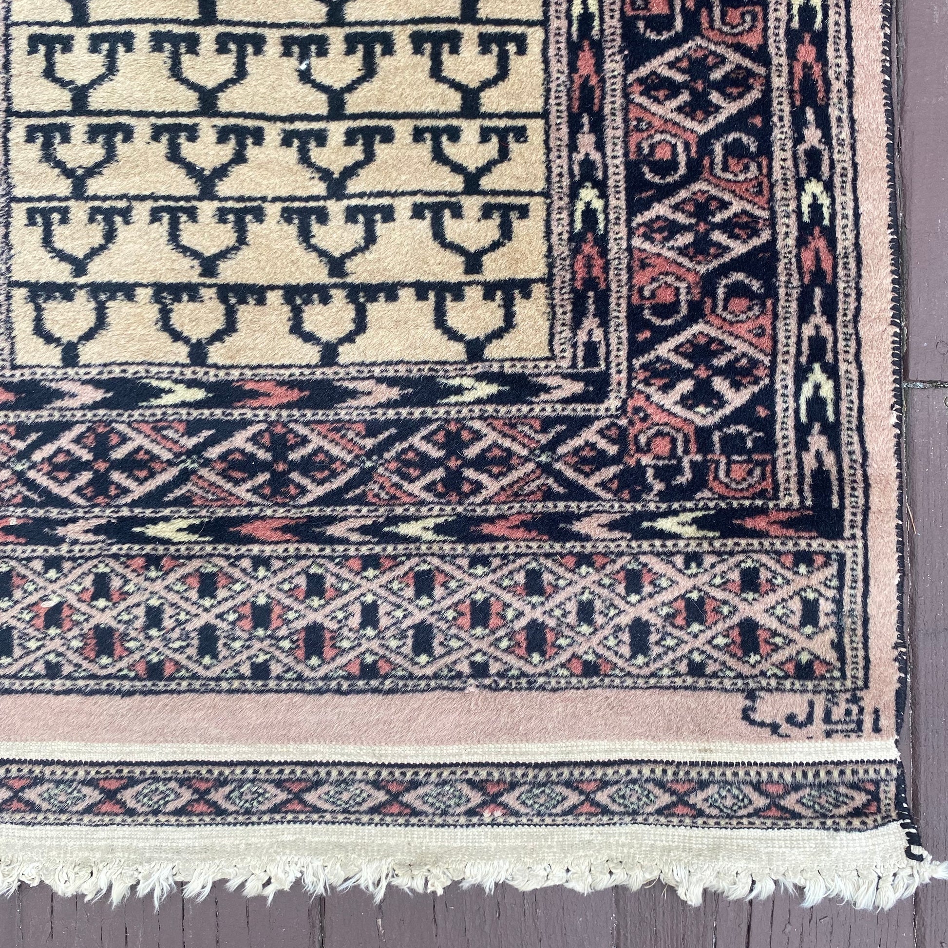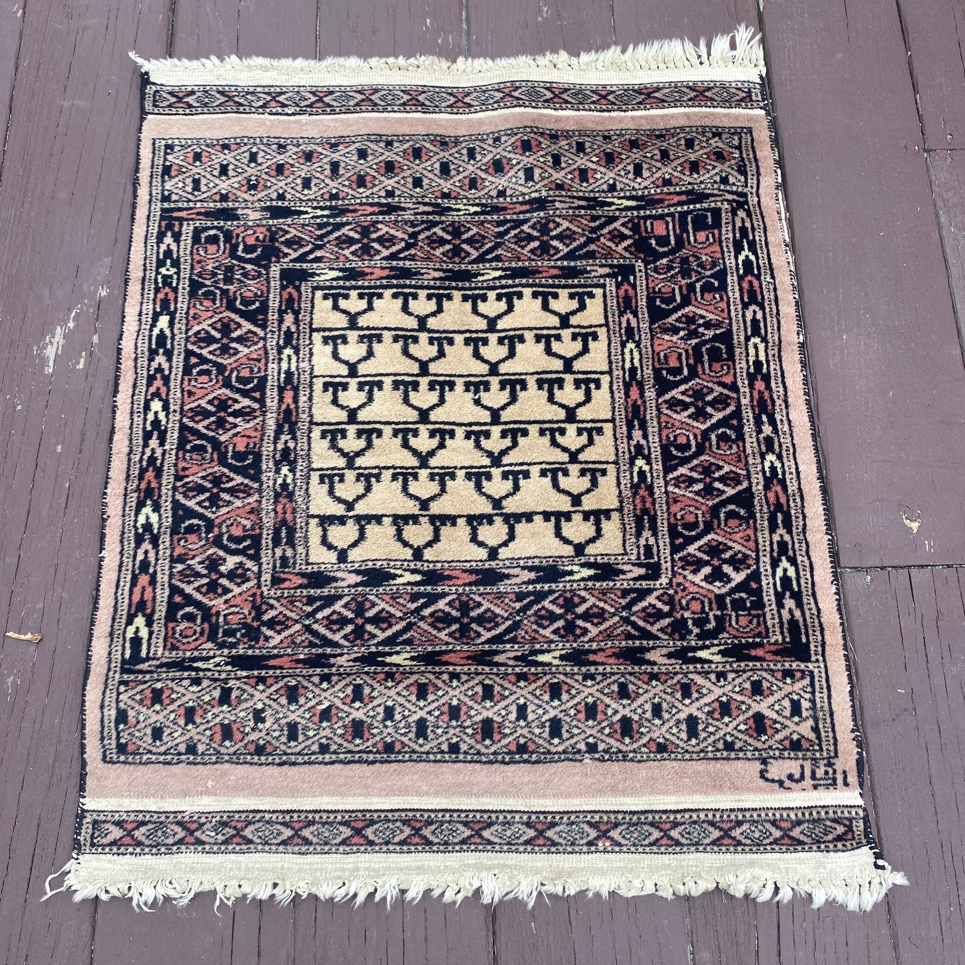 This vintage rug is in good condition. The design features an all-over pattern set in a cream field with navy and grey highlights. There is a signature in the corner. There is even wear throughout.
