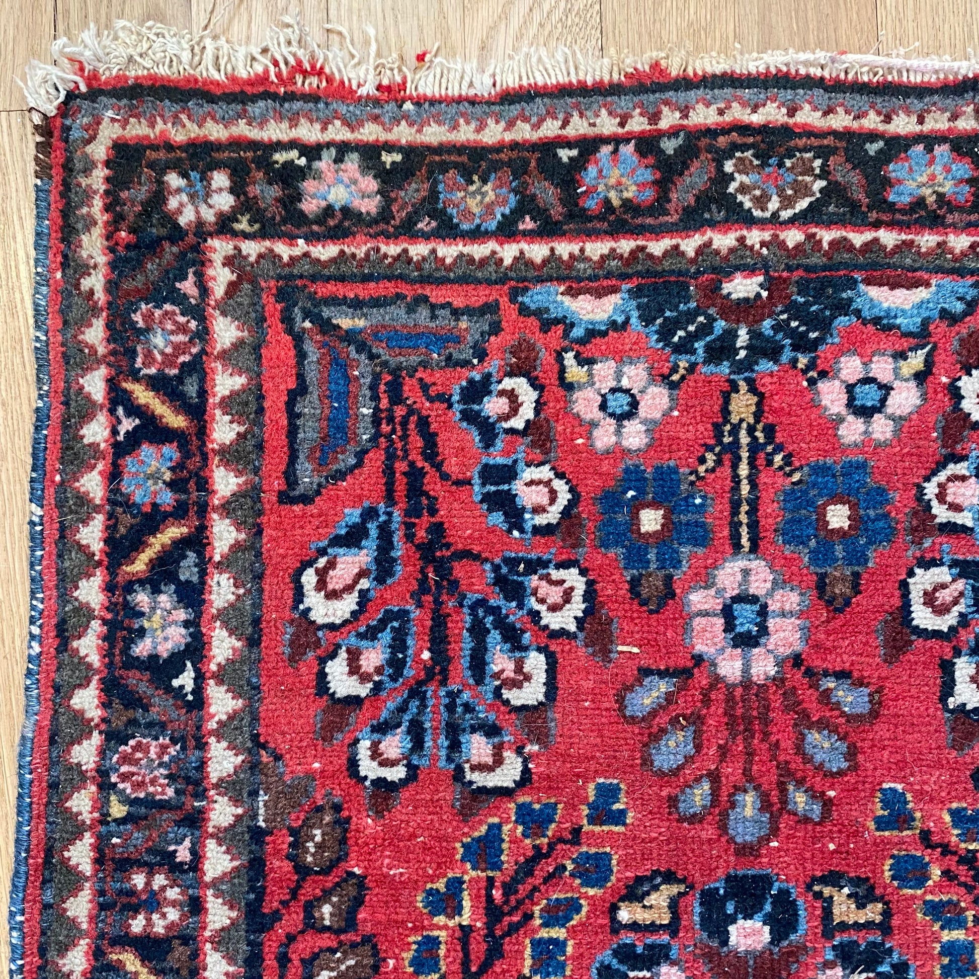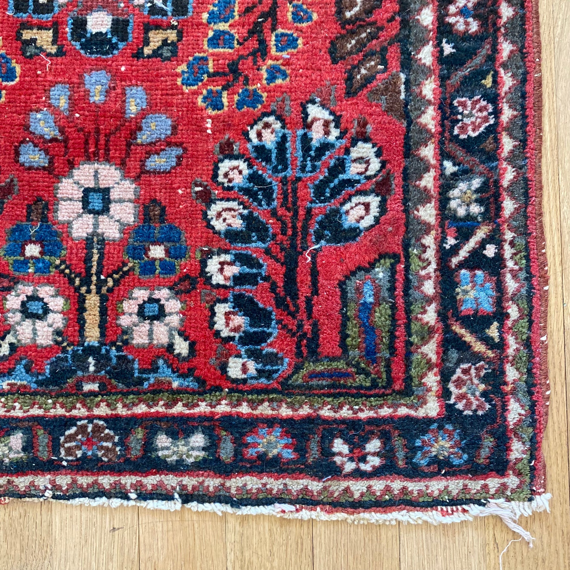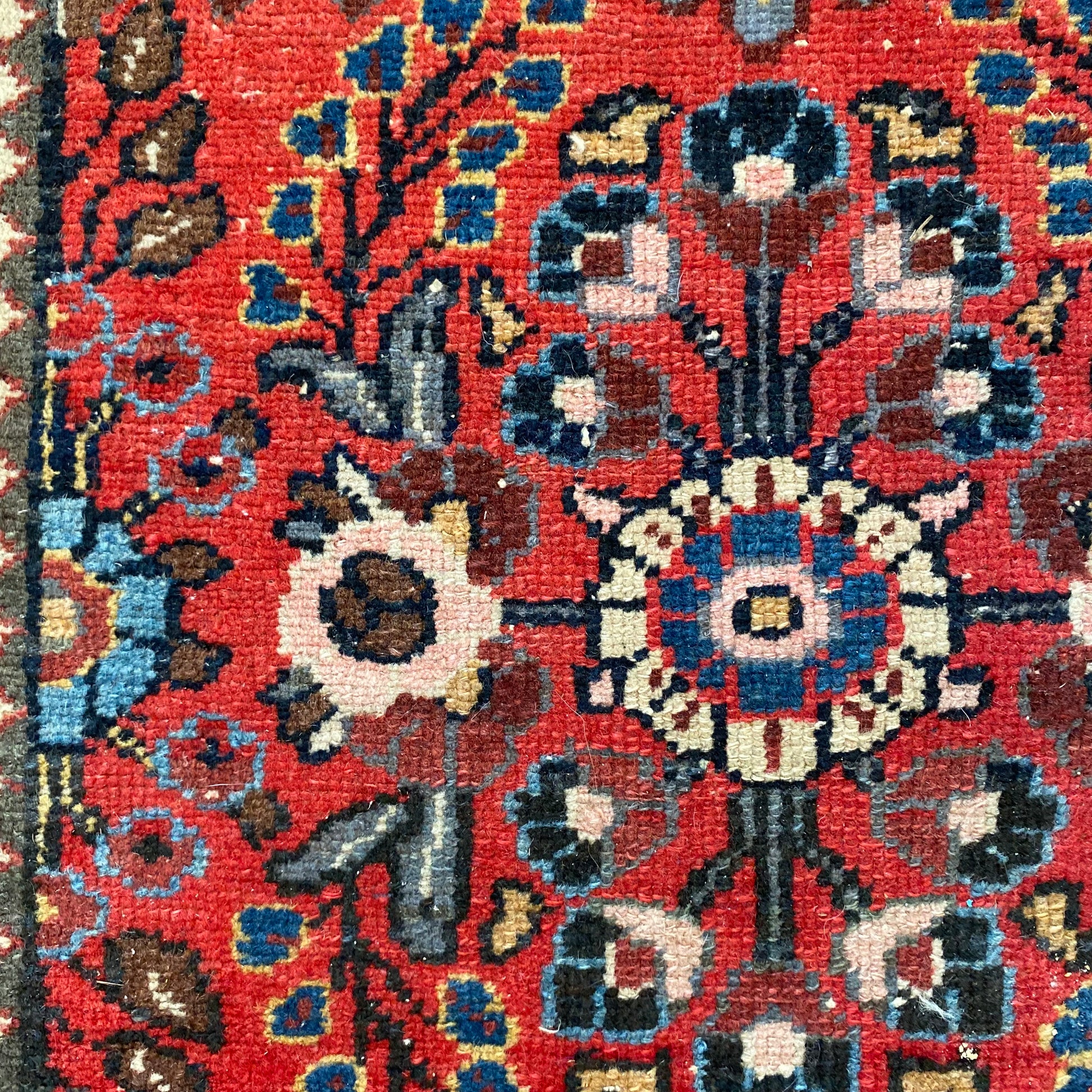 This vintage rug is in good condition. The design features a floral pattern set in a red field with blue and white highlights. There is even wear throughout.