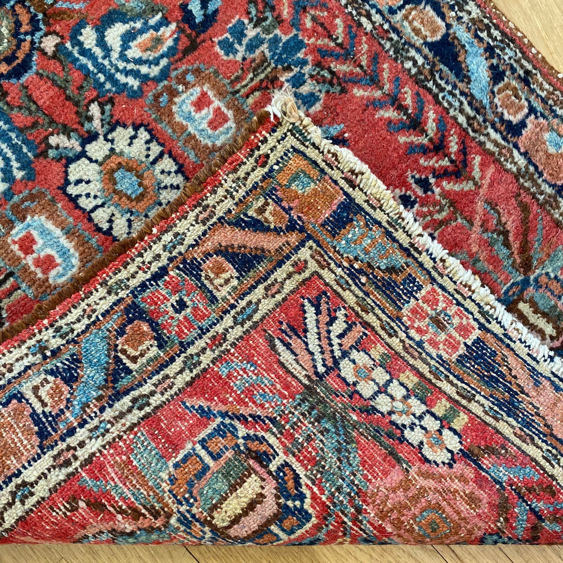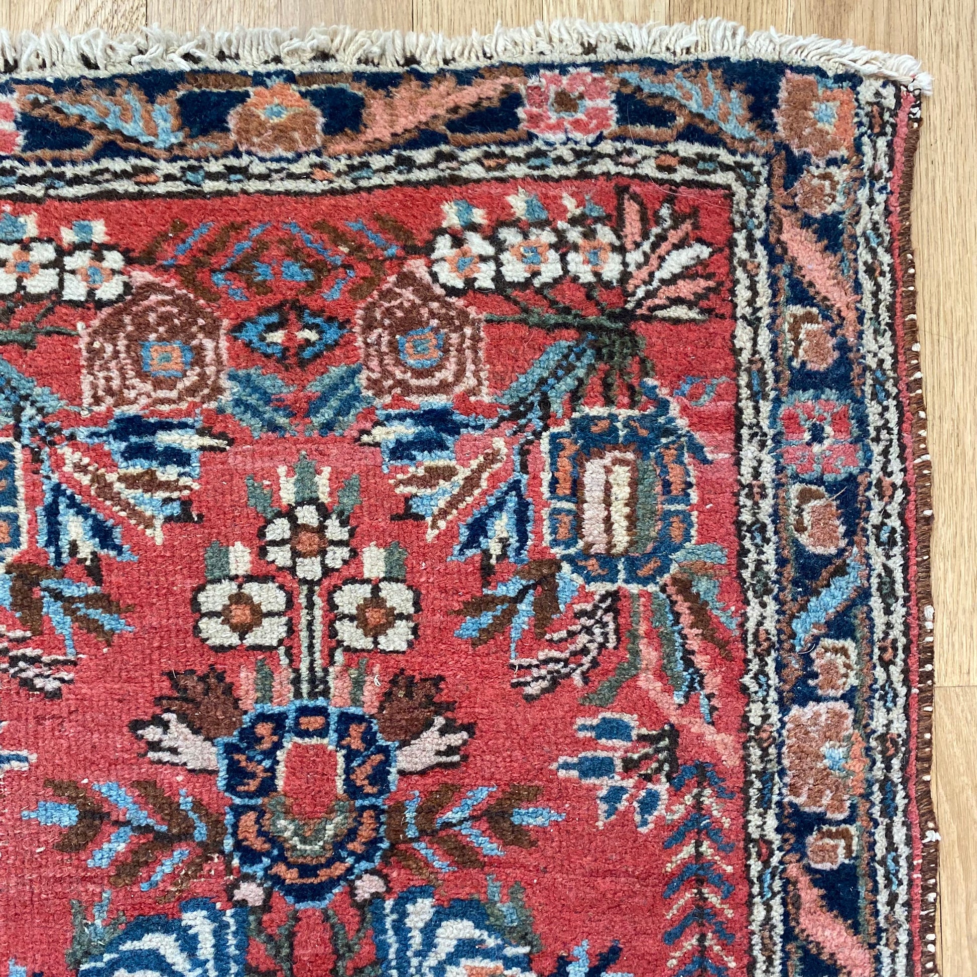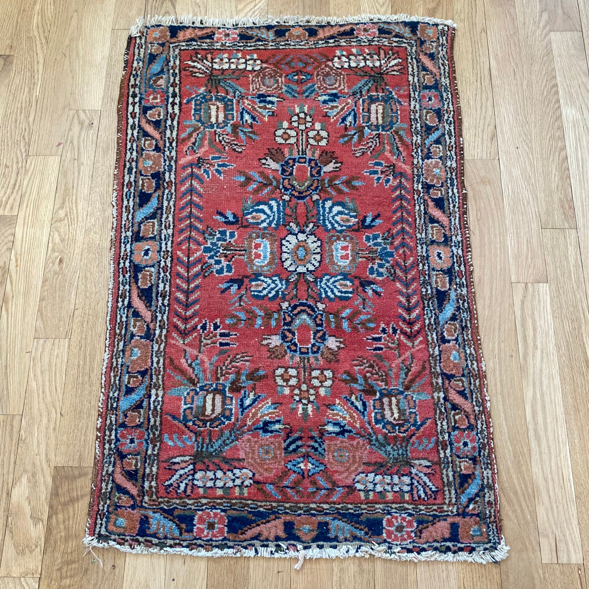 This vintage rug is in good condition. The design features a floral pattern set in a red field with blue and cream highlights. There is even wear throughout.