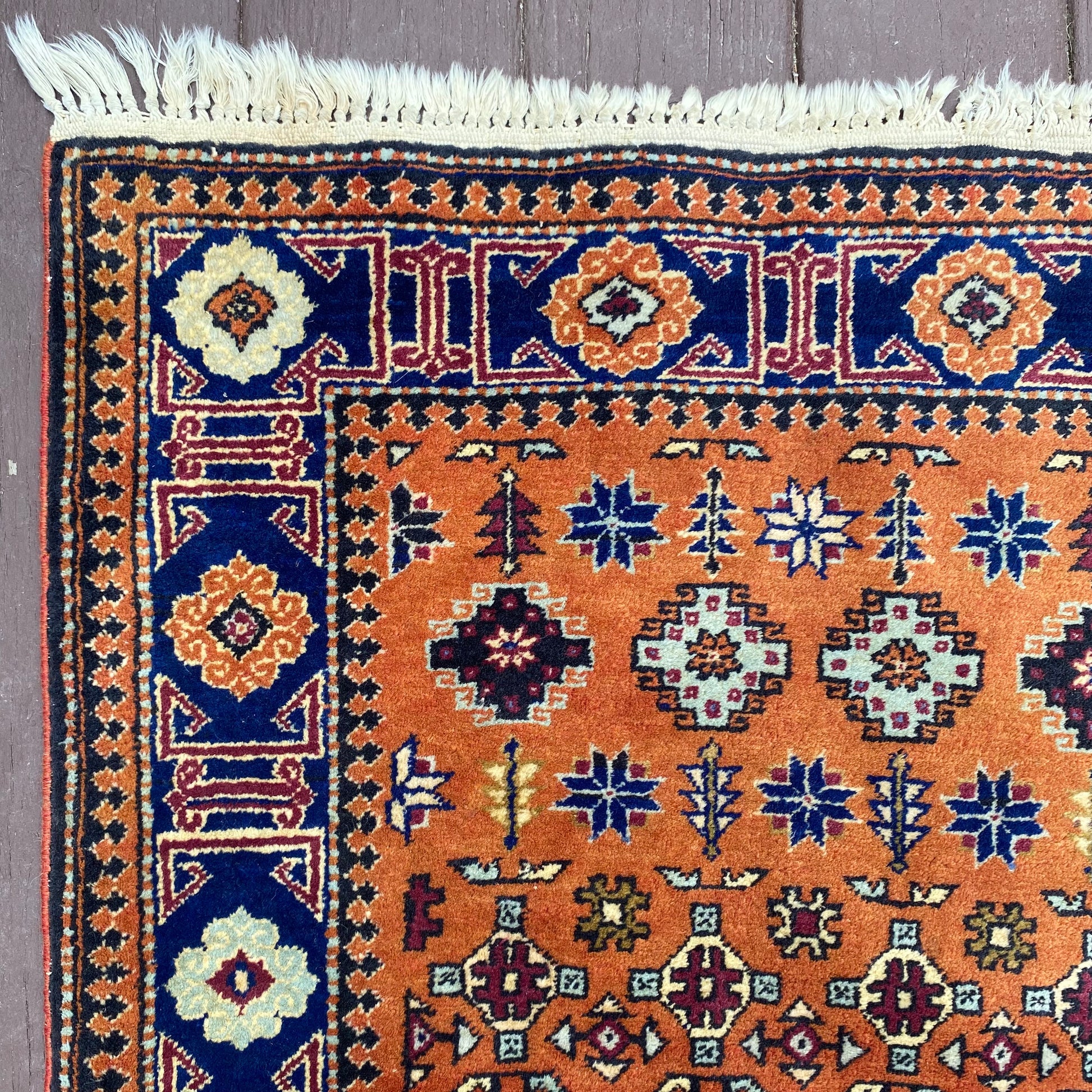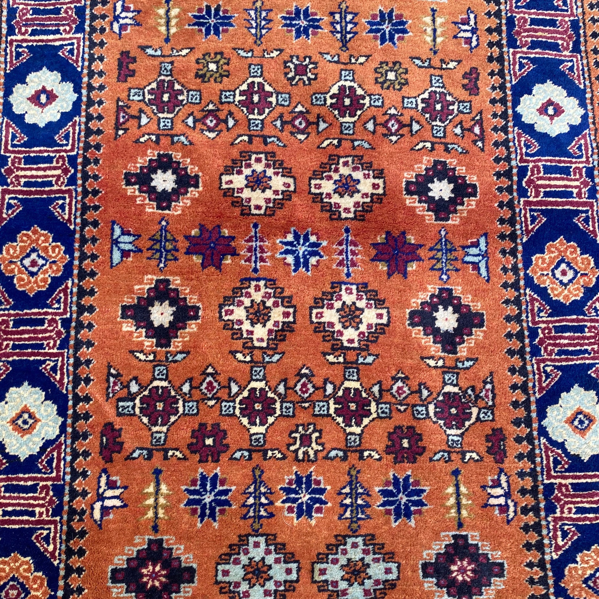 This vintage rug is in good condition. The design features an all-over tribal pattern set in an orange-brown field with blue and white highlights. There is light wear throughout as seen in the photos.