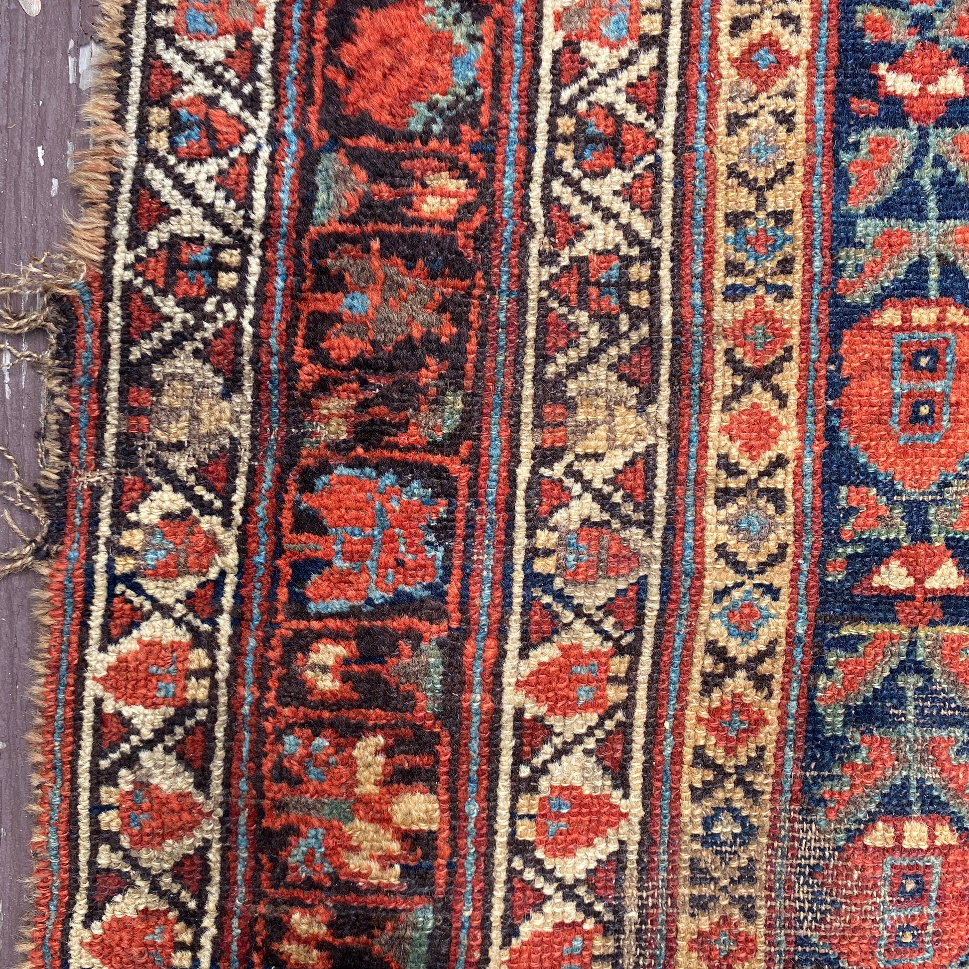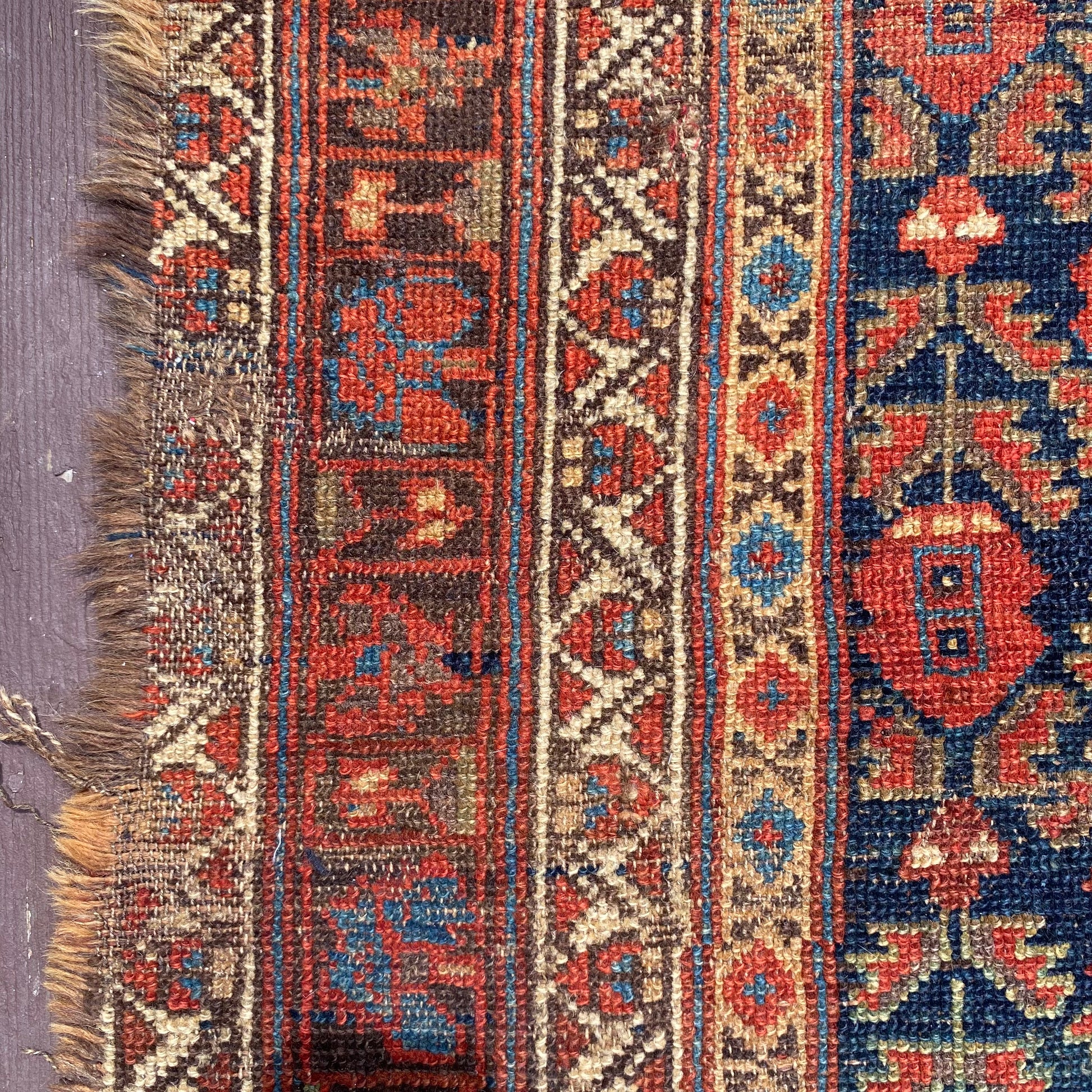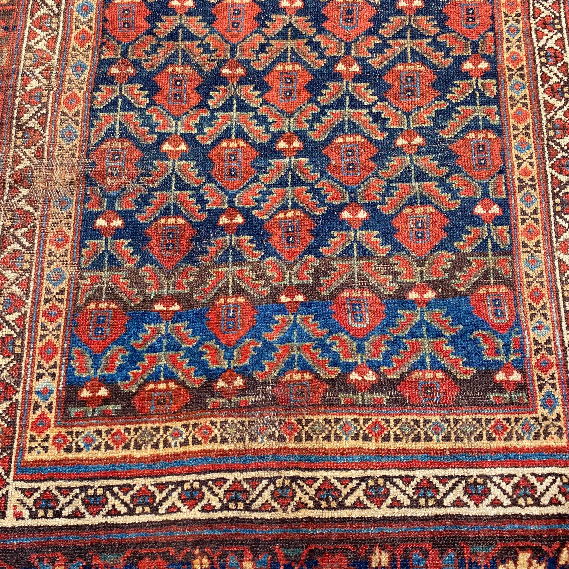 This vintage rug is in good condition. The design features an all-over tribal pattern set in a blue field with red brown and brown highlights. There is heavy wear throughout as seen in the photos.
