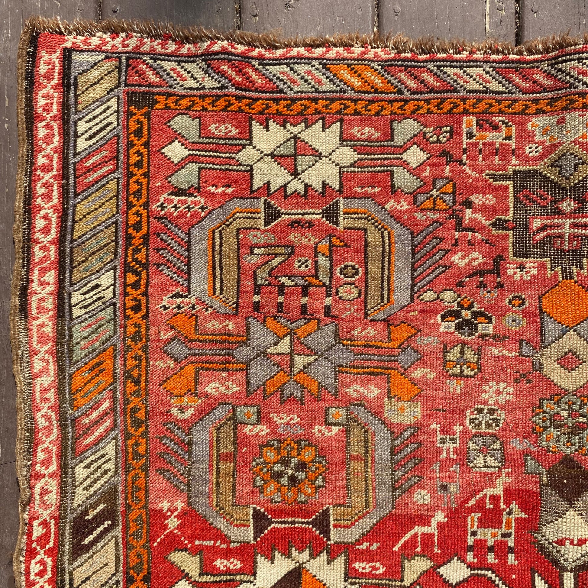 This vintage rug is in fair condition. The design features an all-over tribal pattern set in an orange field with red, brown and white highlights. There is moderate wear throughout and a couple of minor repairs as seen in the photos.