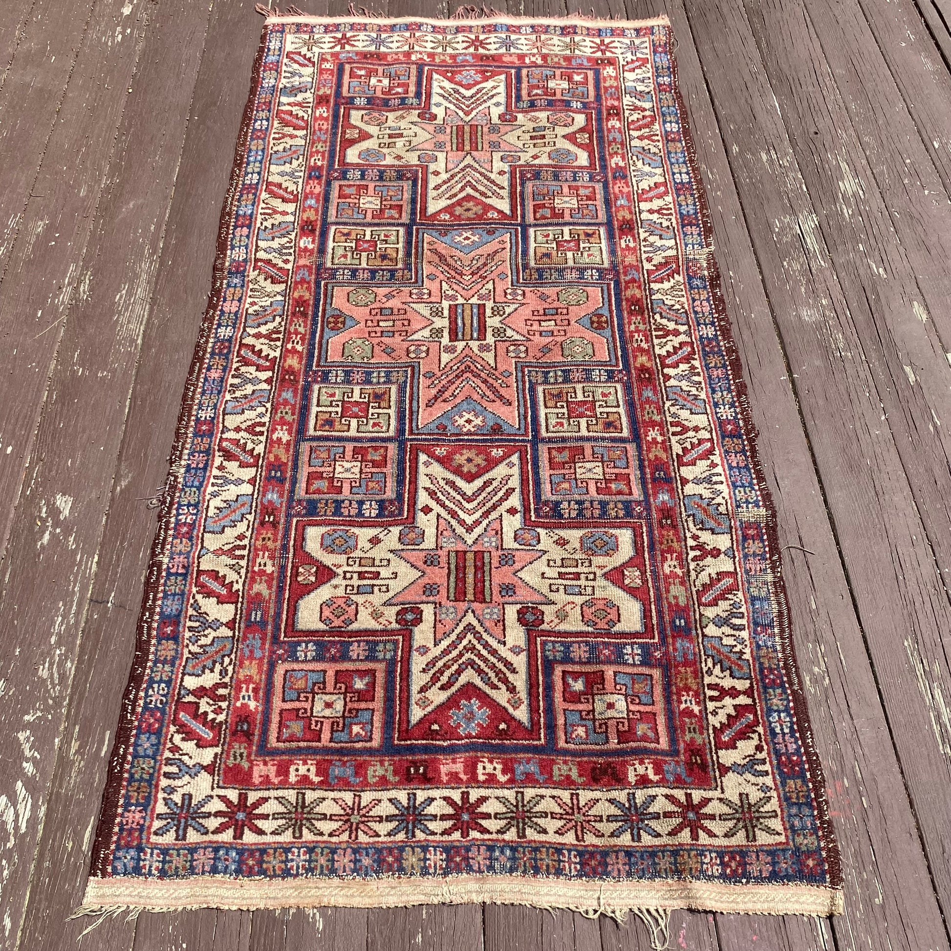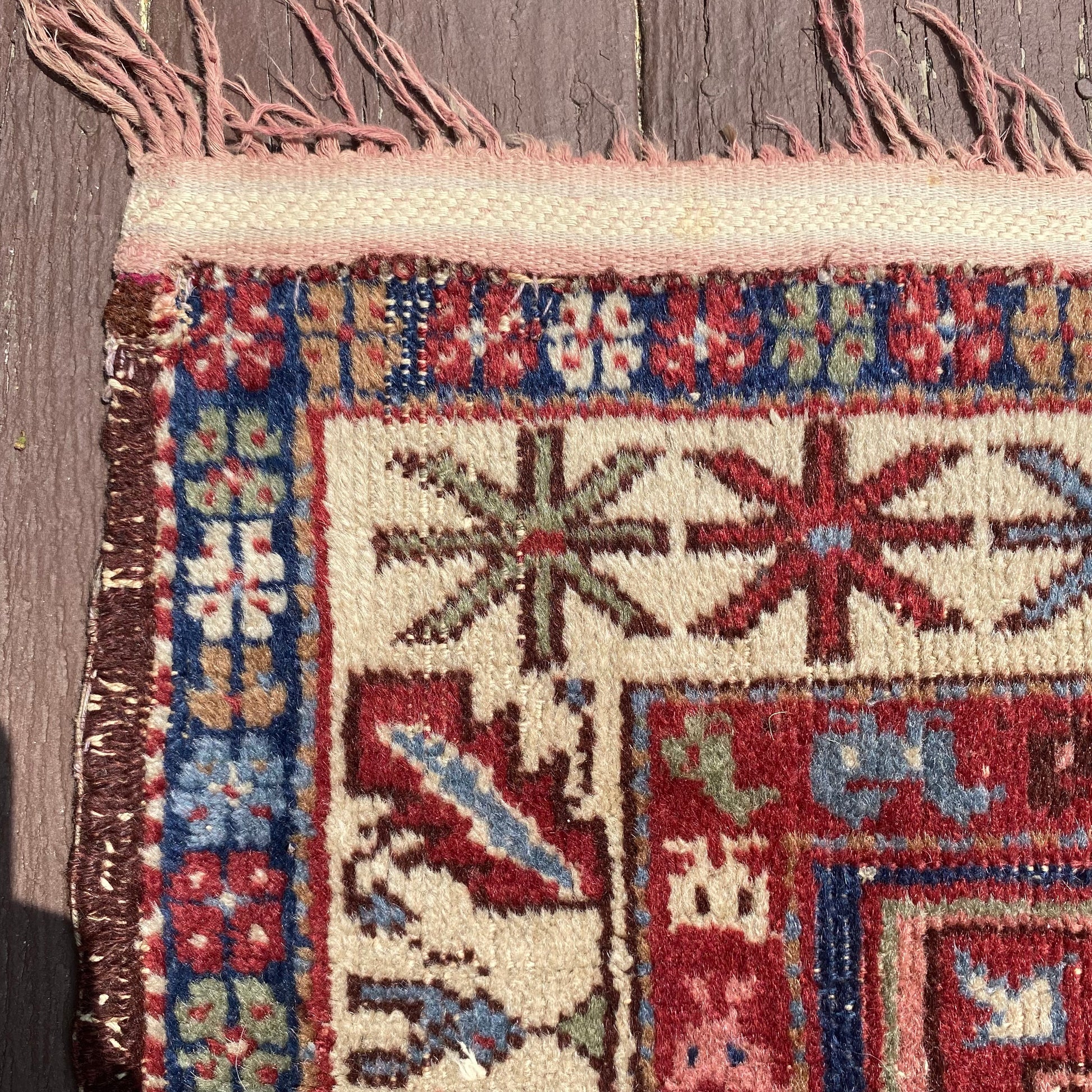This vintage rug is in good condition. The design features a tribal pattern set in a red field with blue and white highlights. There is wear throughout as seen in the photos.