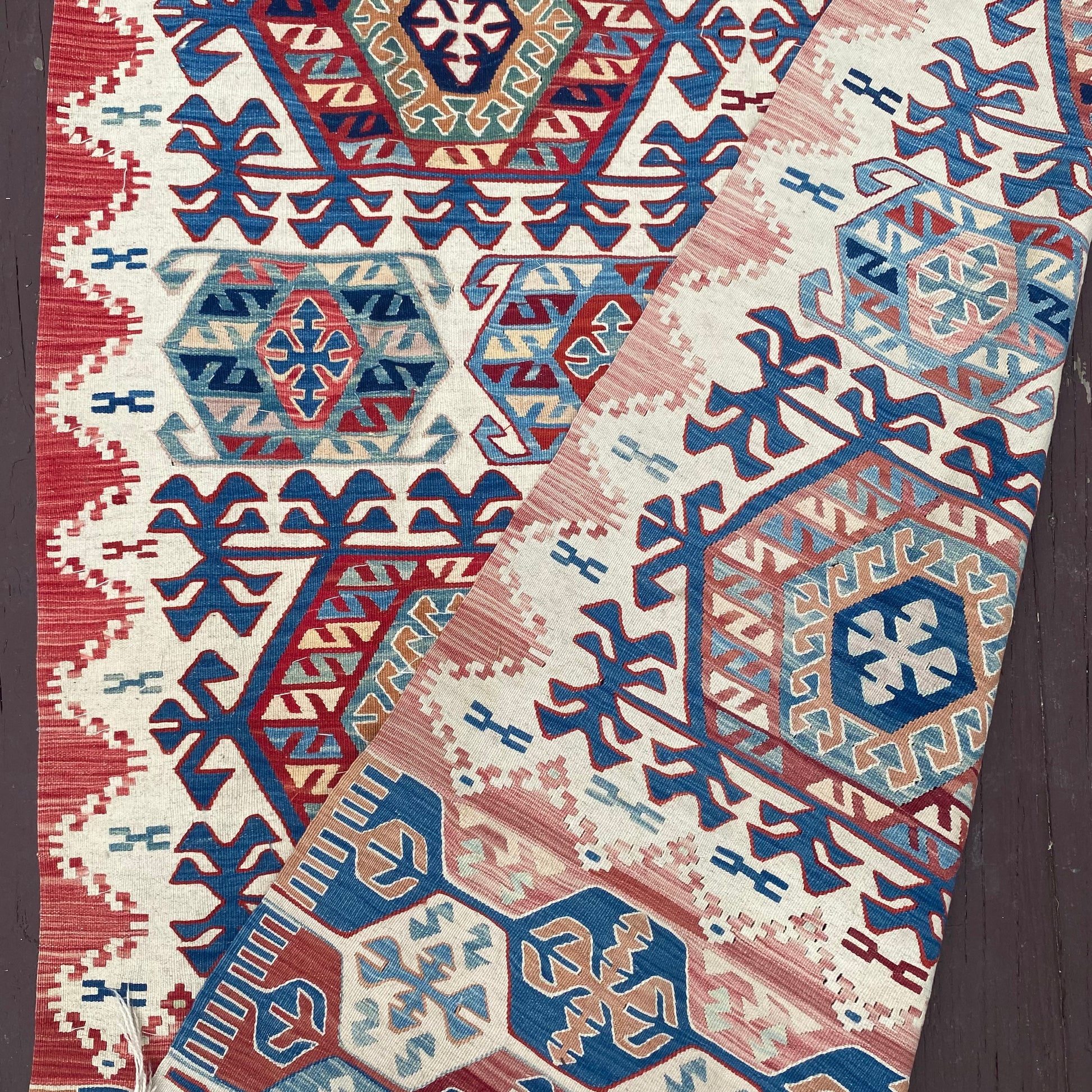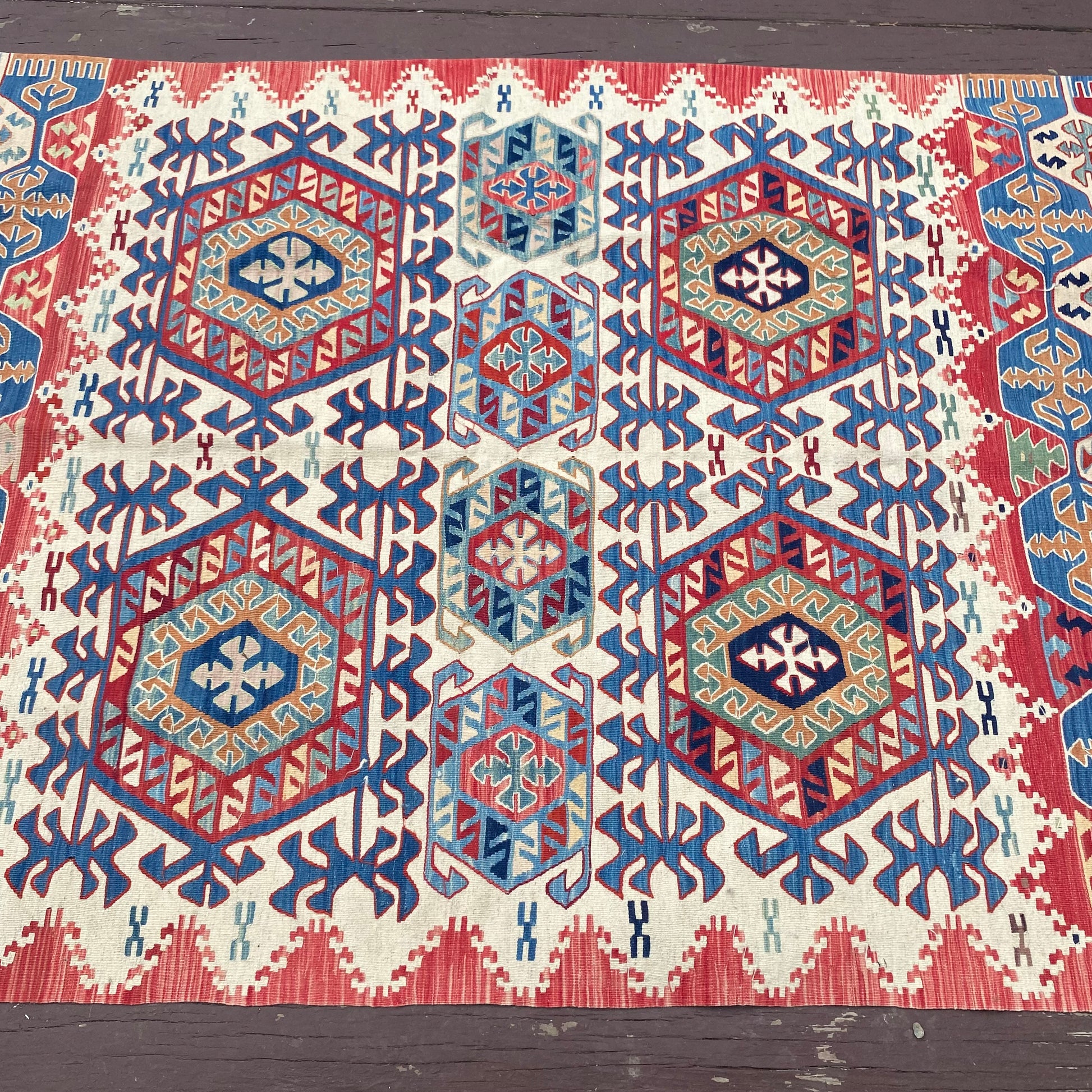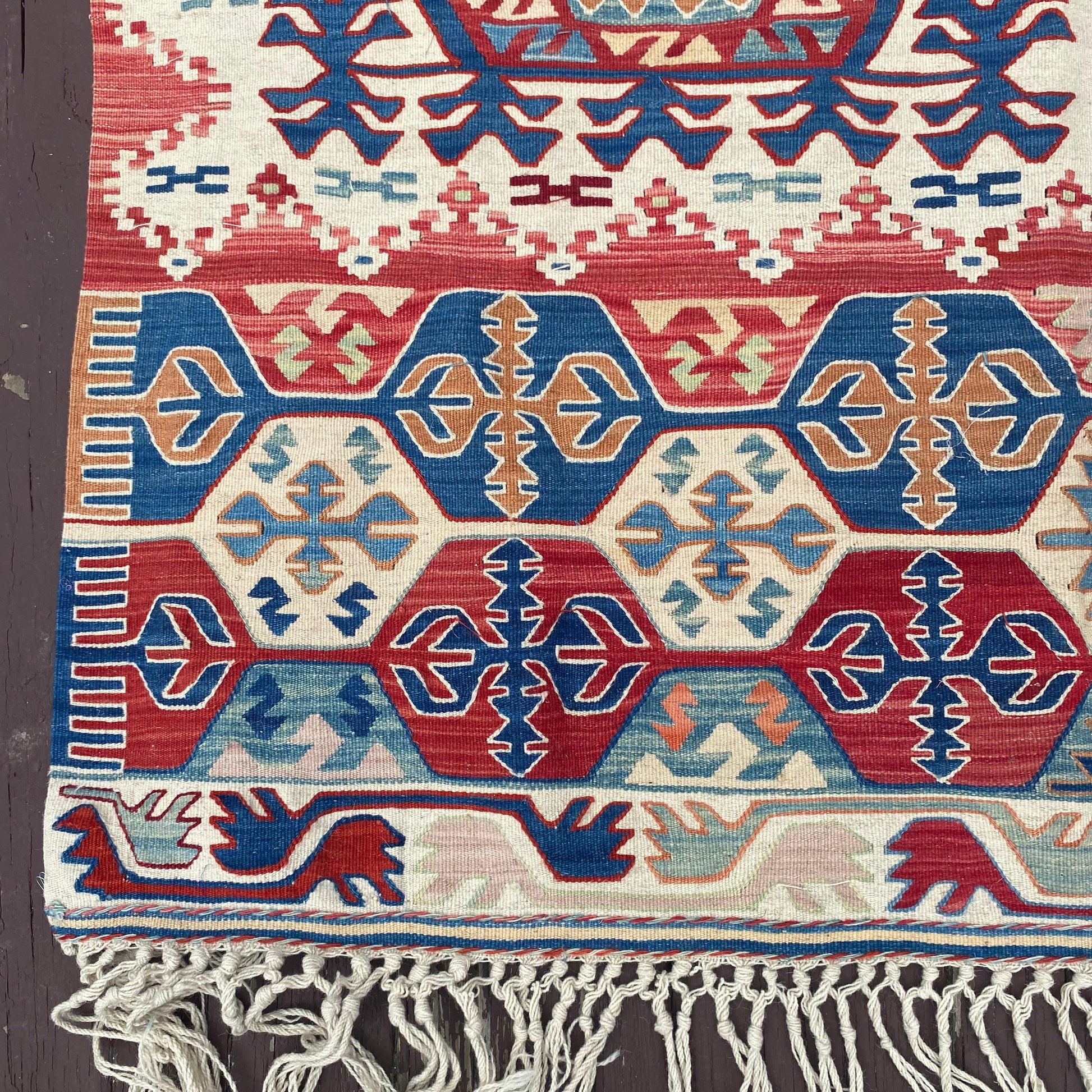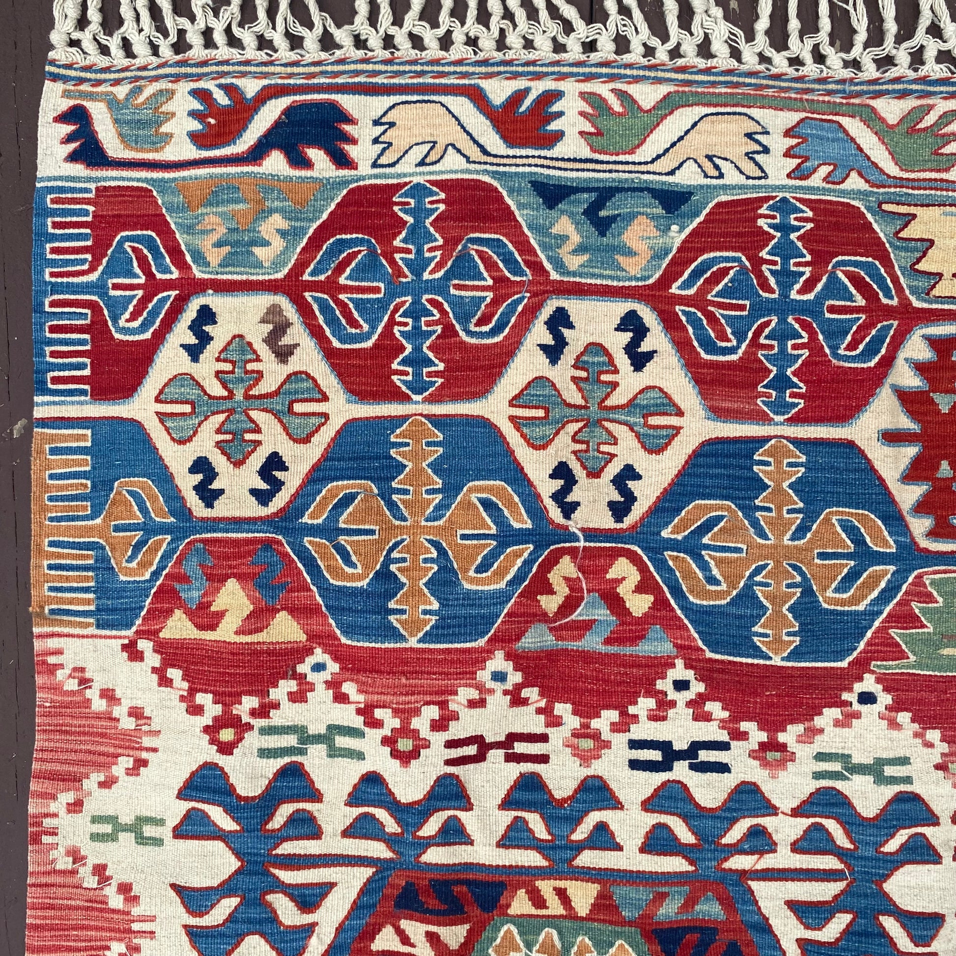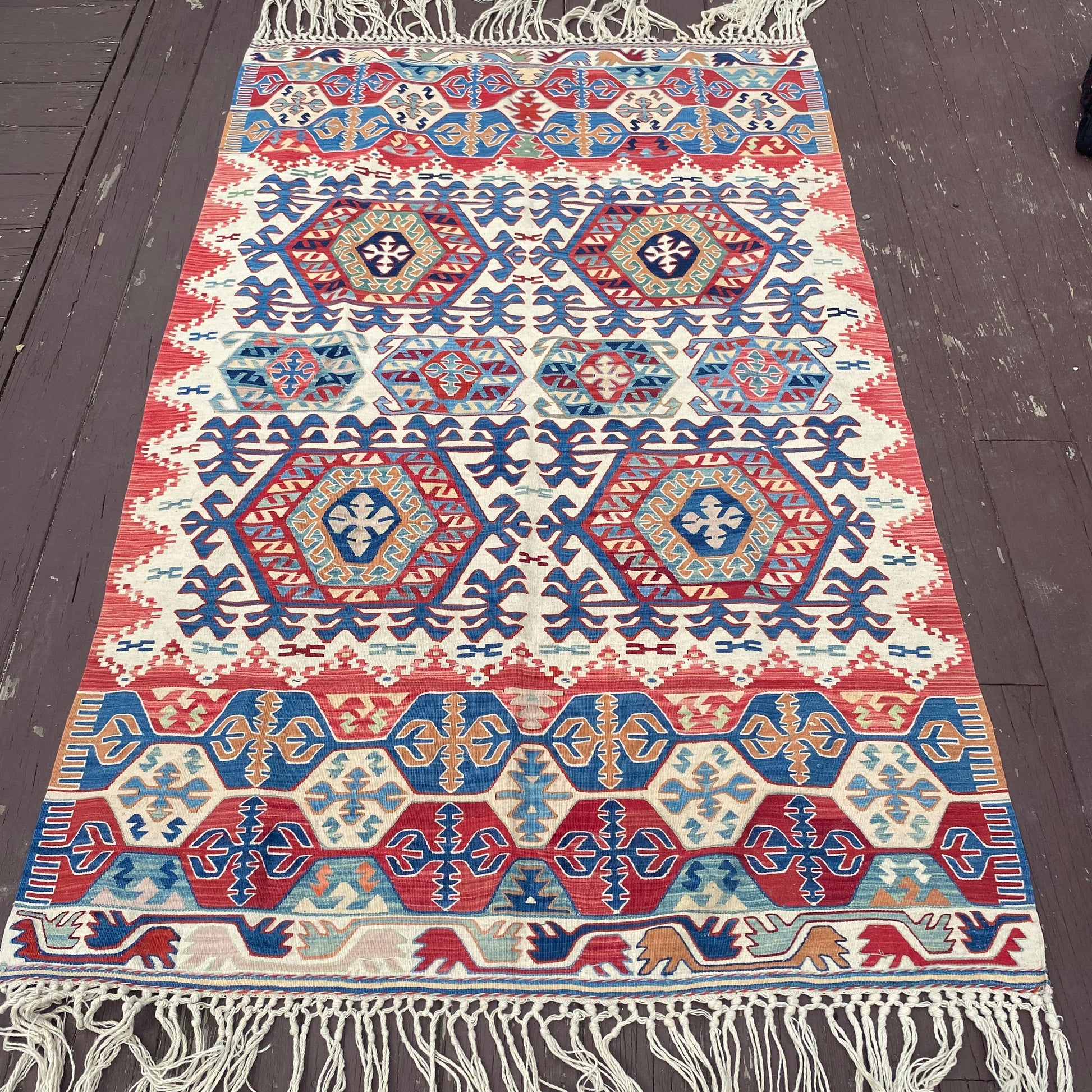 This vintage rug is in good condition. The design features a tribal pattern set in a white field with red and blue highlights. There are a few minor blemishes and some fading throughout as seen in the photos. The size measurement does not include the fringe ends.