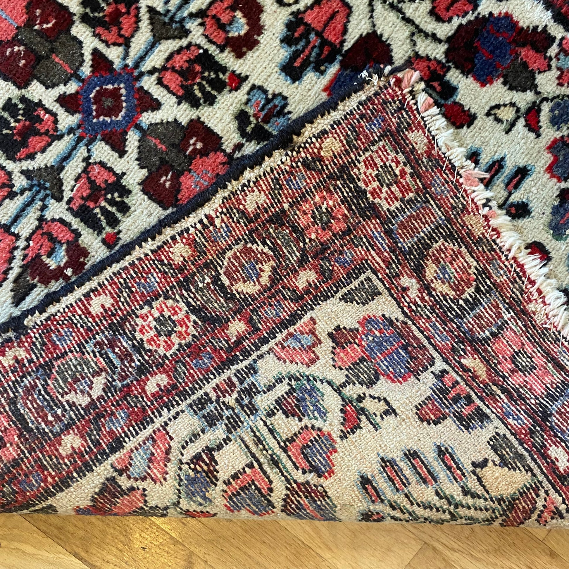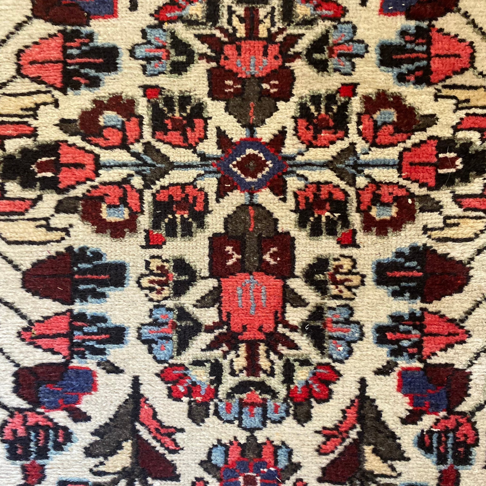 This vintage rug is in good condition. The design features an all-over floral pattern set in a white field with blue, pink and brown highlights. There is even wear throughout and some wear at the fringe ends as seen in the photos.