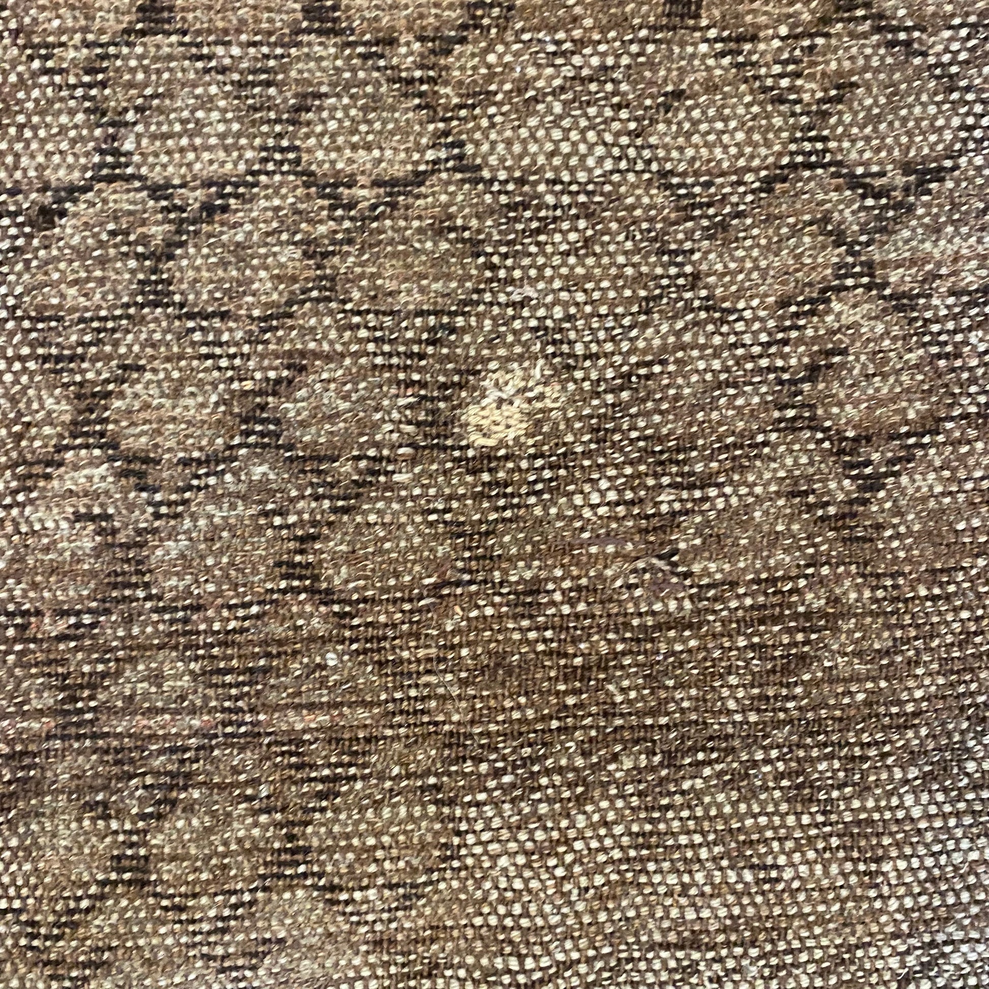 This vintage rug is in fair condition. The design features an all-over pattern set in a brown field with cream and beige highlights. There is heavy wear on the edges, fringe ends and throughout. There are some minor repairs in the field as seen in the photos.