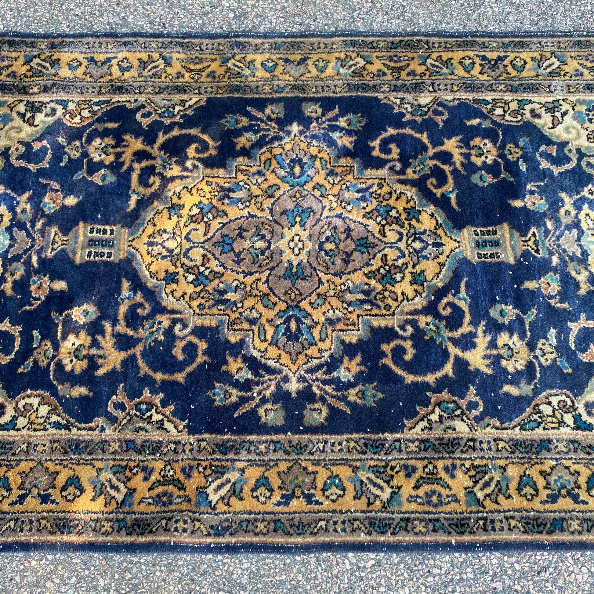 This vintage rug is in good condition. The design features a central medallion set in a blue field with yellow and cream highlights. There is wear throughout as seen in the photos.