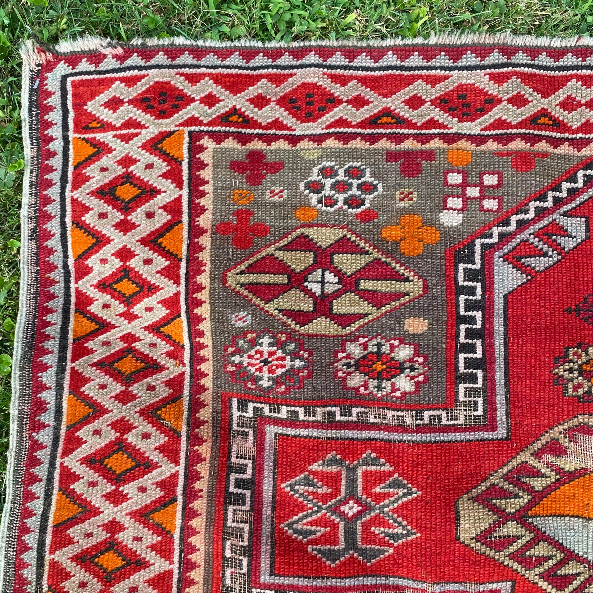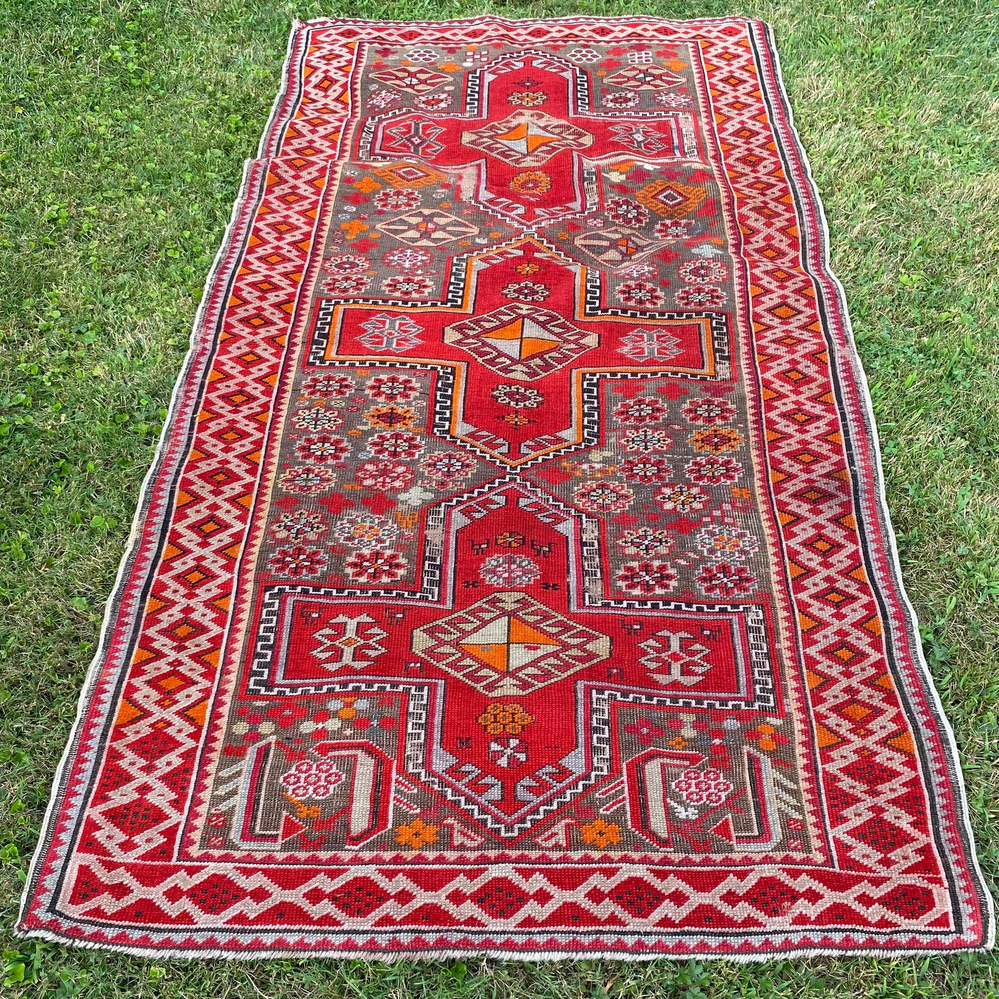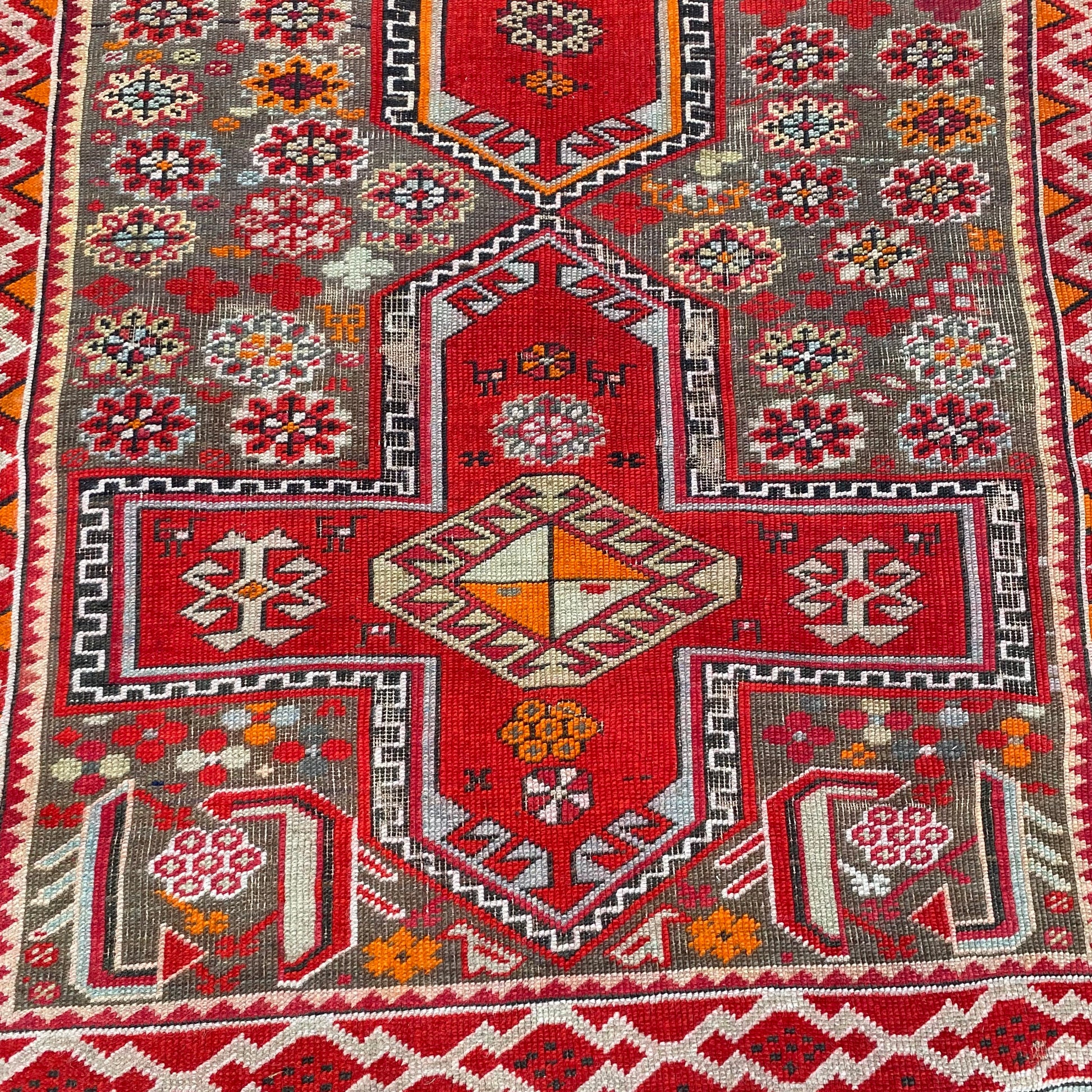 This vintage rug is in good condition. The design features a tribal pattern set in a grey brown field with red and orange highlights. There is wear throughout as seen in the photos.