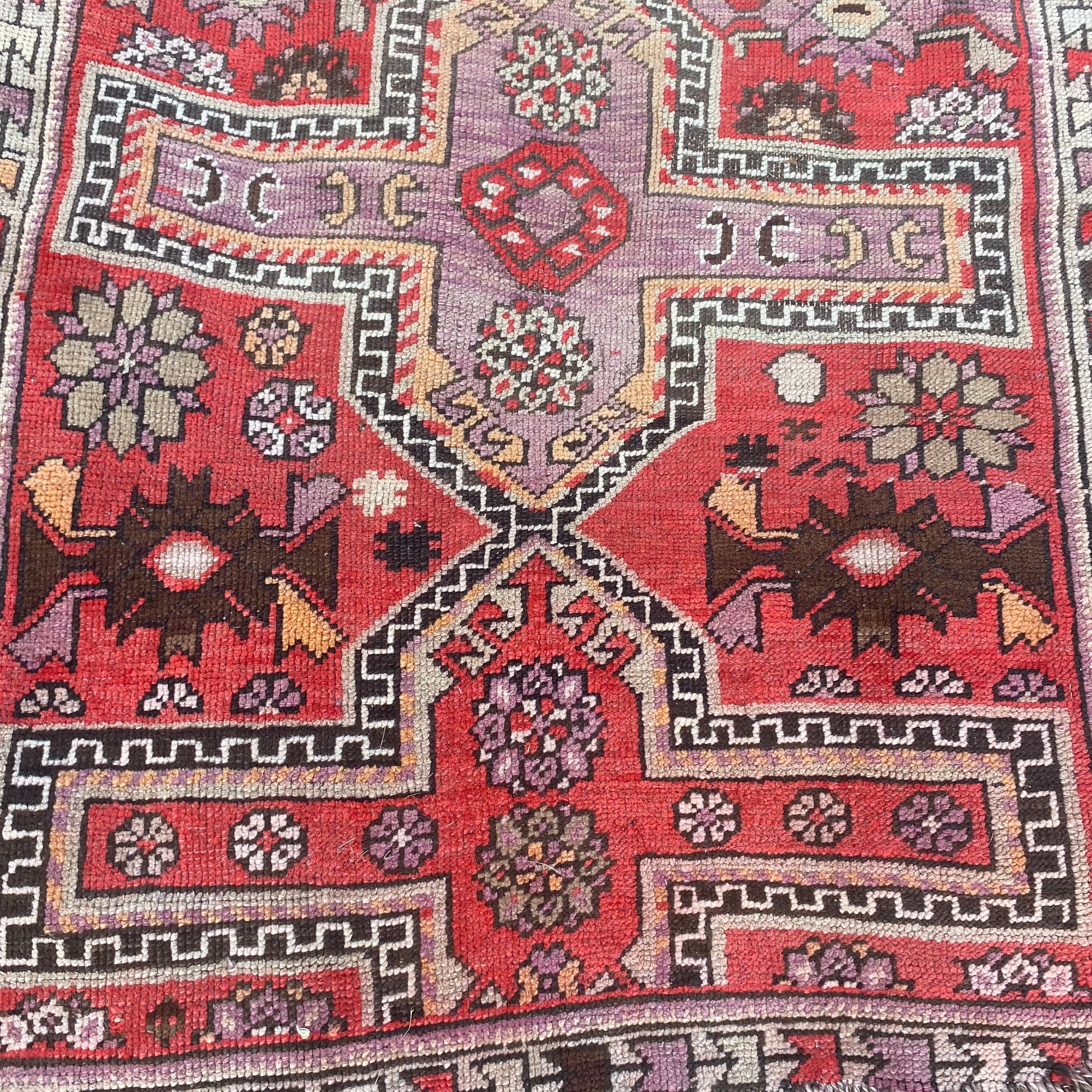 This vintage rug is in fair condition. The design features a tribal pattern set in a red field with brown and cream highlights. There is wear throughout.