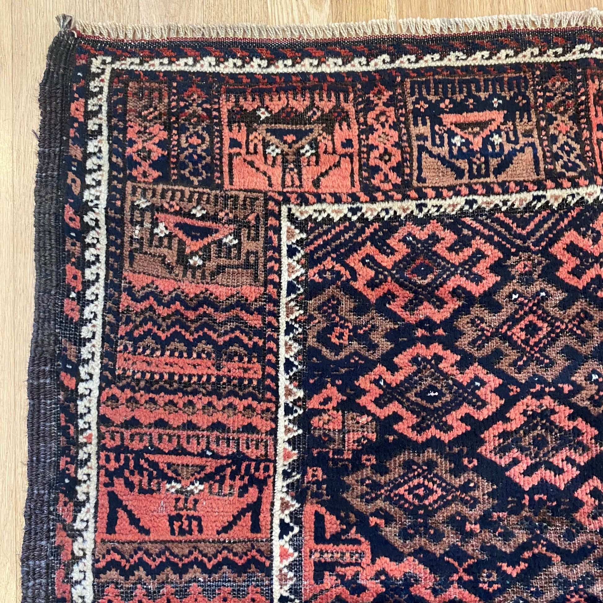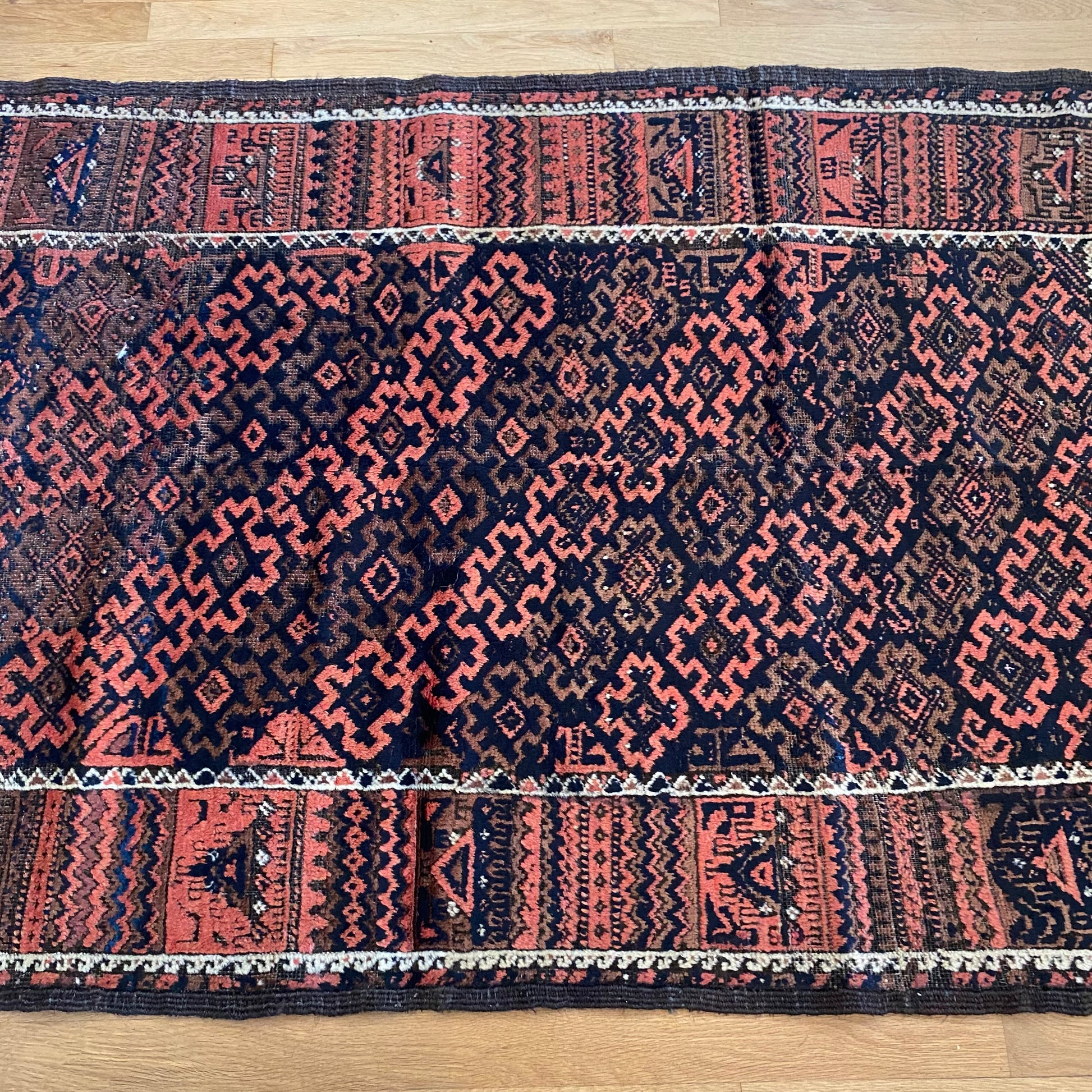 This vintage rug is in good condition. The design features an all-over tribal pattern set in a brown field with blue, red-brown and white highlights. There is wear on the edges, fringe ends and throughout.