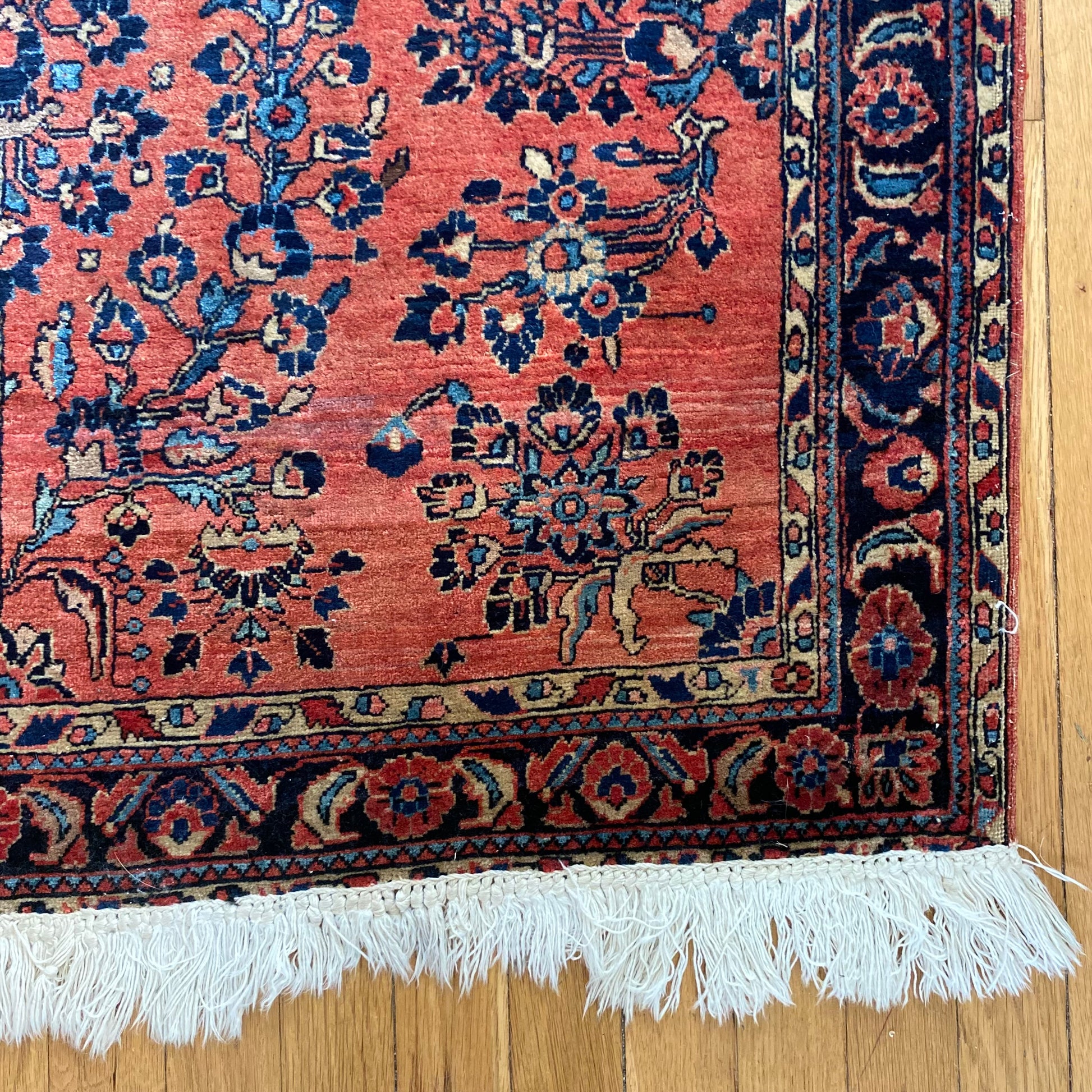 This vintage rug is in good condition. The design features an all-over floral pattern set in a pink field with blue and tan highlights. The fringe ends are not original and there is wear throughout as seen in the photos.