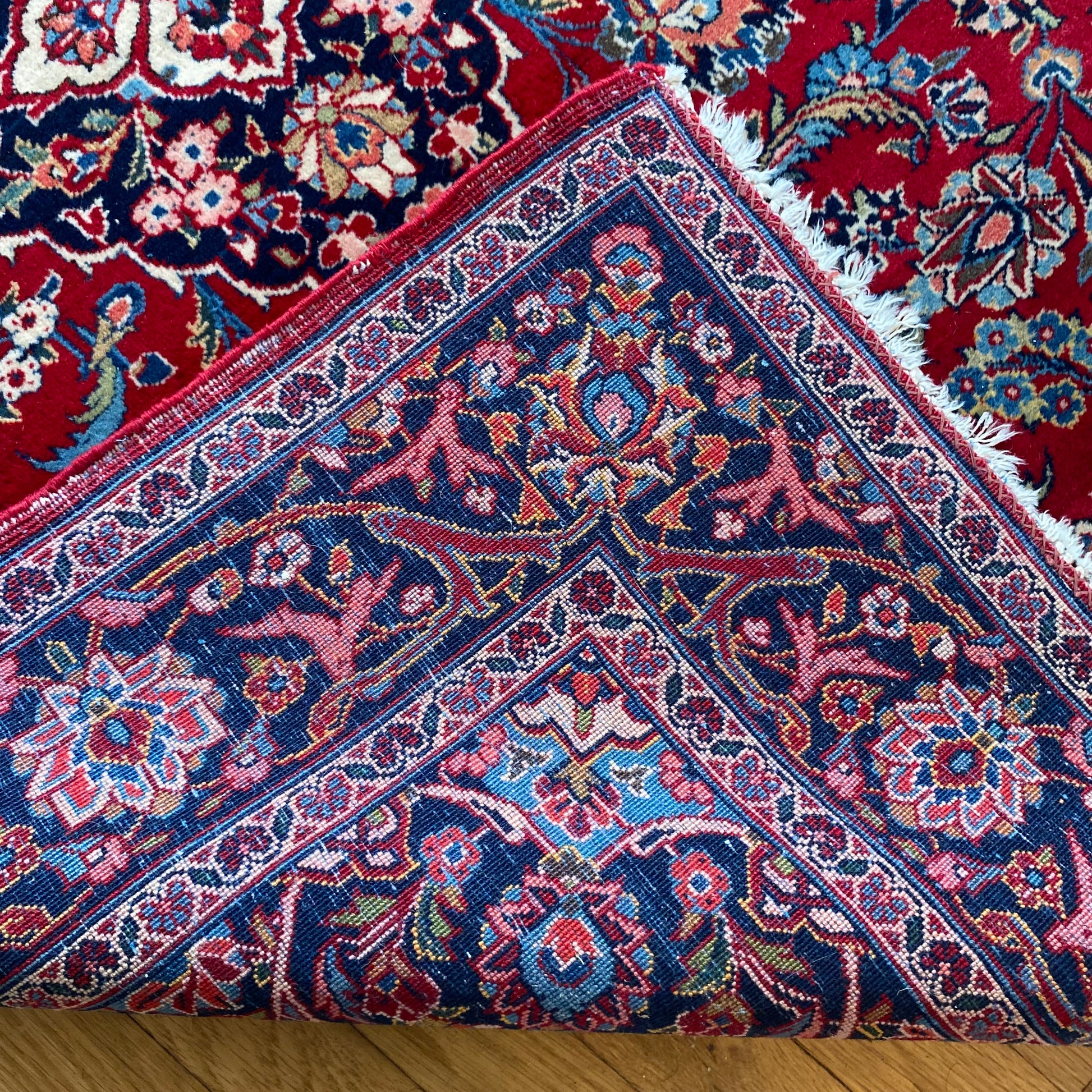 This vintage rug is in good condition. The design features a central medallion set in a red field with blue and white highlights. There is even wear on the fringe ends, edges and throughout.