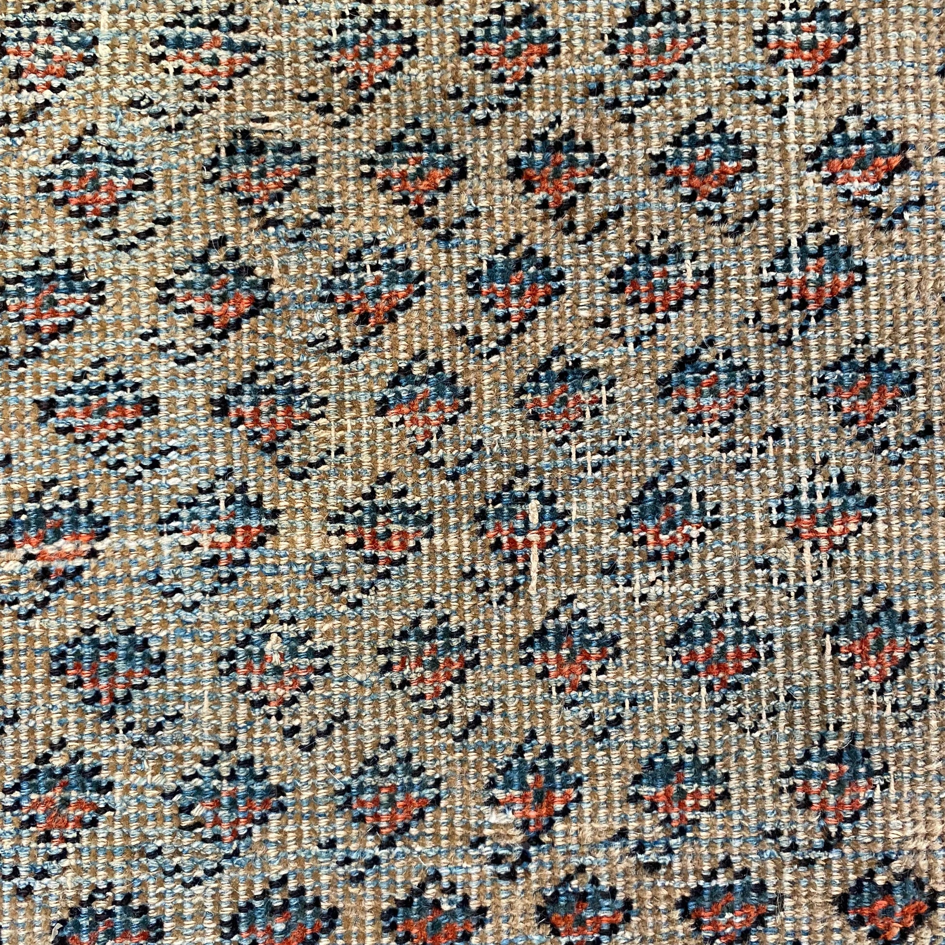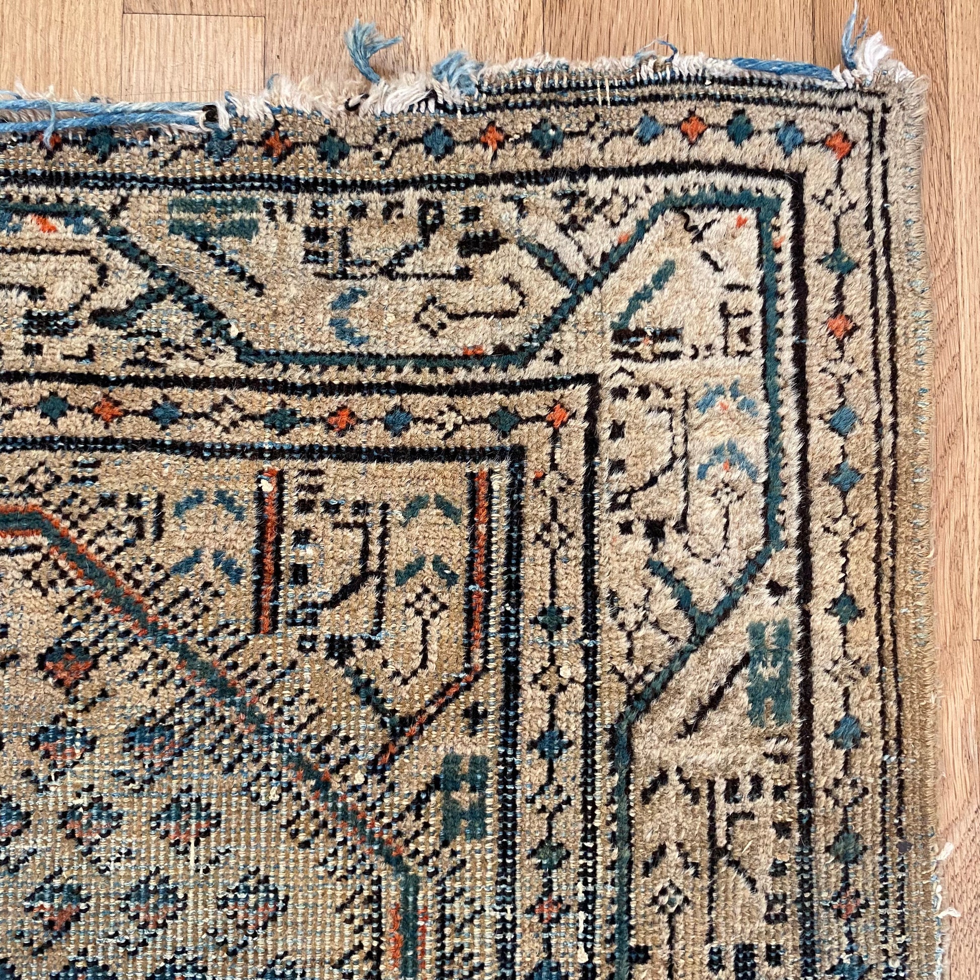 This vintage rug is in fair condition. The design features an all-over pattern set in a cream field with blue and red orange highlights. There is wear on the edges, fringe ends and throughout.