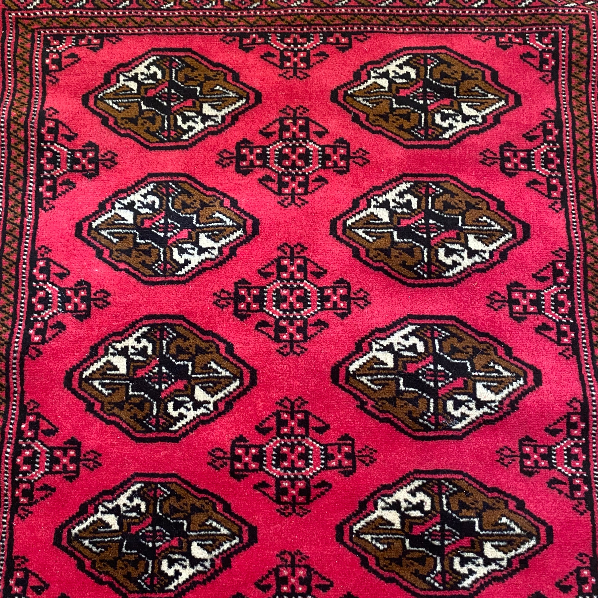This vintage rug is in very good condition. The design features an all-over pattern set in a red field with white and brown highlights. There is light wear throughout.