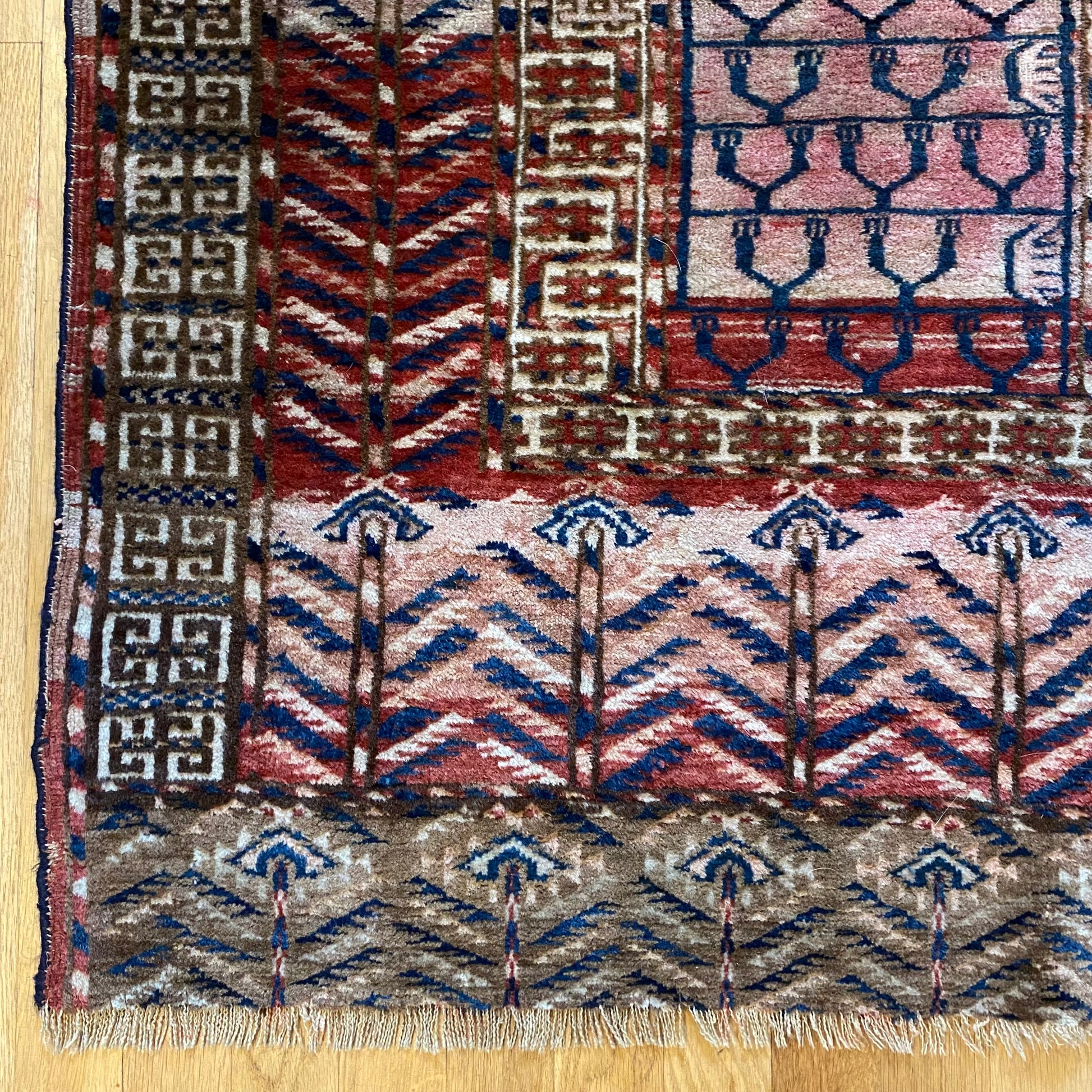 This vintage rug is in fair condition. The field is a mix of pink and brown featuring a prayer design and dark blue highlights. There is wear throughout as seen in the photos.