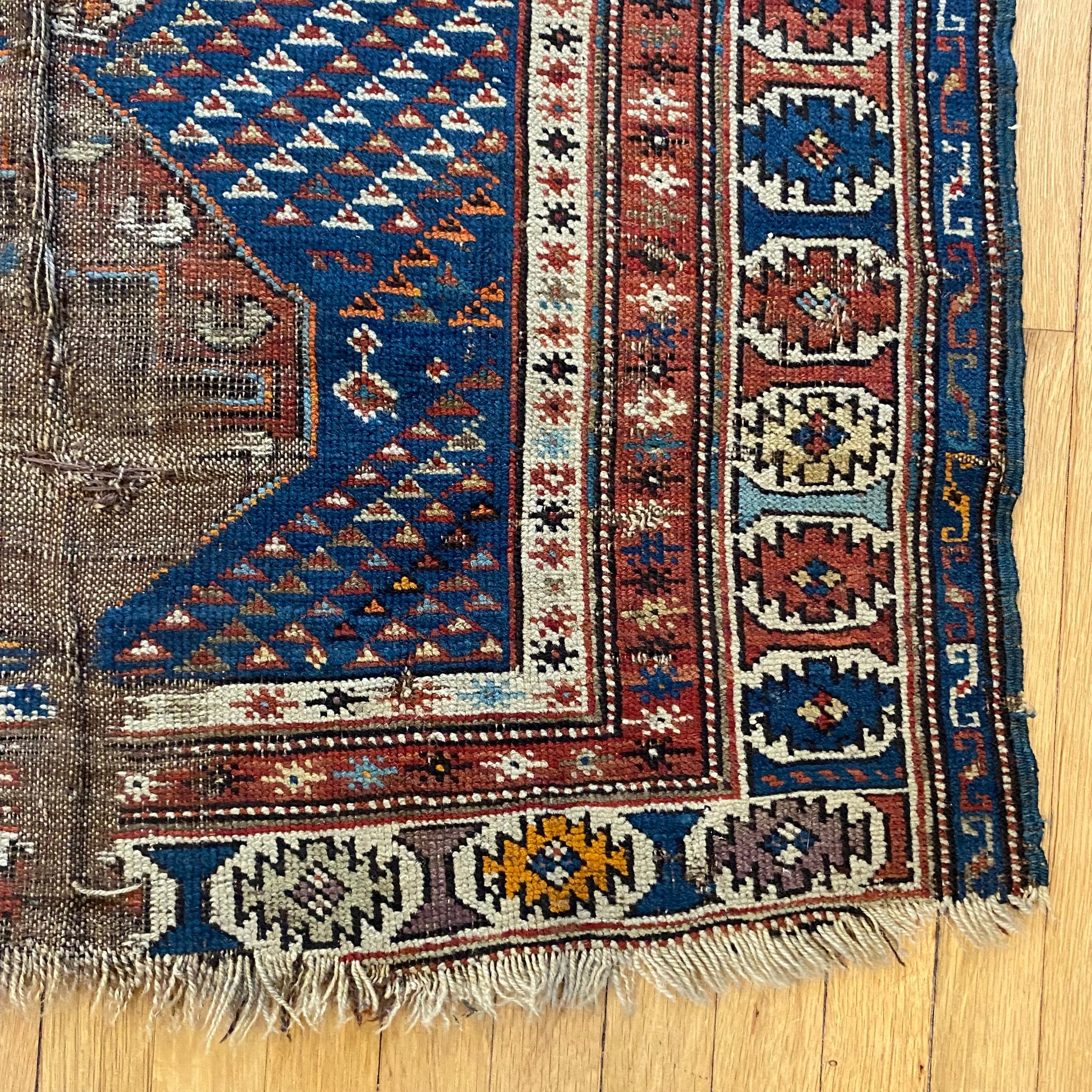 This vintage rug is in fair condition. The design features a tribal pattern set in a blue field with brown and white highlights. There is heavy wear throughout as seen in the photos.