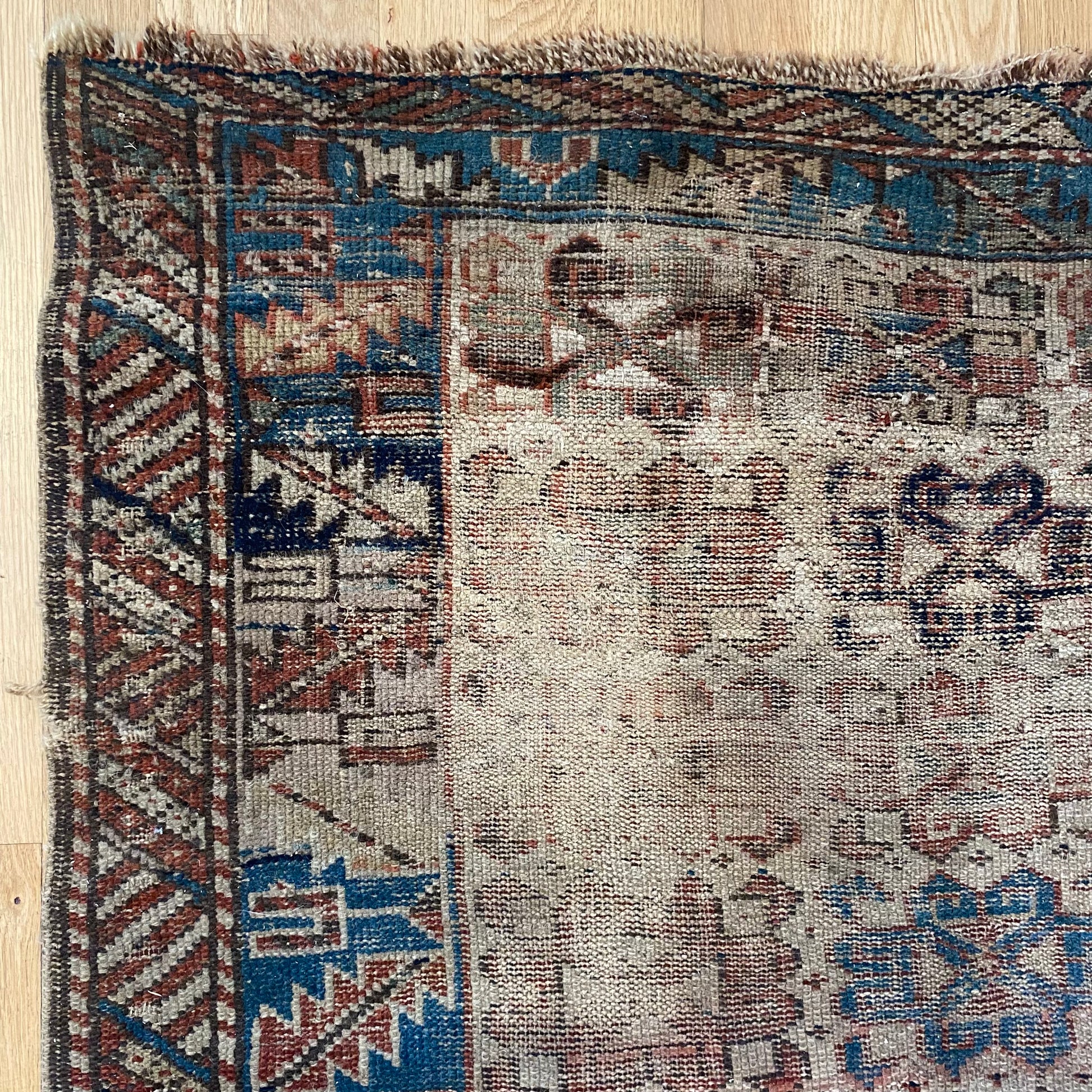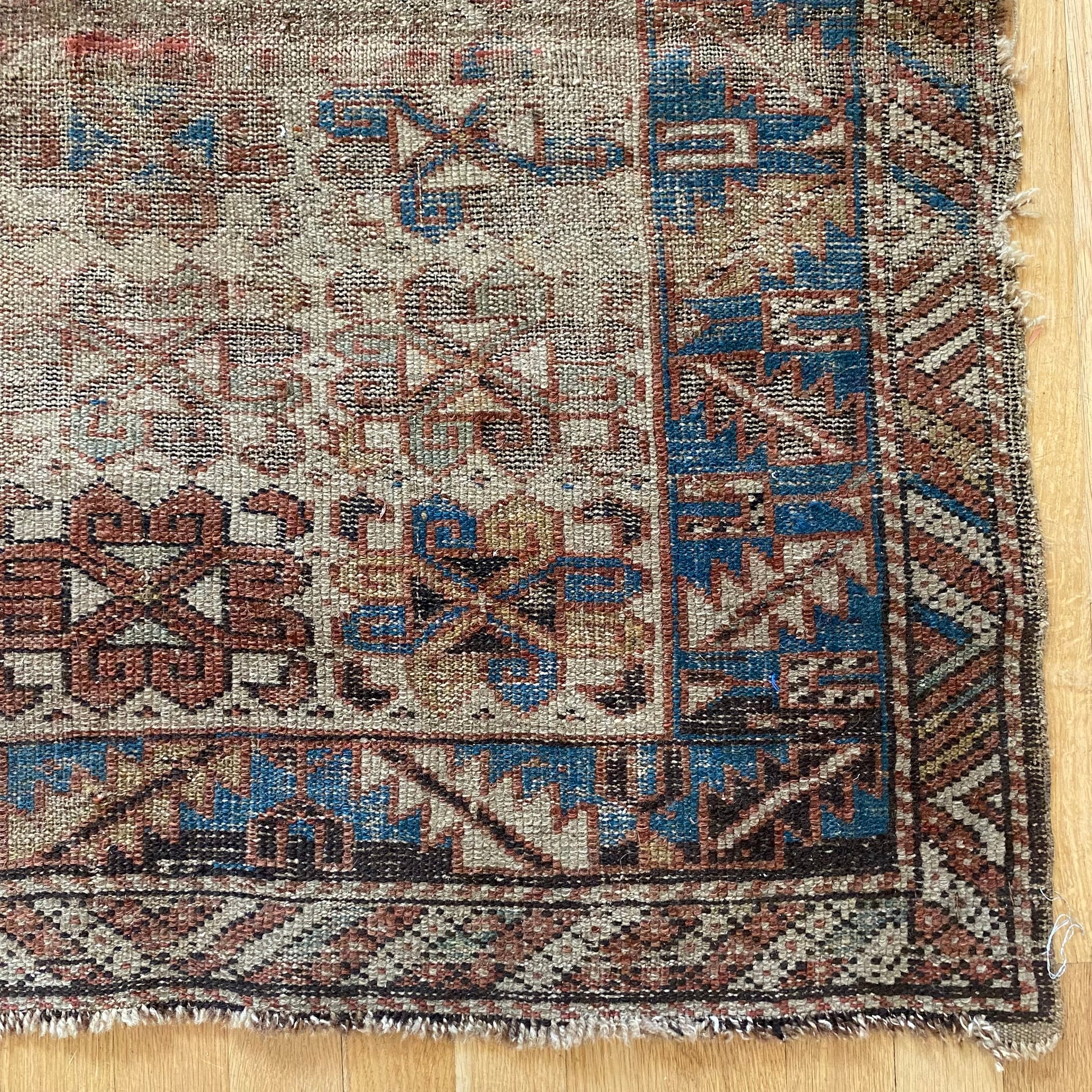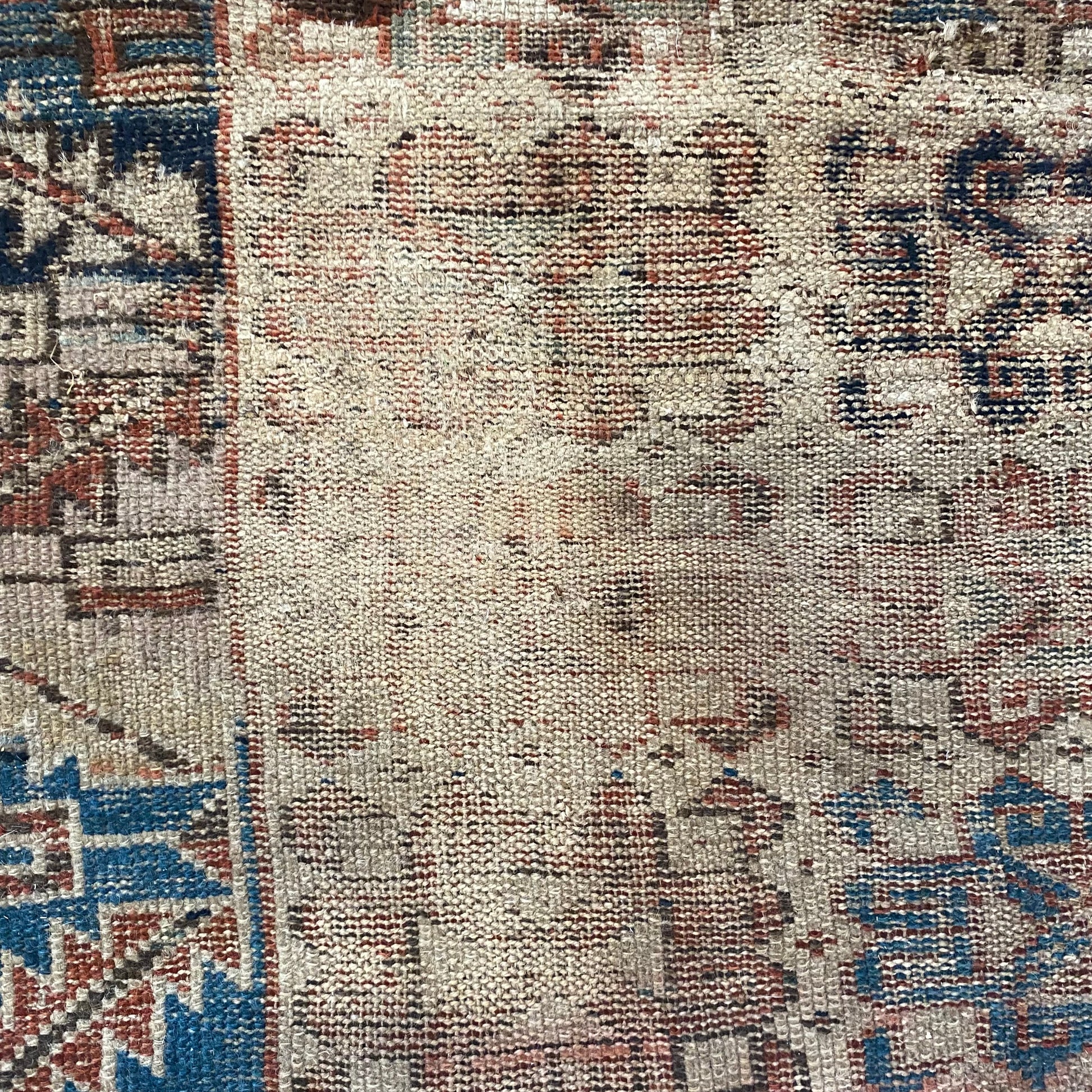 This antique rug is in poor condition. The design features a tribal pattern set in a beige field with blue and brown highlights. There is heavy wear and some repairs throughout as seen in the photos.