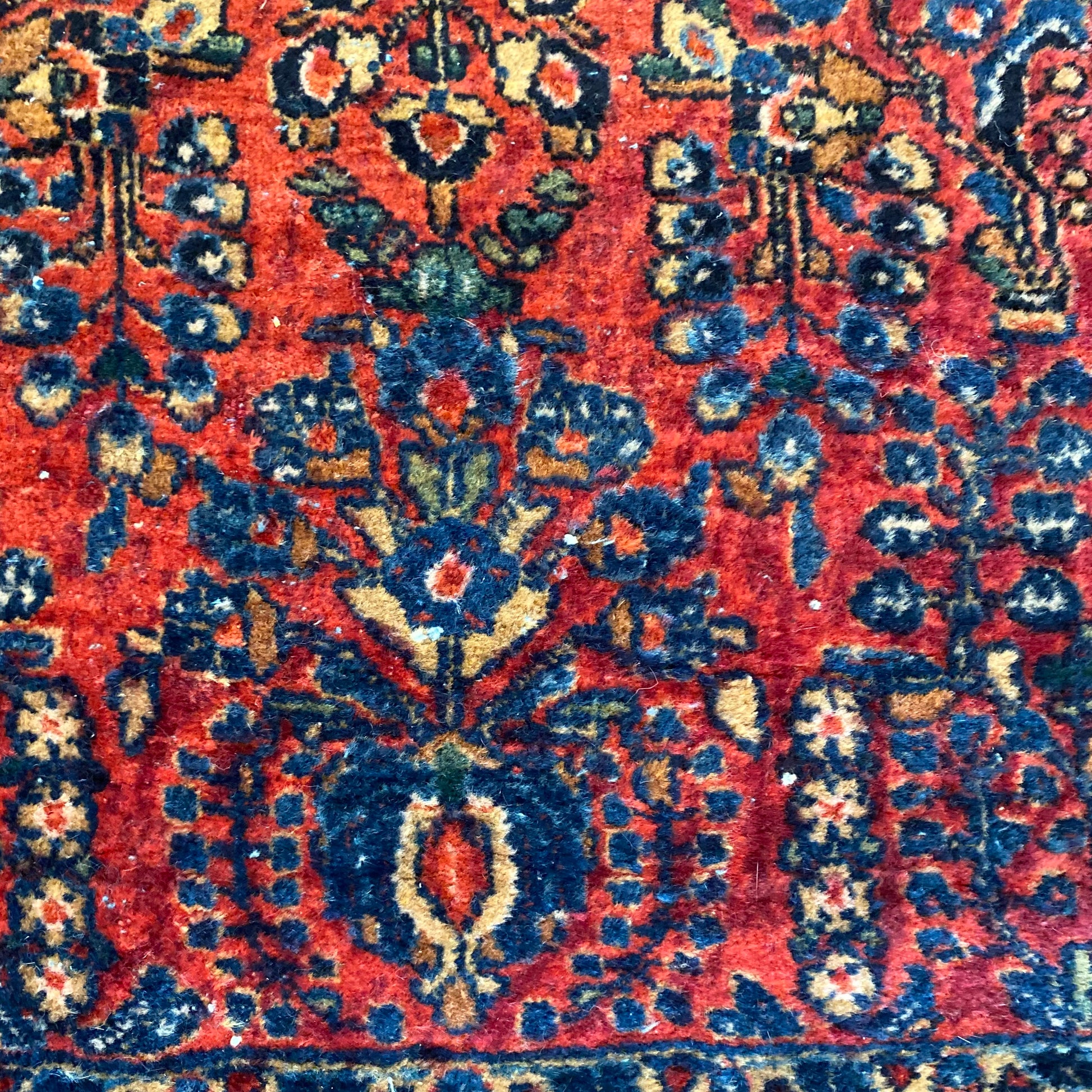This vintage rug is in very good condition. The design features an all-over floral pattern set in a dark pink field with blue and tan highlights. There is light wear throughout as seen in the photos.