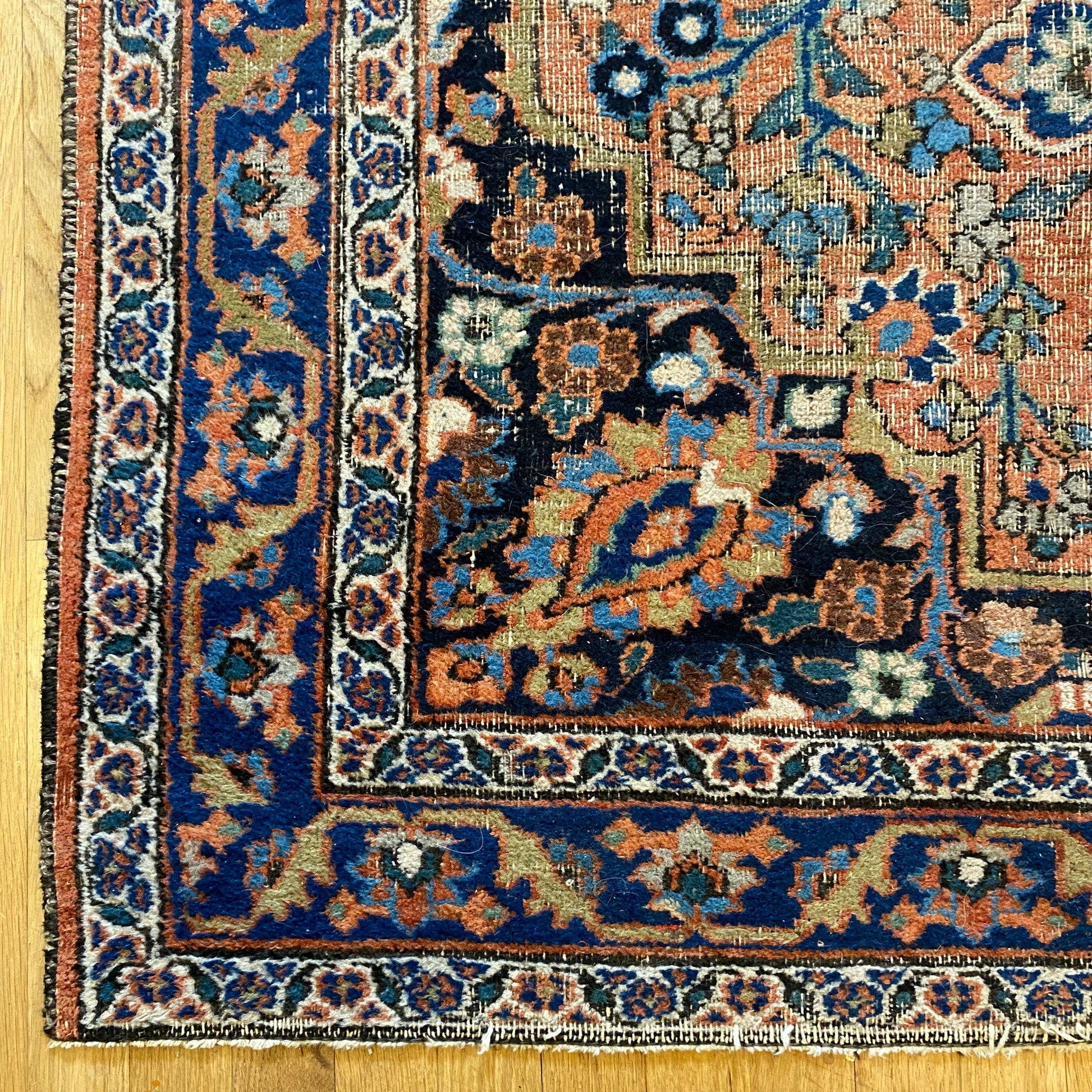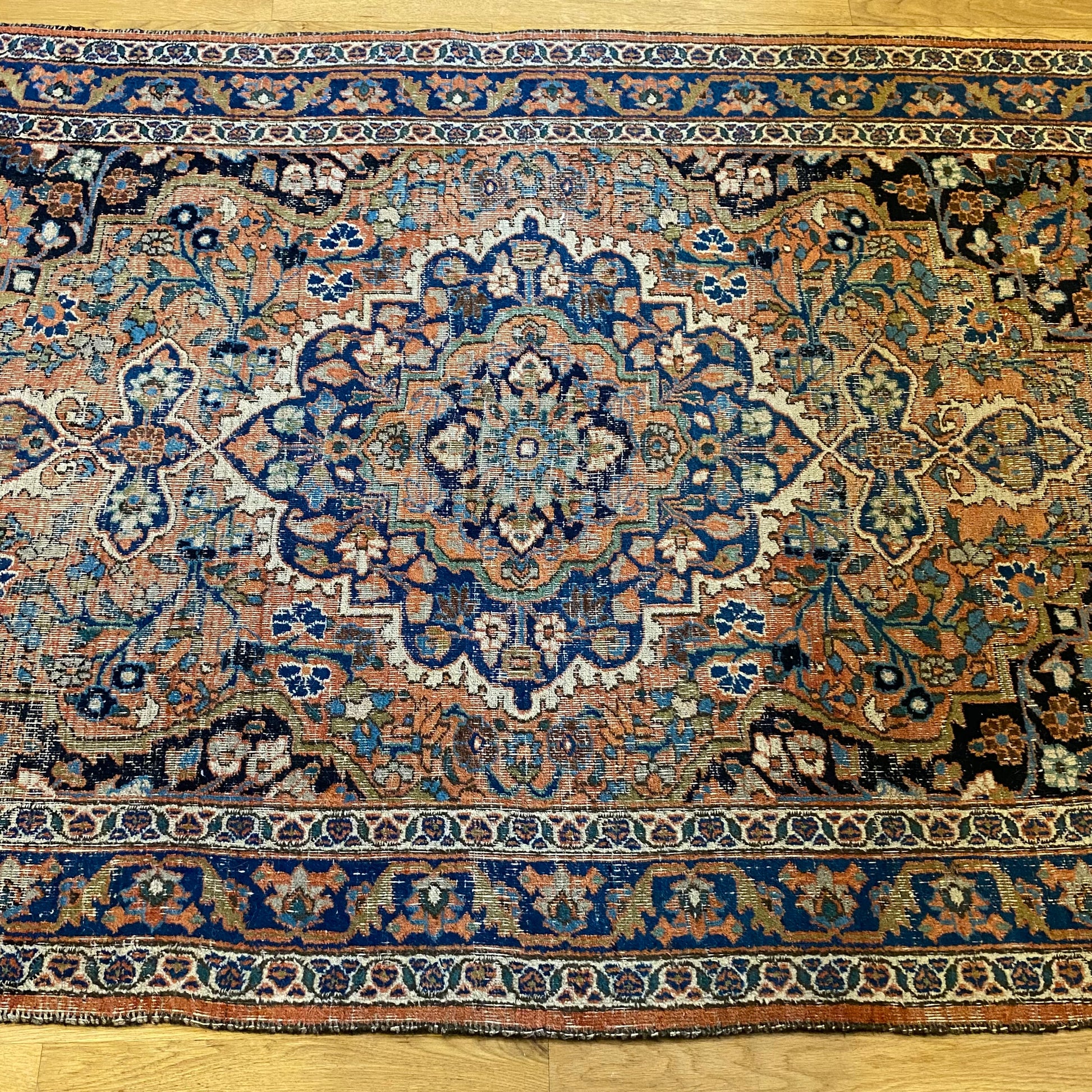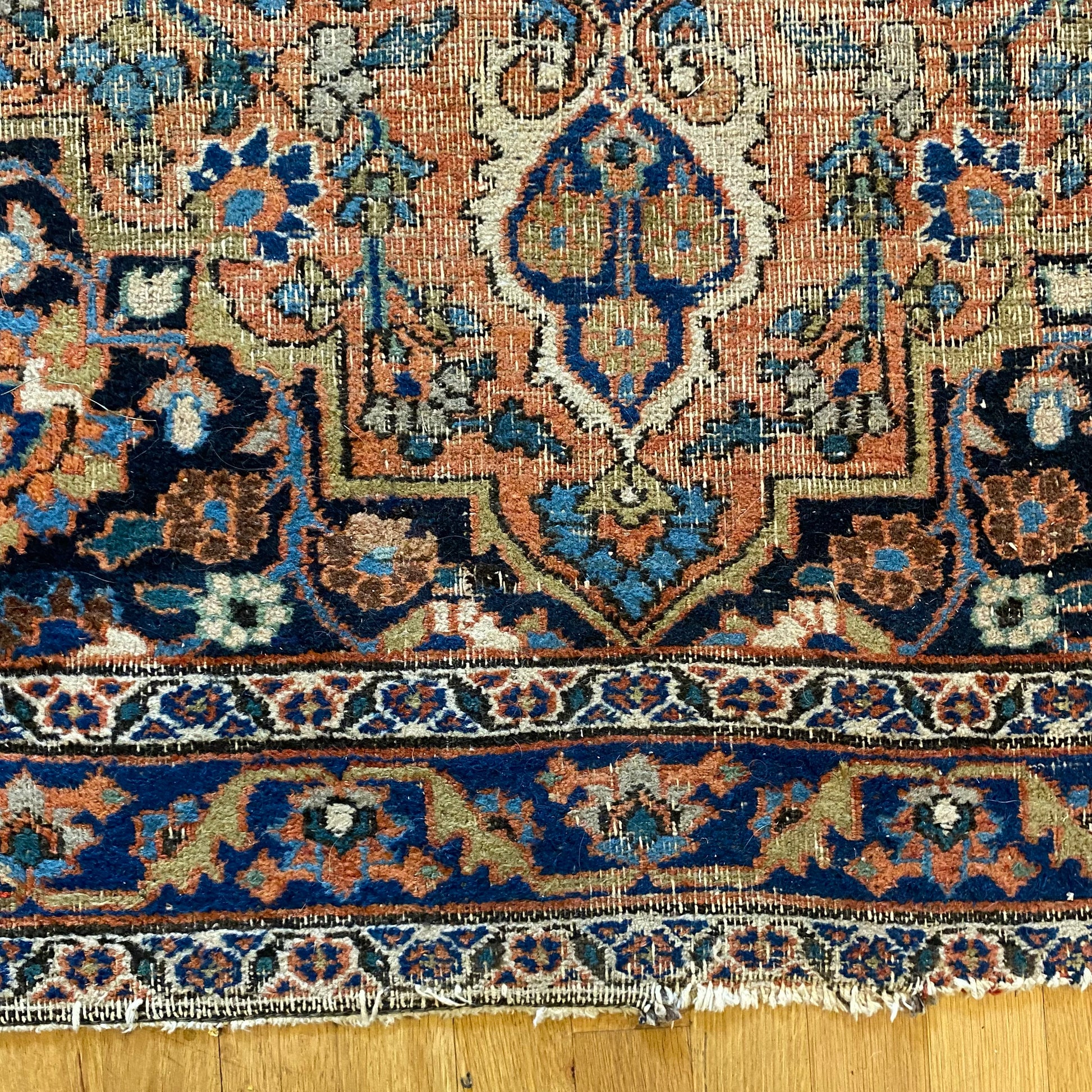 This vintage rug is in good condition. The design features a central medallion set in a soft orange field with blue and white highlights. There is wear throughout as seen in the photos.