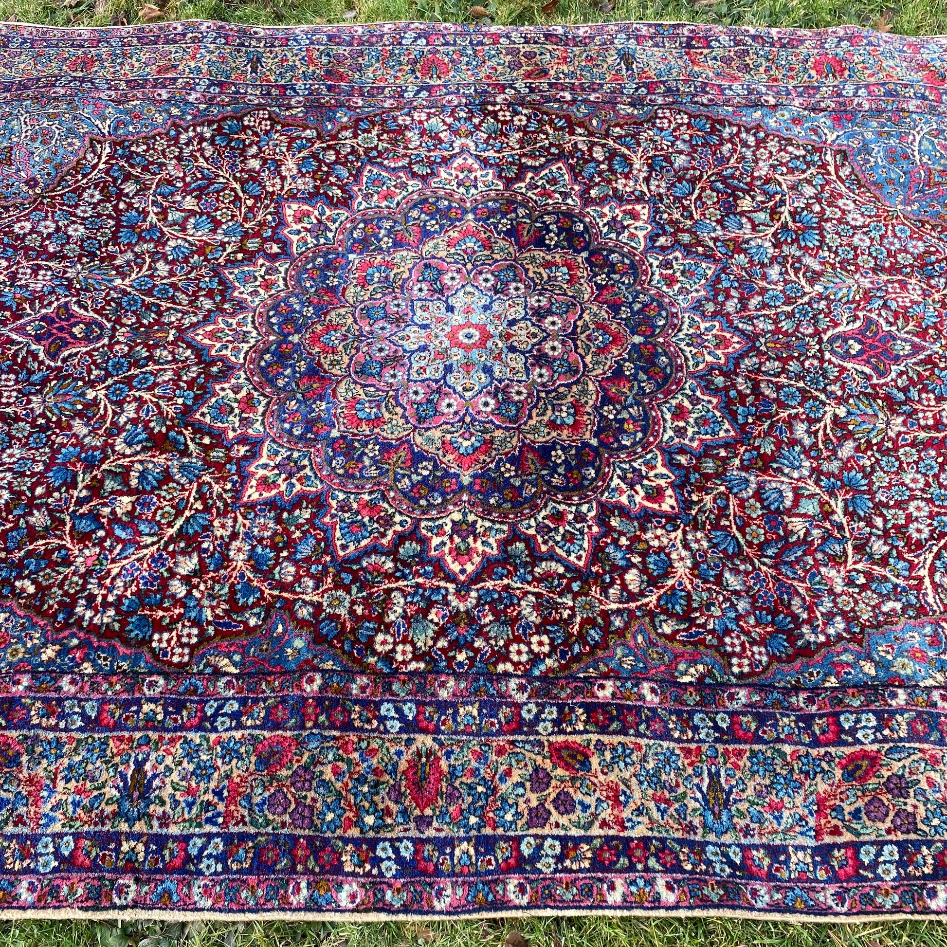 This vintage rug is in very good condition. The design features a central medallion surrounded by a curvilinear pattern set in a red field with cream, blue and white highlights. There is light wear throughout as seen in the photos.