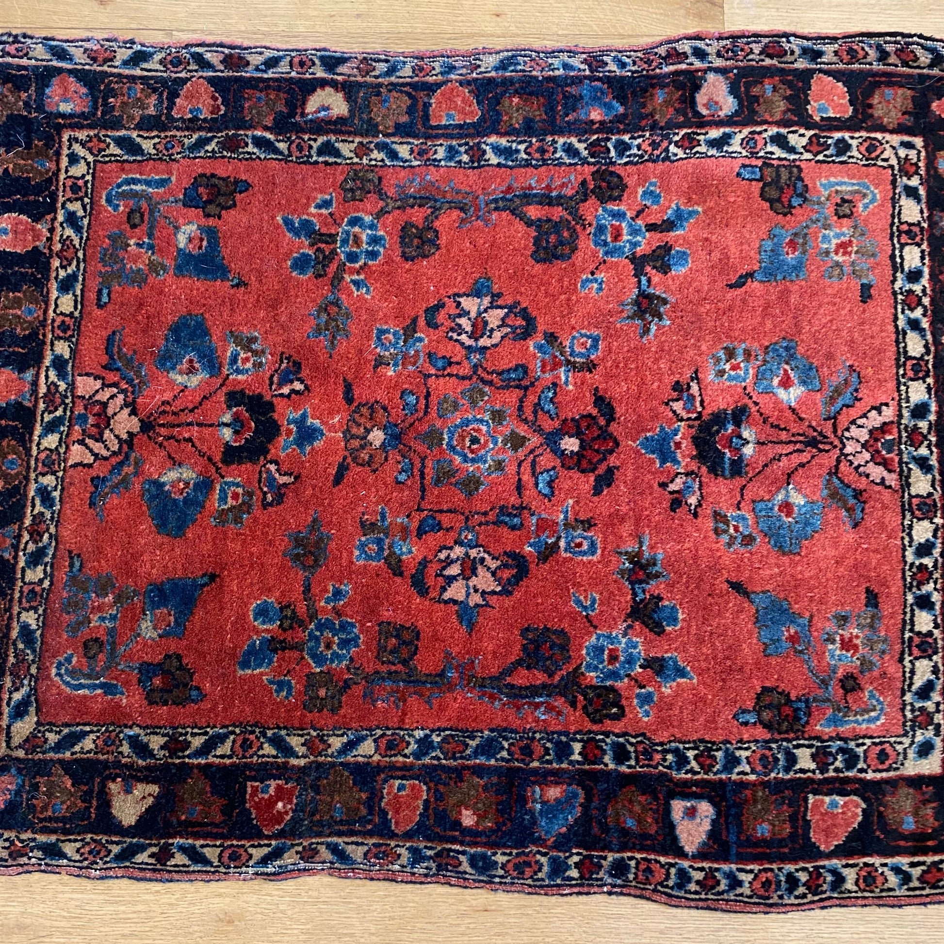 This vintage rug is in good condition. The design features a floral pattern set in a pink field with blue and cream highlights. There is even wear throughout and some areas of moderate wear on the edges as seen in the photos.