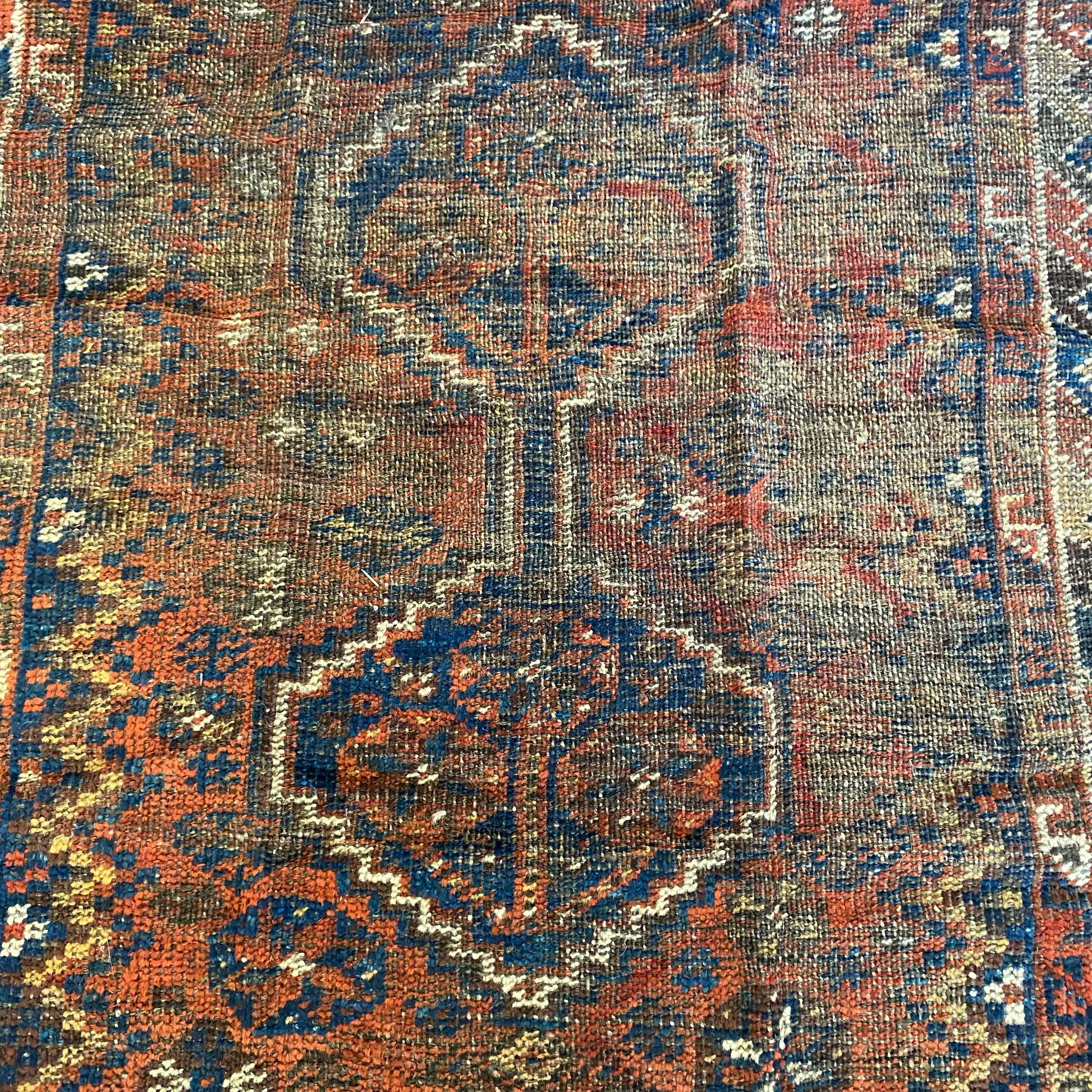 This vintage rug is in fair condition. The design features a tribal pattern set in a brown field with blue and white highlights. There is wear throughout as seen in the photos.