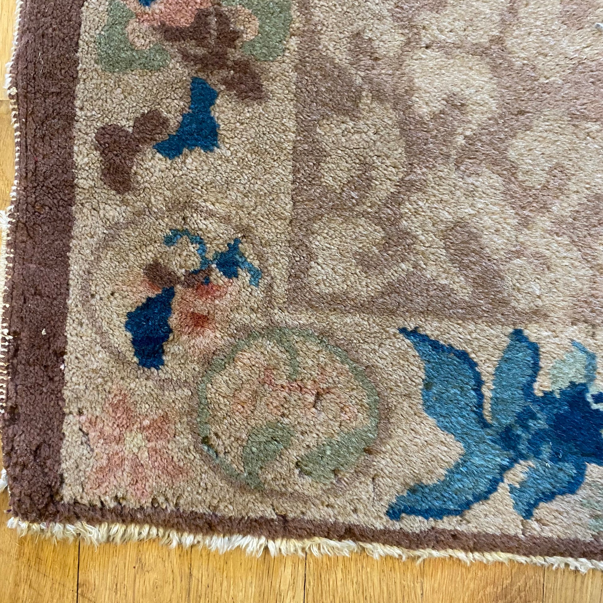 This vintage rug is in poor condition. The design features an all-over pattern with blue and brown highlights set in a beige field. There are many areas missing pile as seen in the photos.