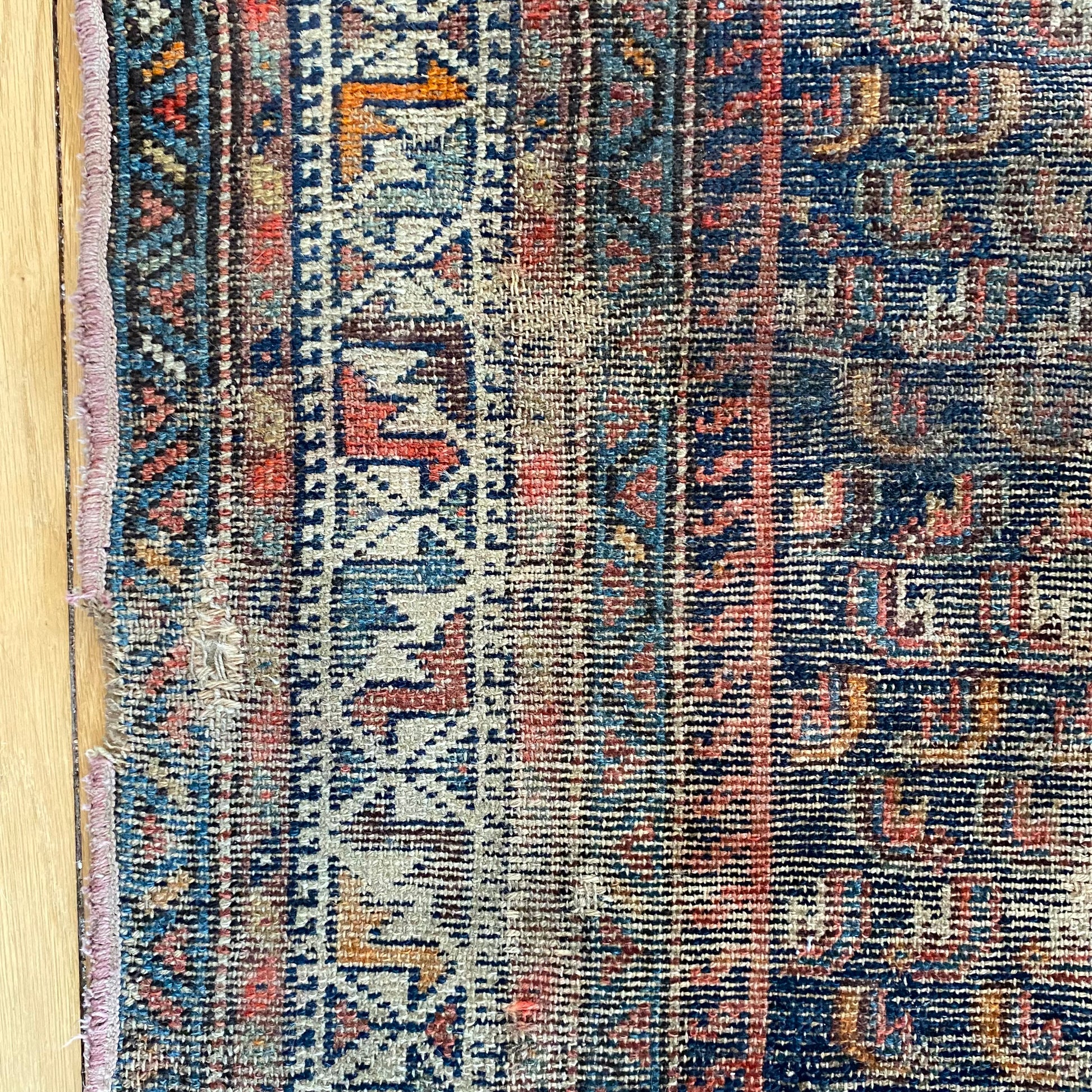 This vintage rug is in poor condition. The design features an all-over pattern set in a blue field with orange and white highlights. There is heavy wear throughout. The edges are not original and there are some patches on the backside as seen in the photos.