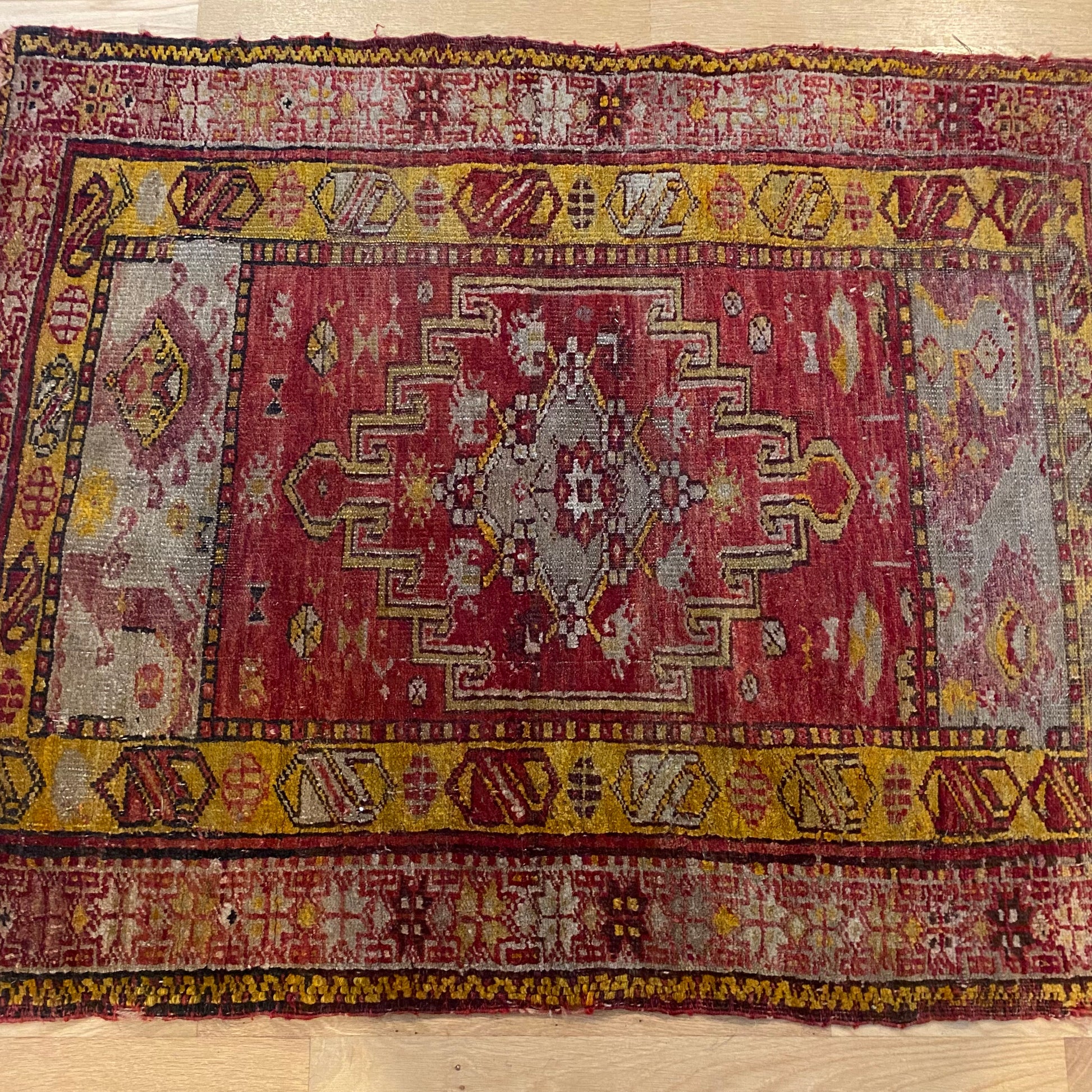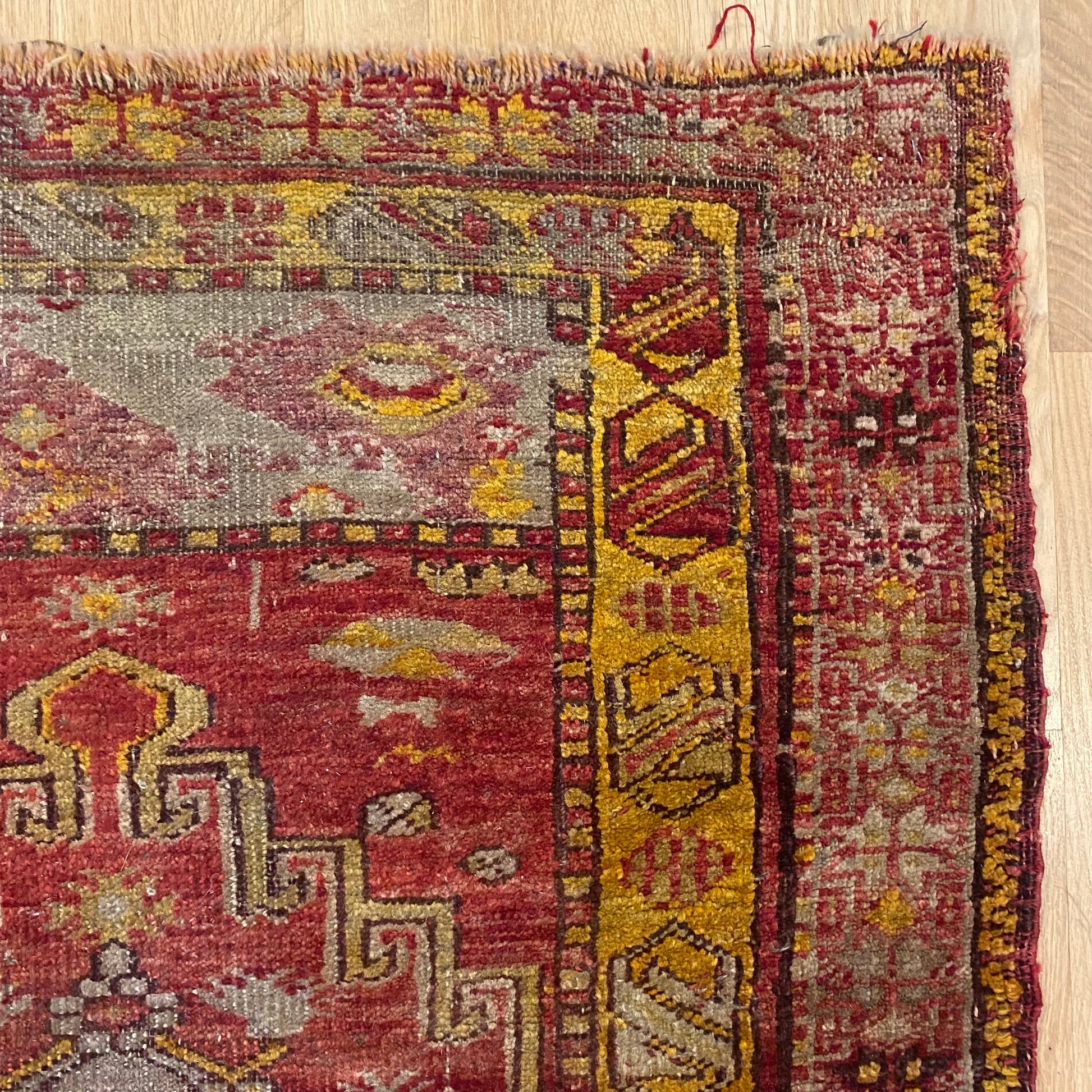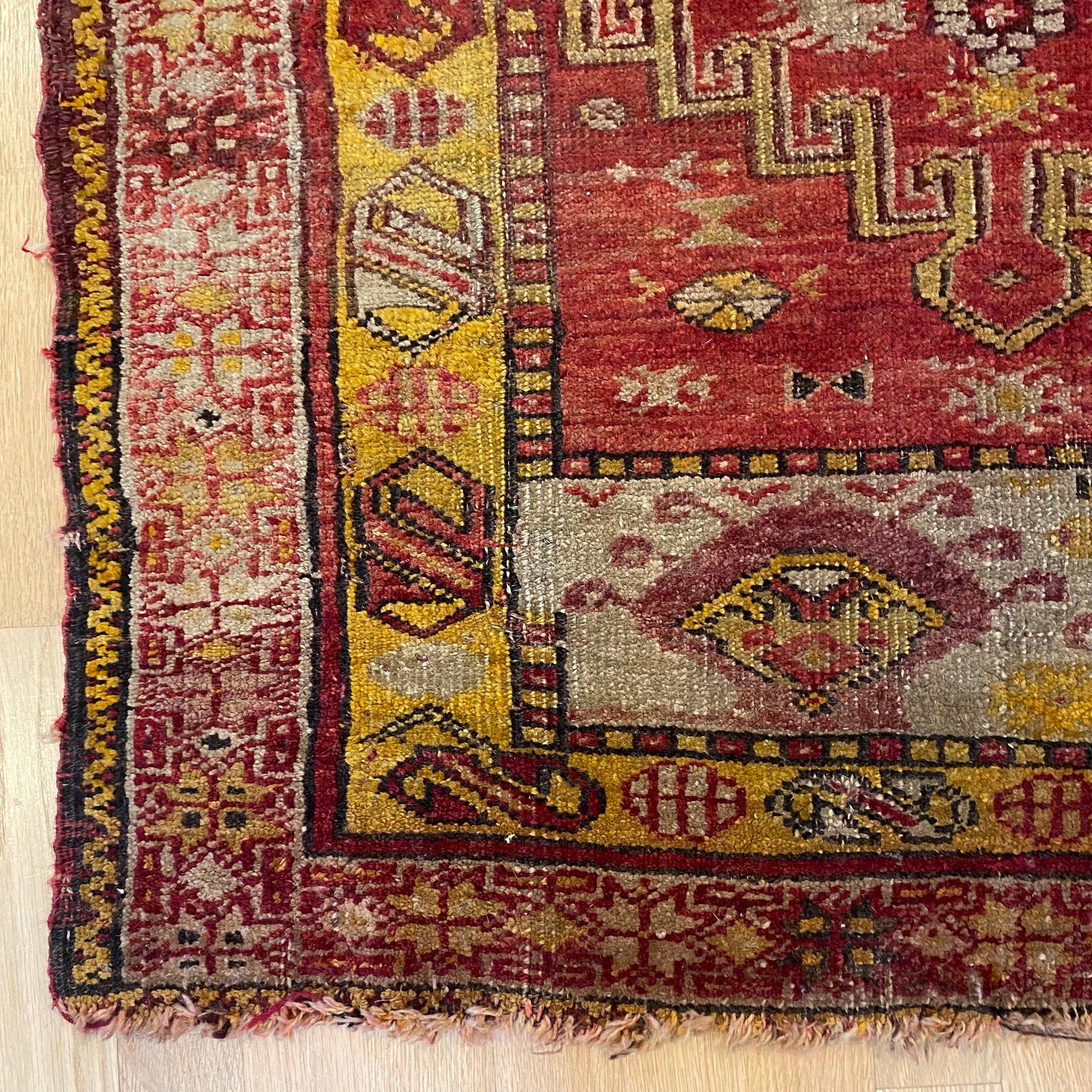 This antique rug is in fair condition. The design features a tribal pattern set in a red field with gold and grey highlights. There is wear on the edges, fringe ends and throughout. There is even fading throughout.