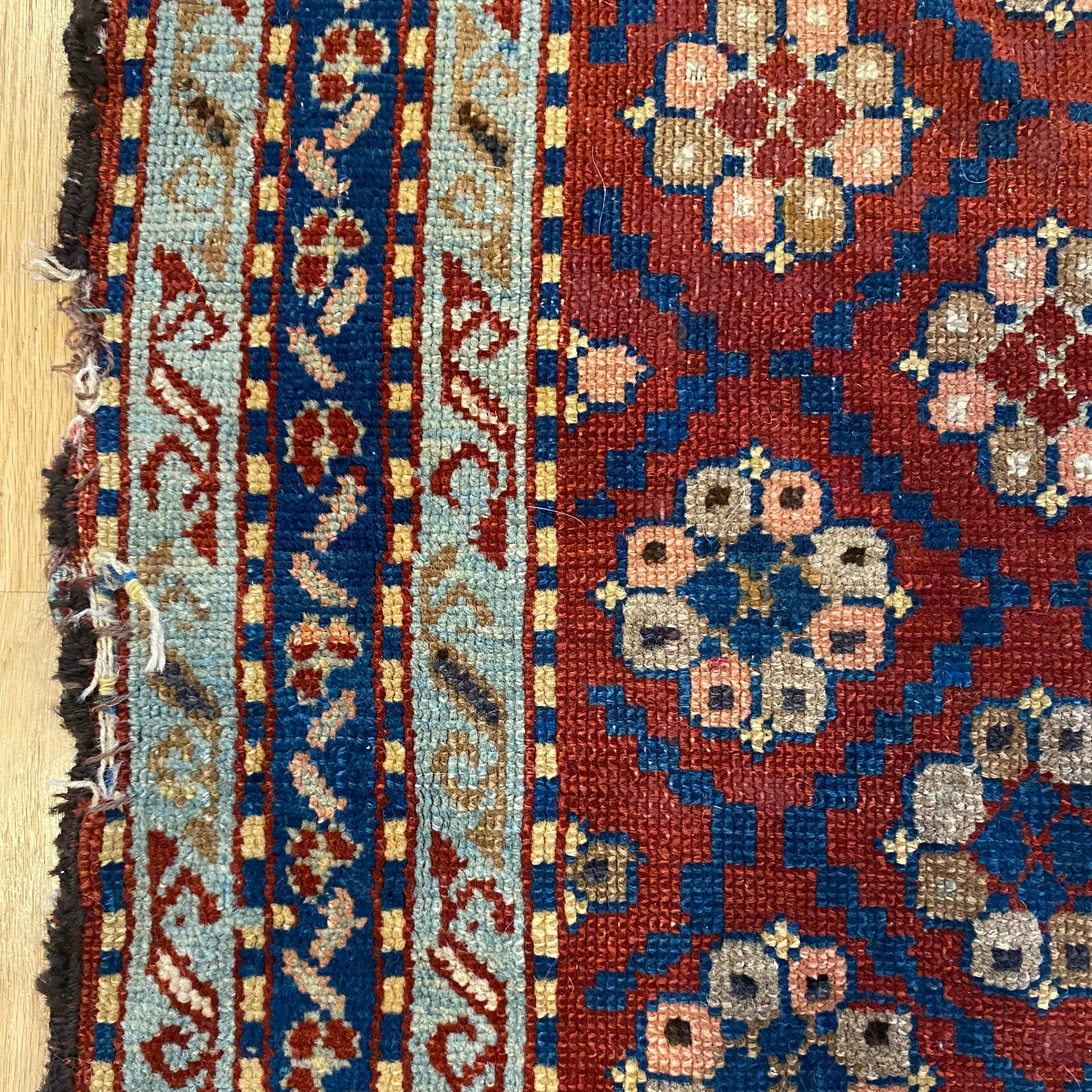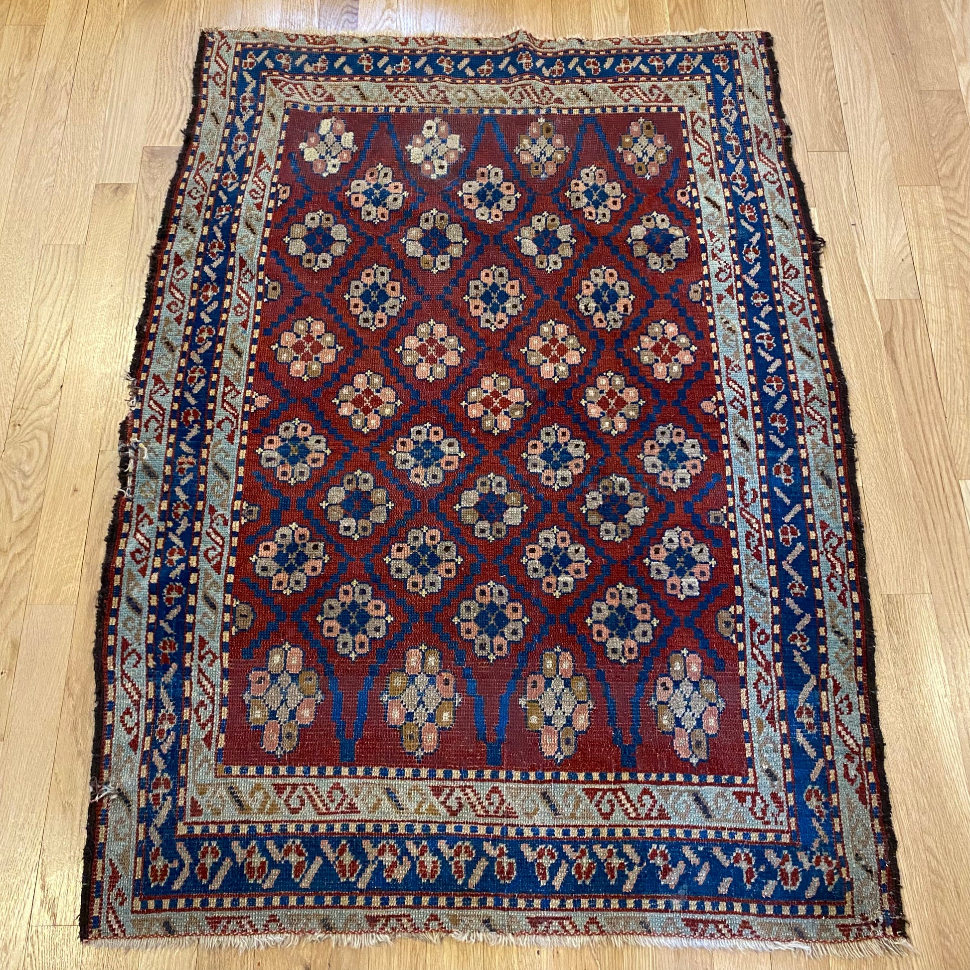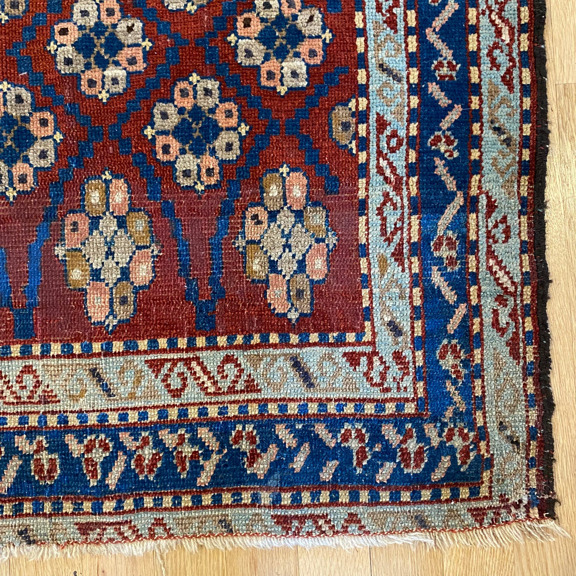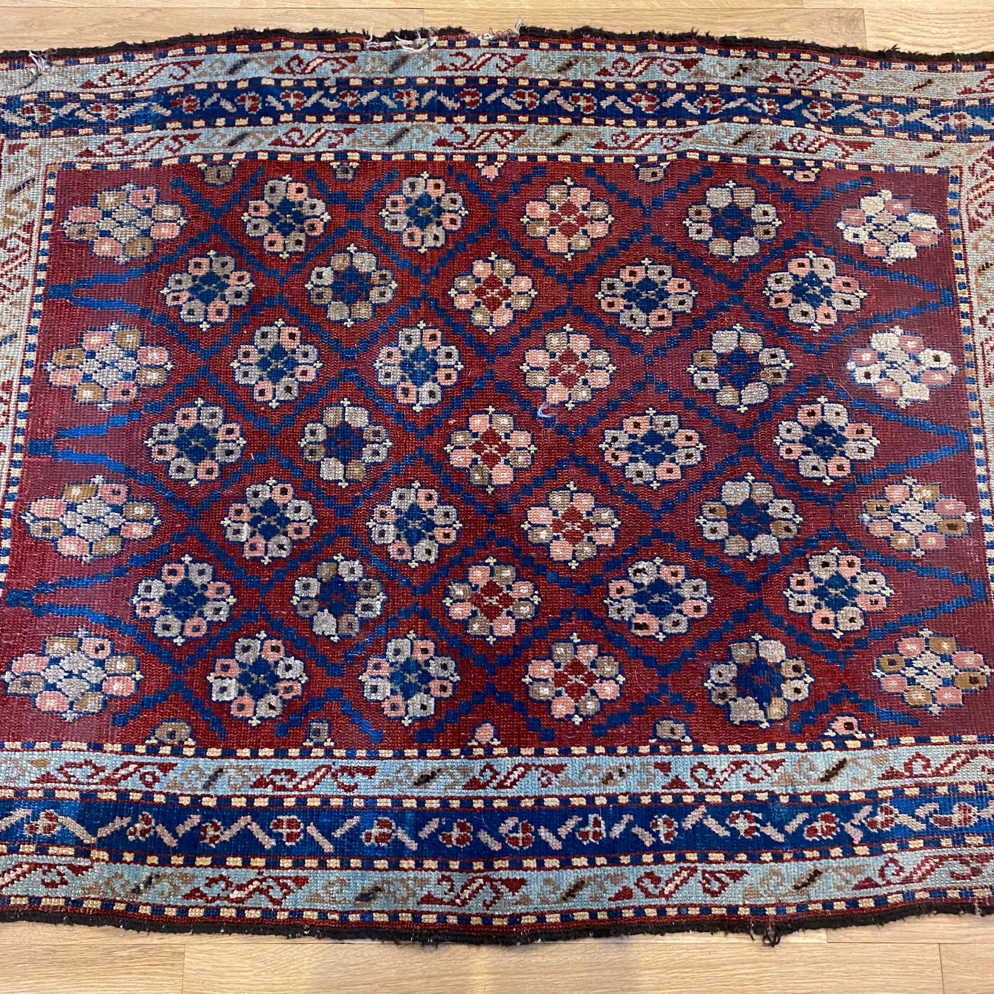 This antique rug is in fair condition. The design features an all-over pattern set in a red field with blue and tan highlights. There is wear on the edges, fringe ends and throughout. There are some repairs to the edges as seen in the photos.