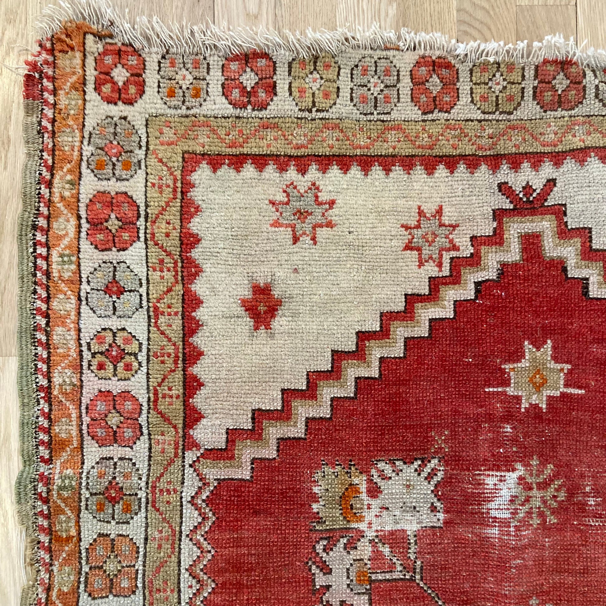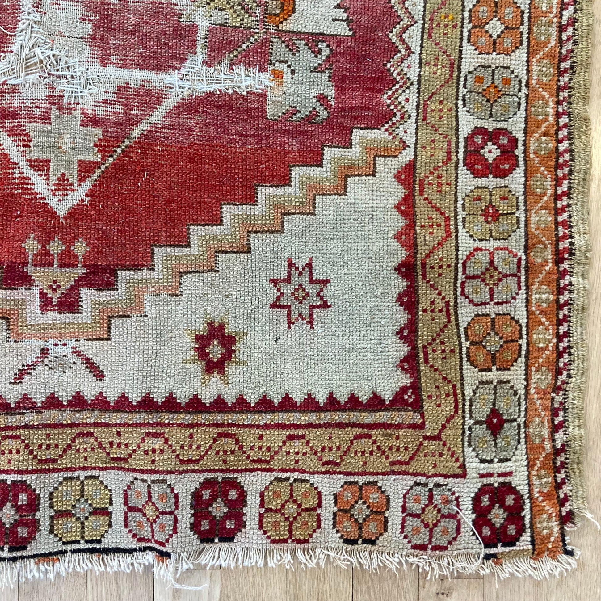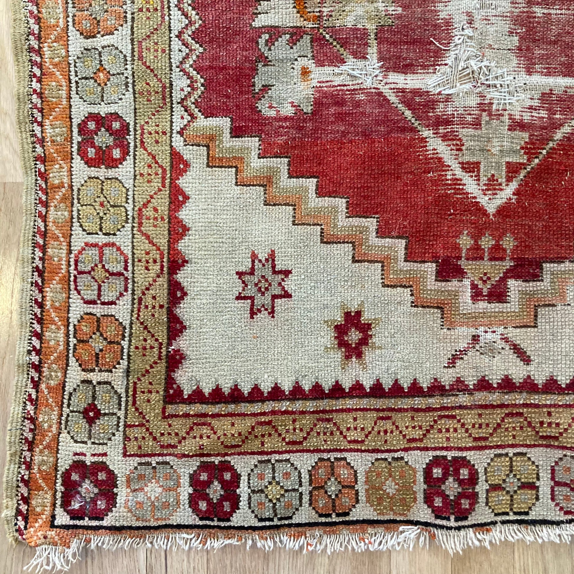 This antique Turkish rug is in poor condition. The design features a tribal pattern set in a red field with gold, cream and orange highlights. There is heavy wear throughout and several weak areas with crude repairs as seen in the photos.