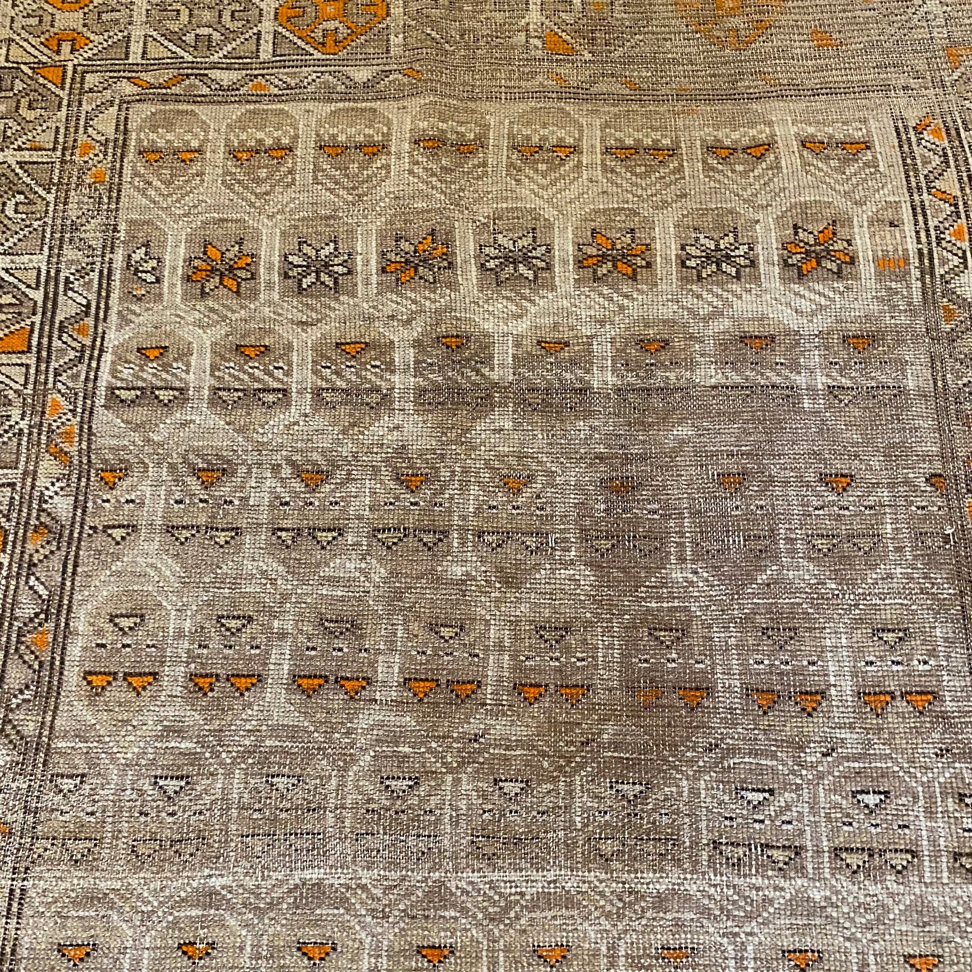This antique rug is in fair condition. The design features an all-over pattern set in a beige field with ivory, orange and brown highlights. There is wear on the edges, fringe ends and throughout as seen in the photos.