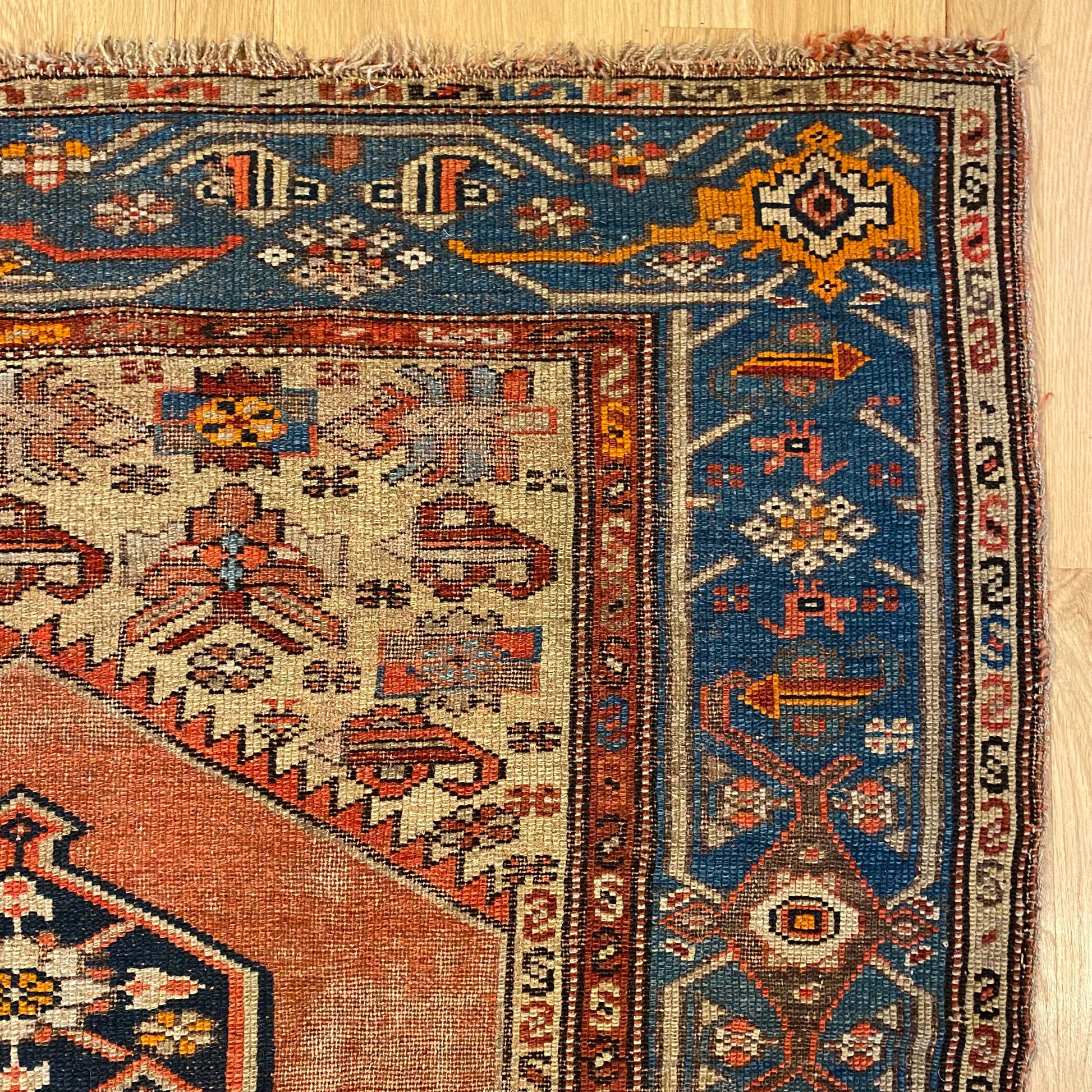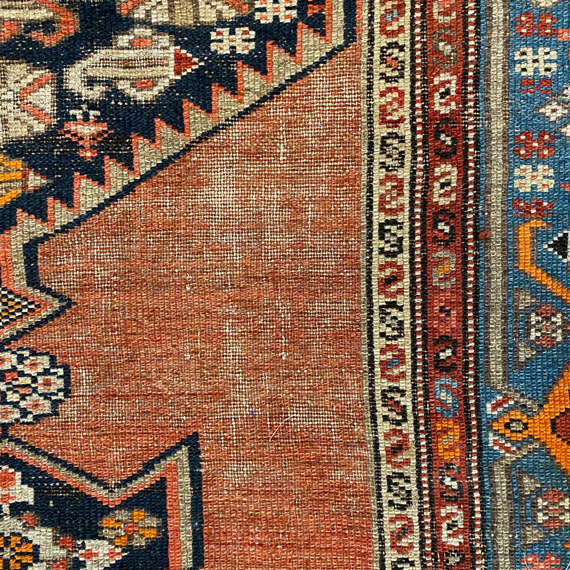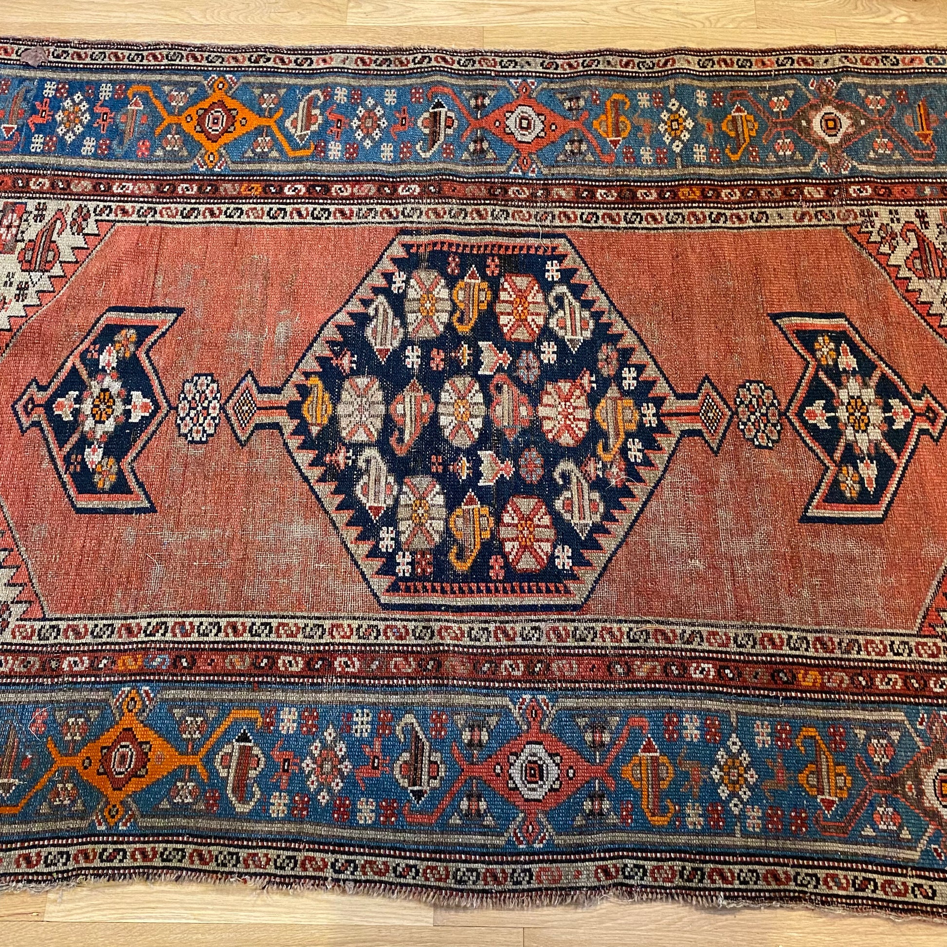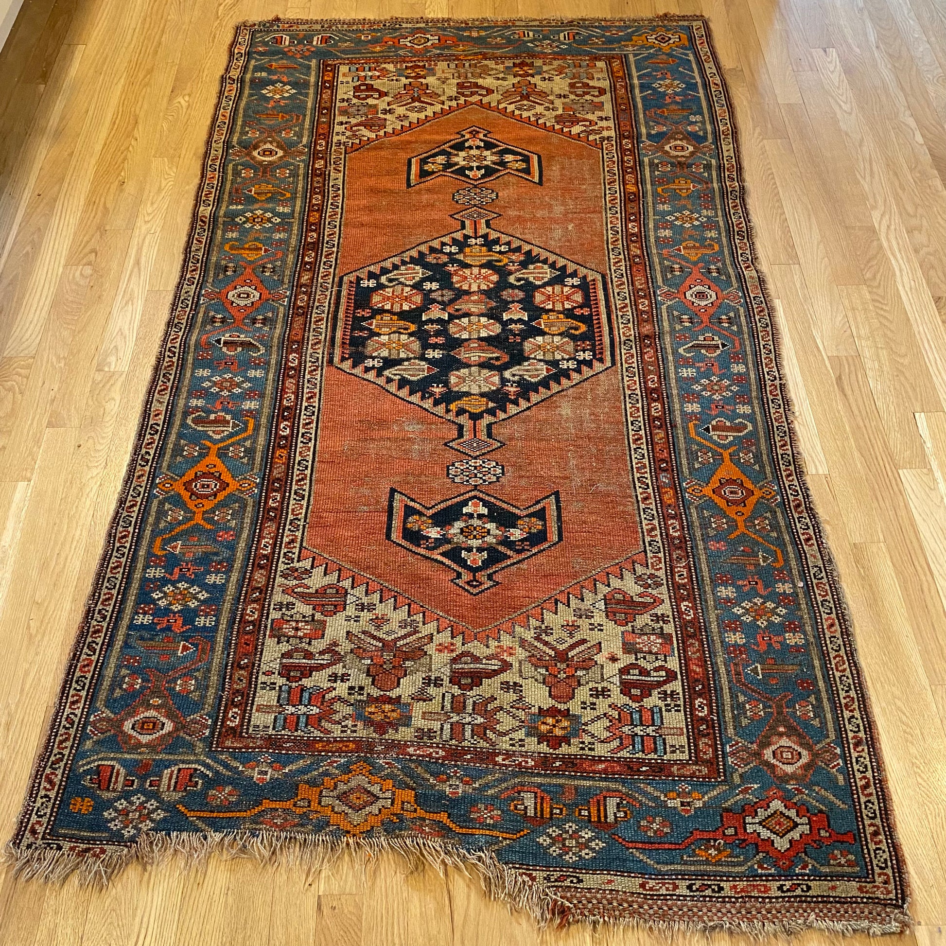 This antique rug is in fair condition. The design features a central medallion set in a red-orange field with blue and orange highlights. There is wear on the edges, fringe ends and throughout as seen in the photos.