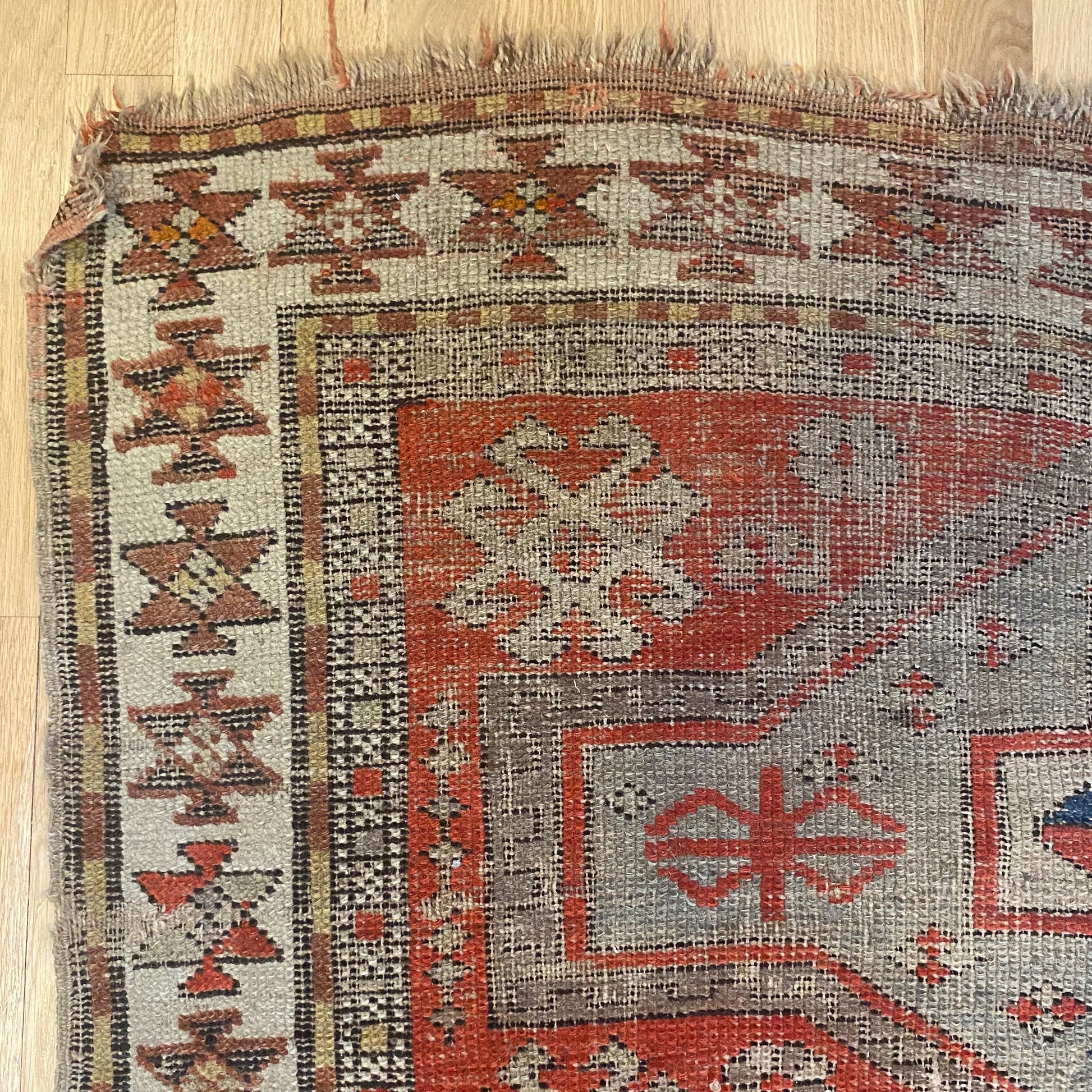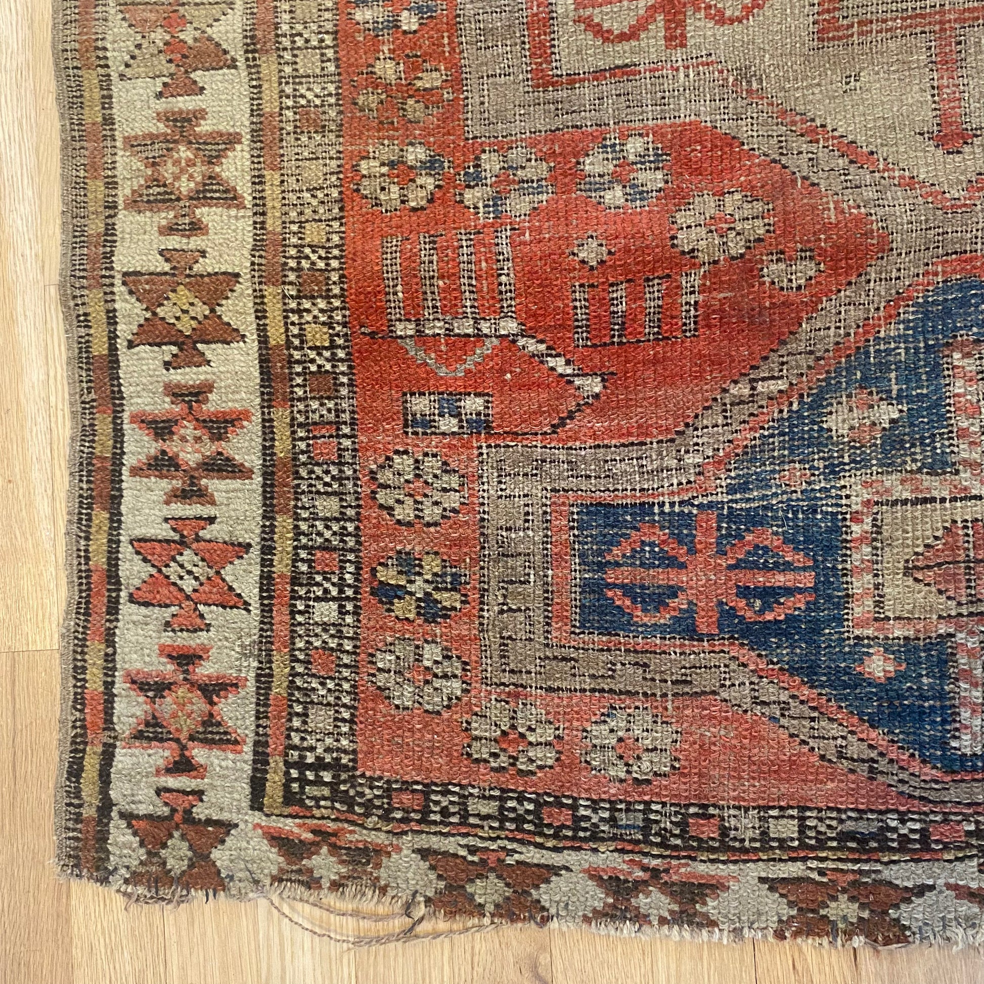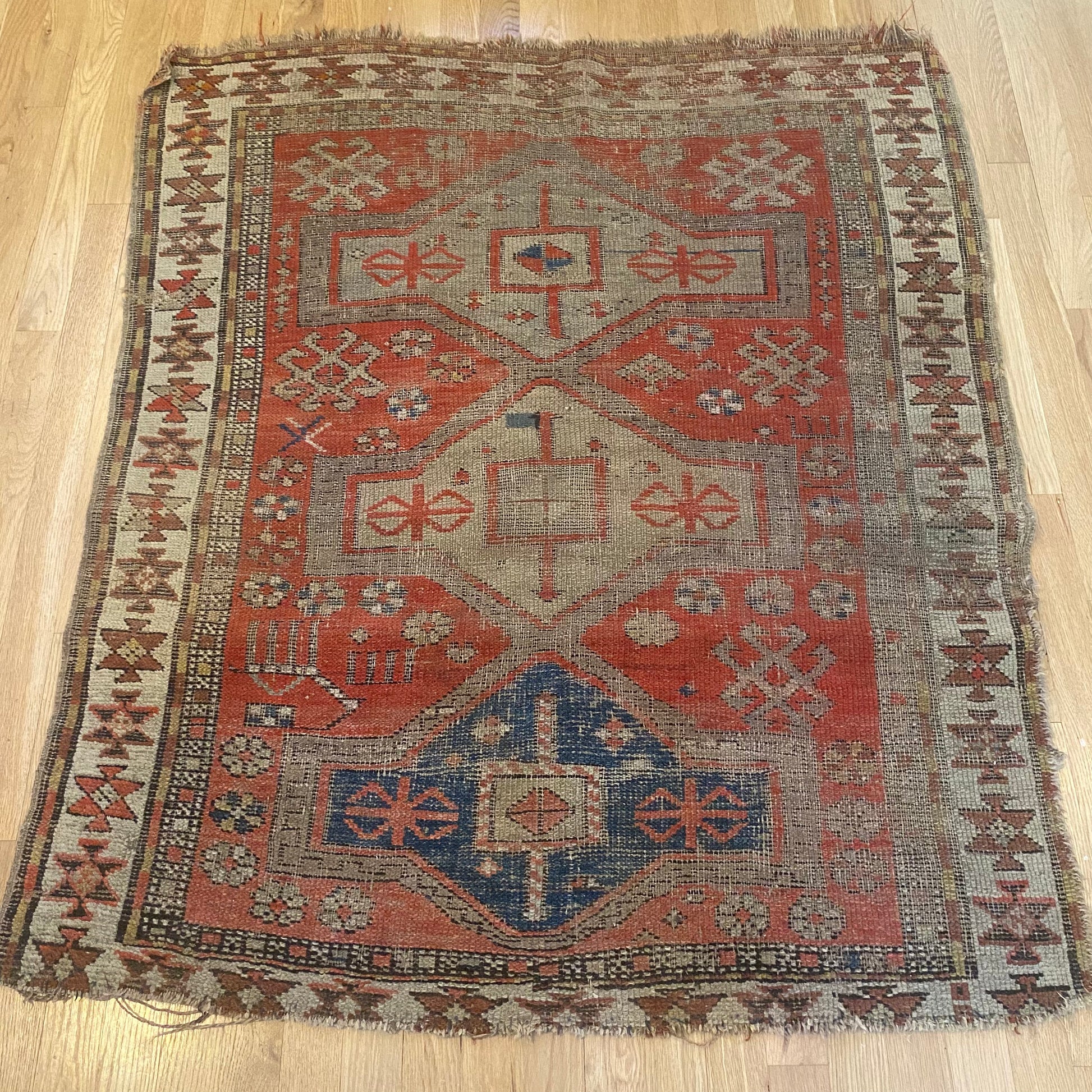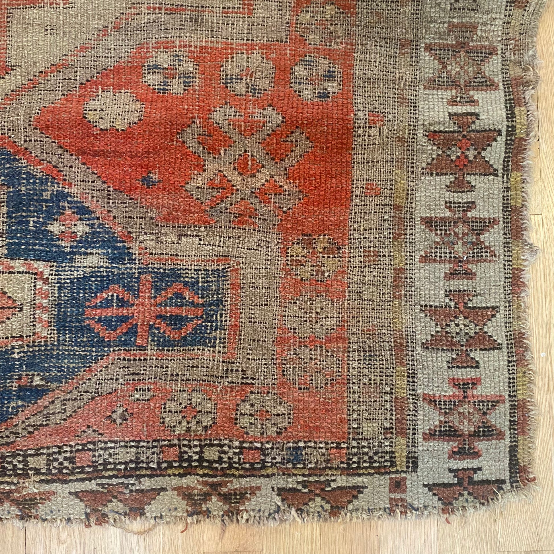 This antique rug is in poor condition. The design features a tribal pattern set in a red-orange field with blue and ivory highlights. There is heavy wear on the edges, fringe ends and throughout.