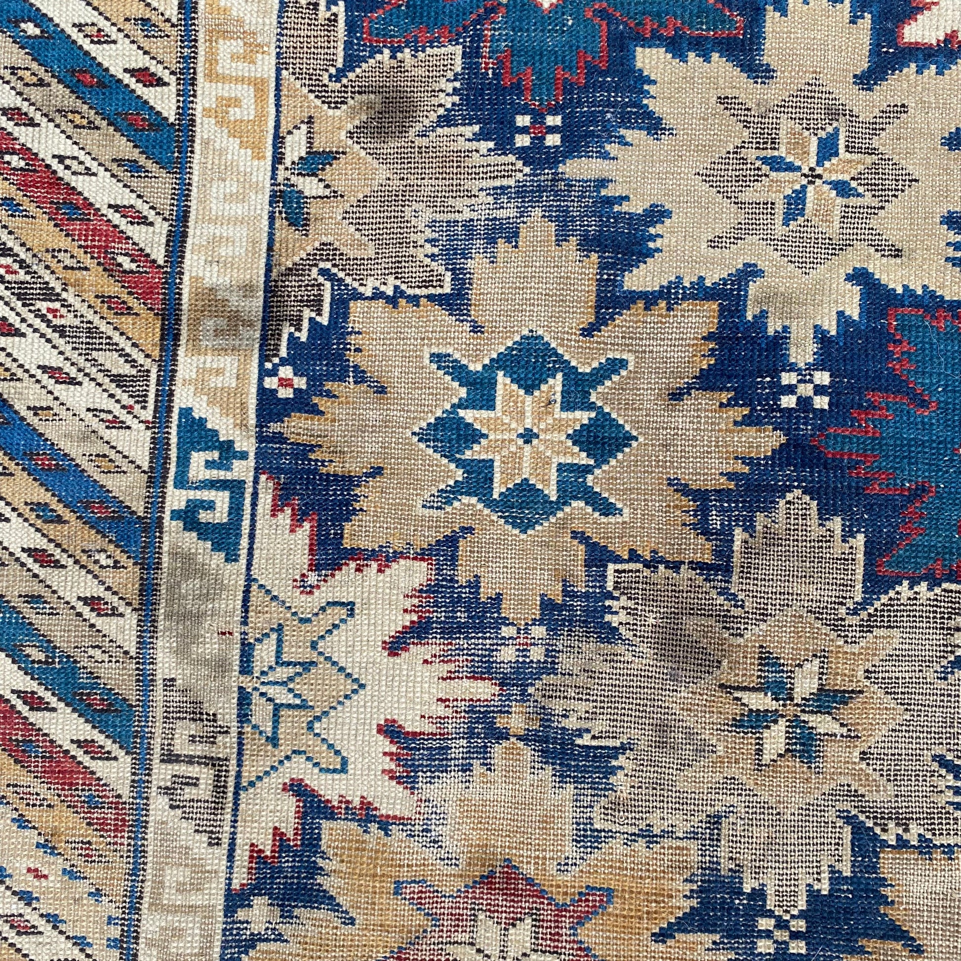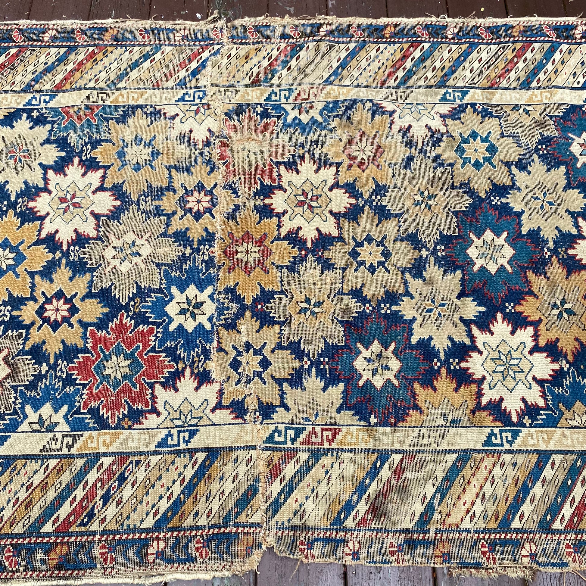 This antique Caucasian rug is in poor condition. The design features a tribal pattern set in a blue field with cream, gold and red-brown highlights. There is heavy wear throughout. This rug has crude repairs as seen in the photos. There are blemishes.