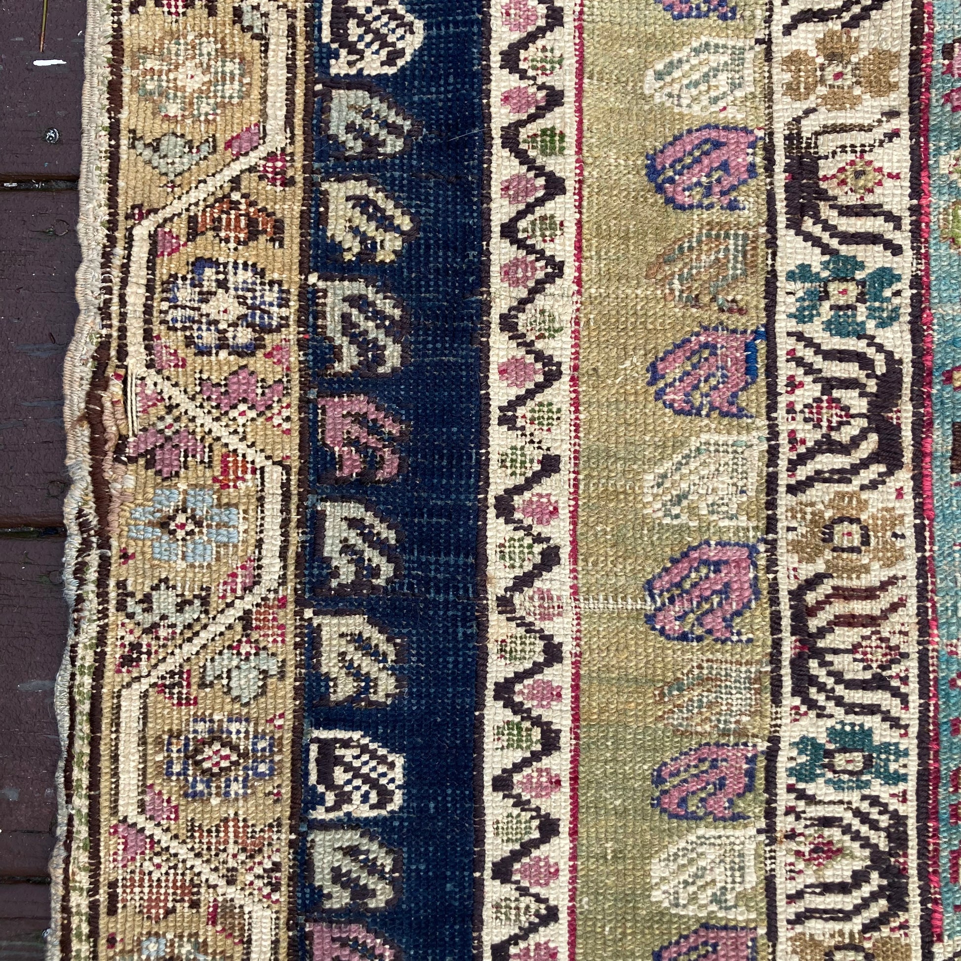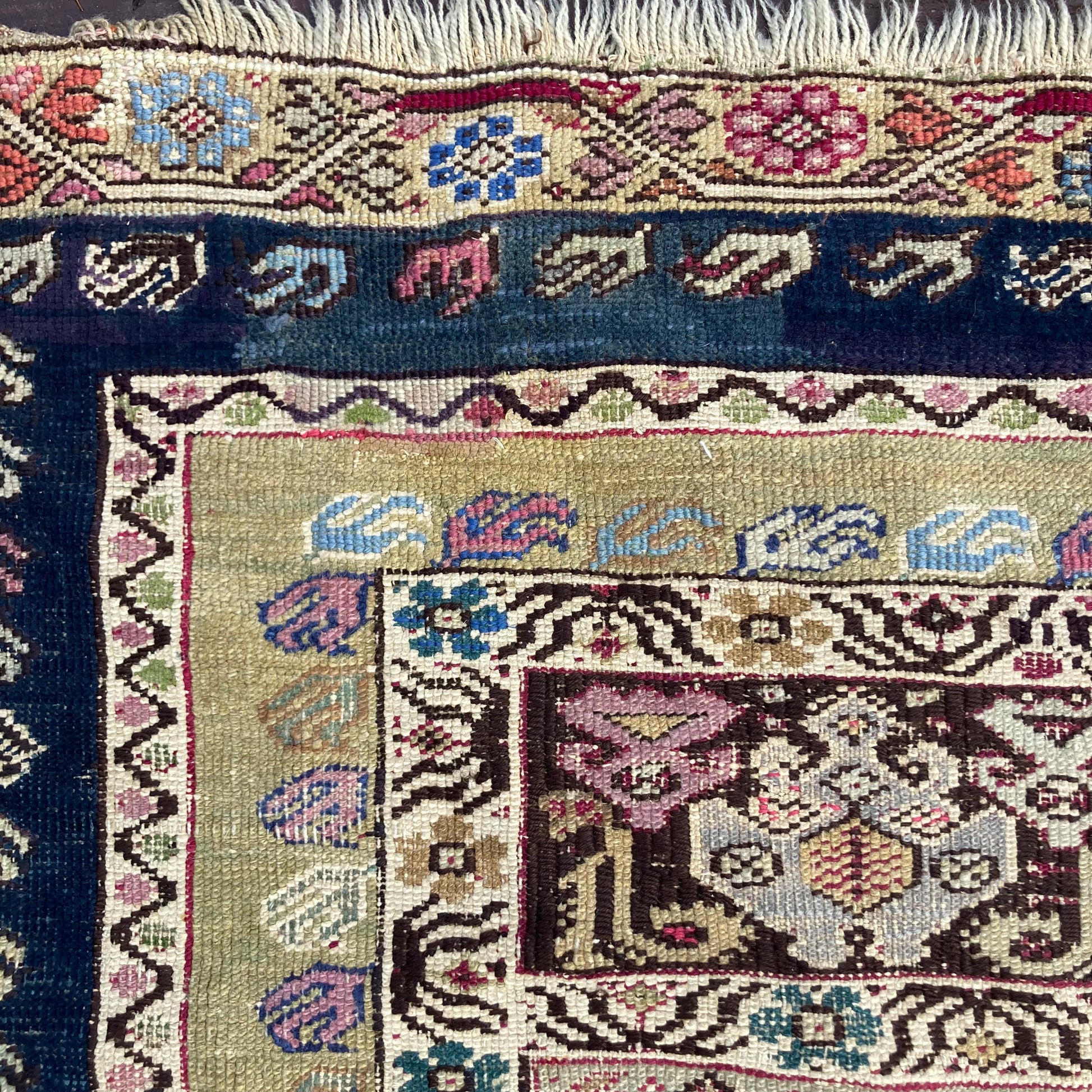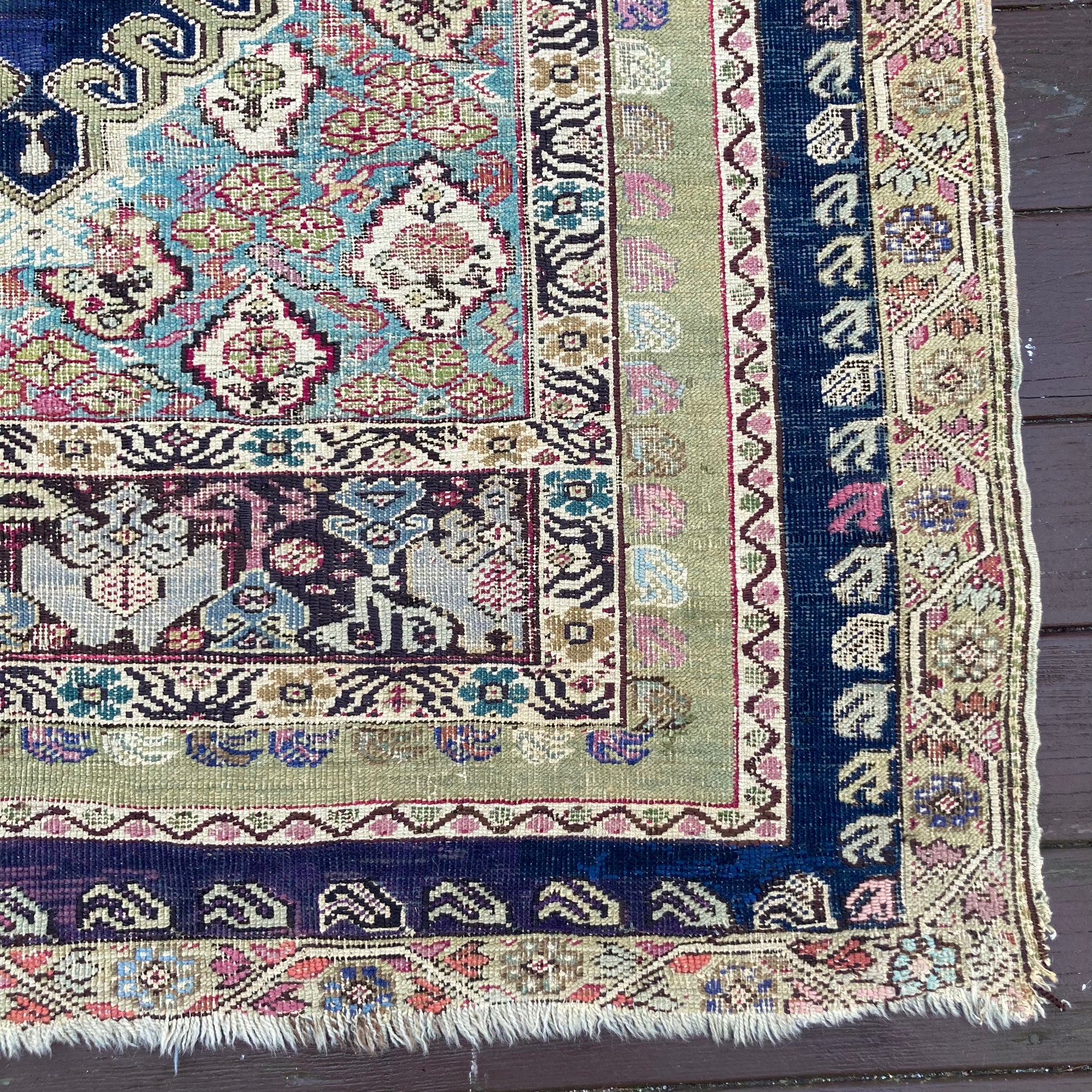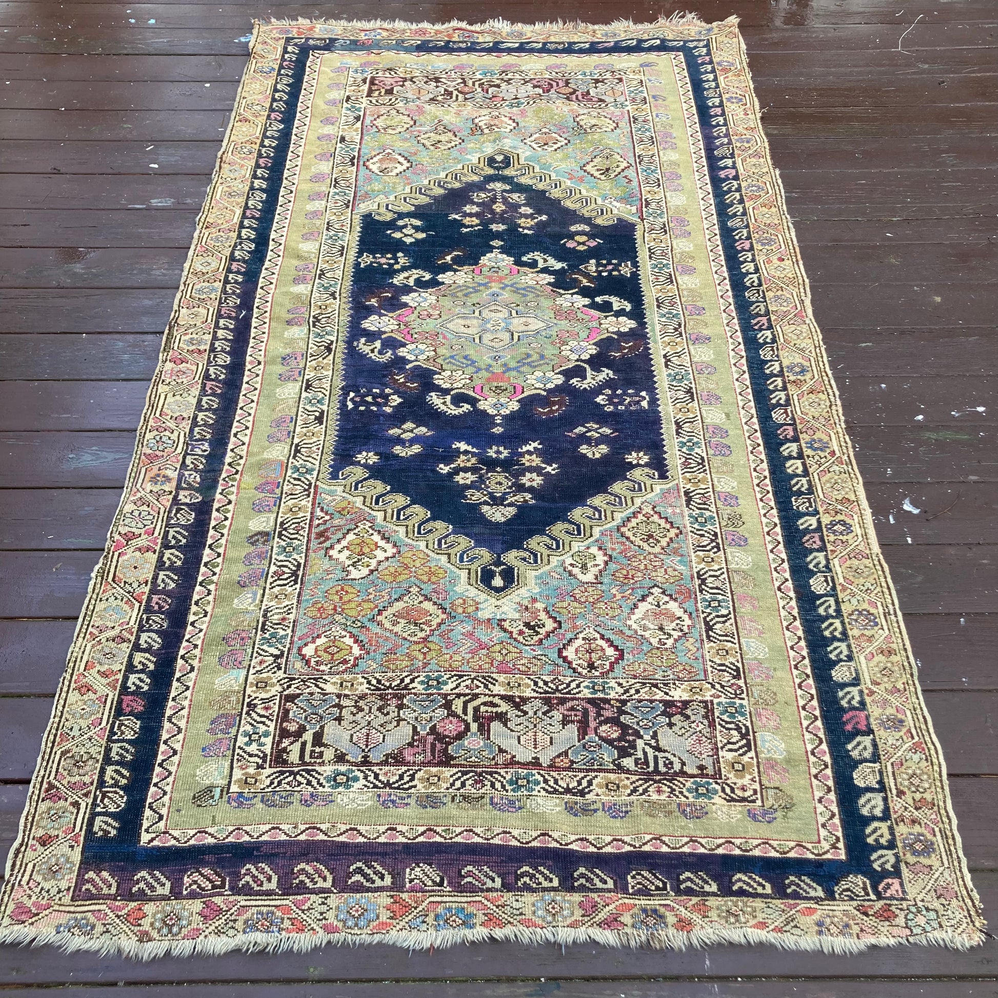 This antique Turkish rug is in fair condition. The design features a central medallion set in a blue field with green and pink highlights. There is wear on the edges, fringe ends and throughout. There is some re-piling and some lovely wool accents that were added after the rug was made that can be seen in the photos.
