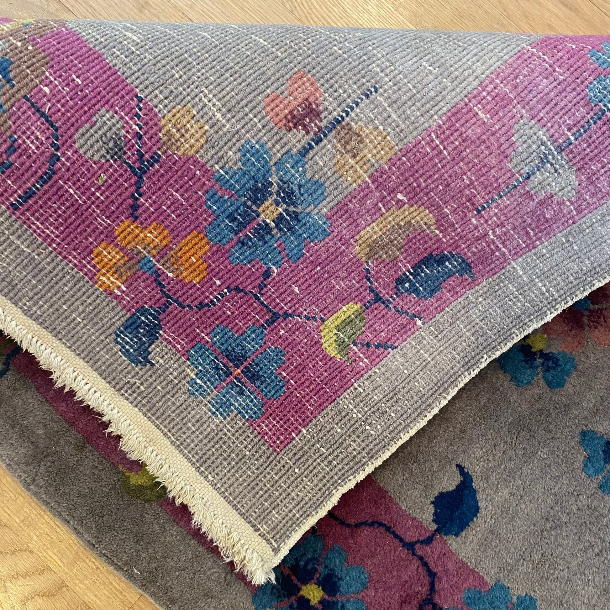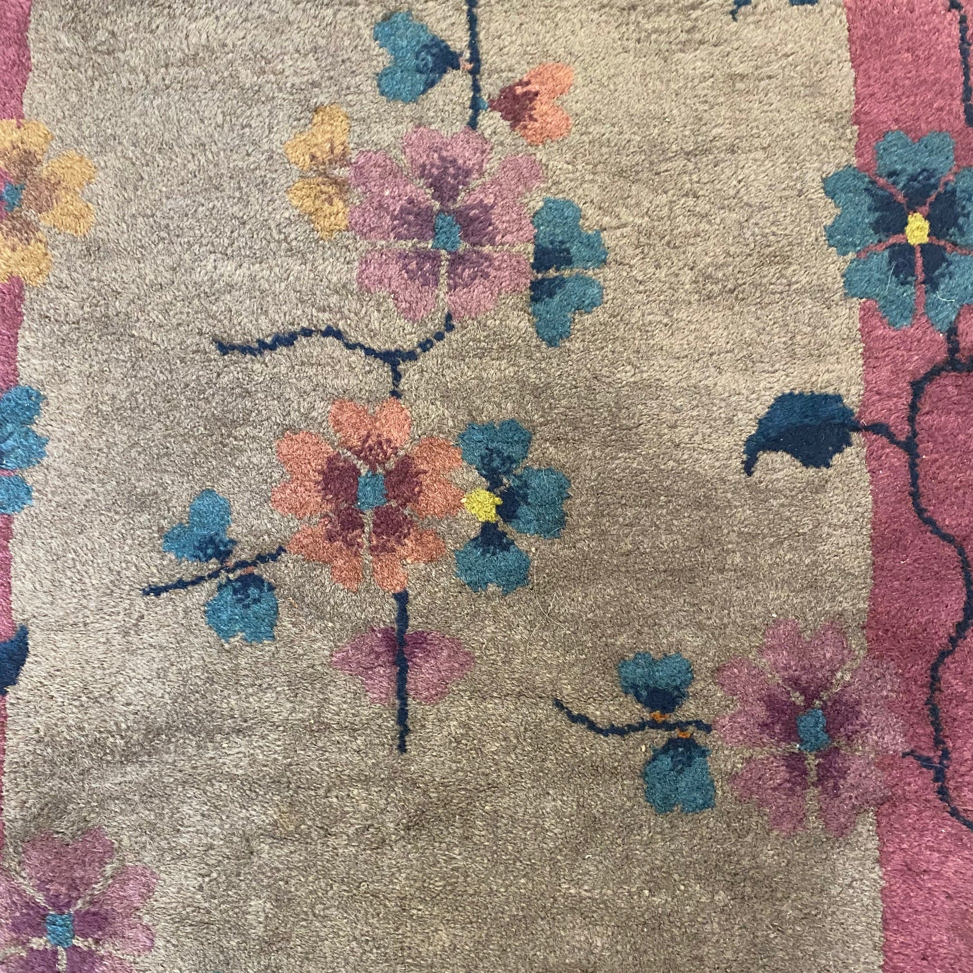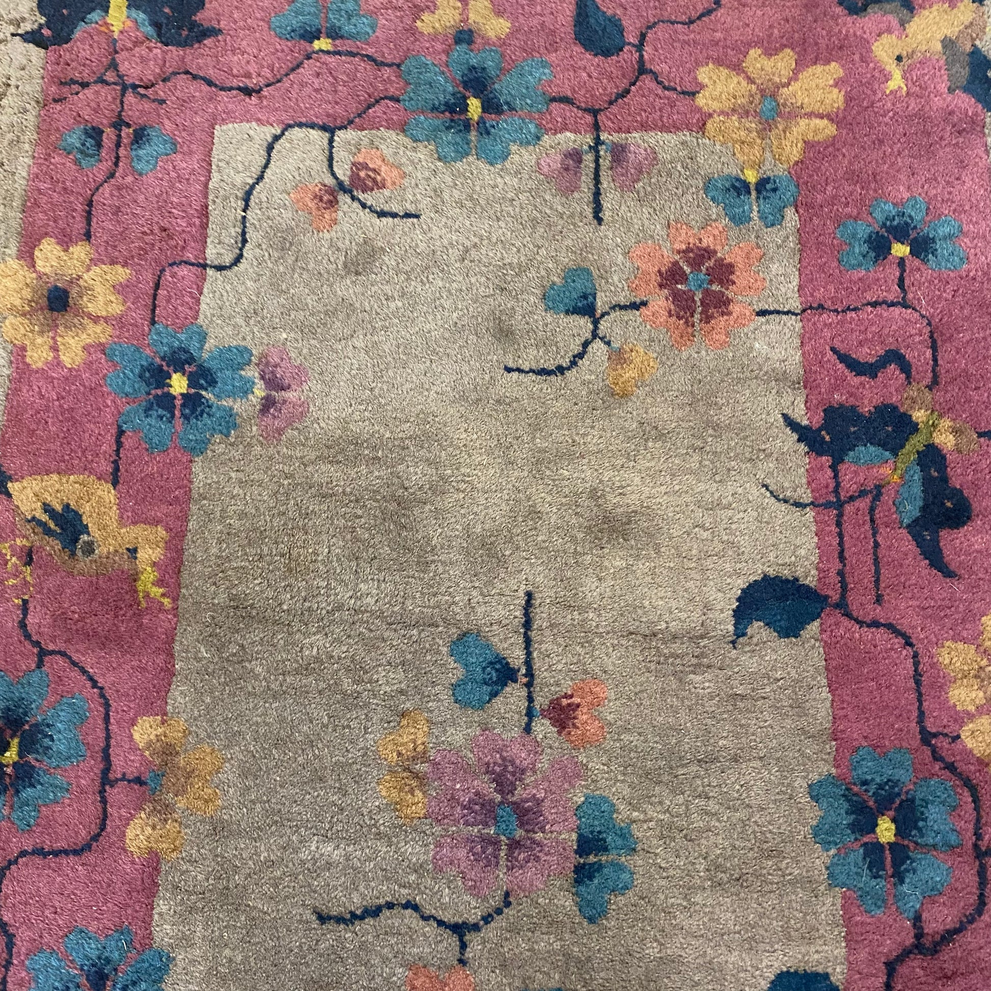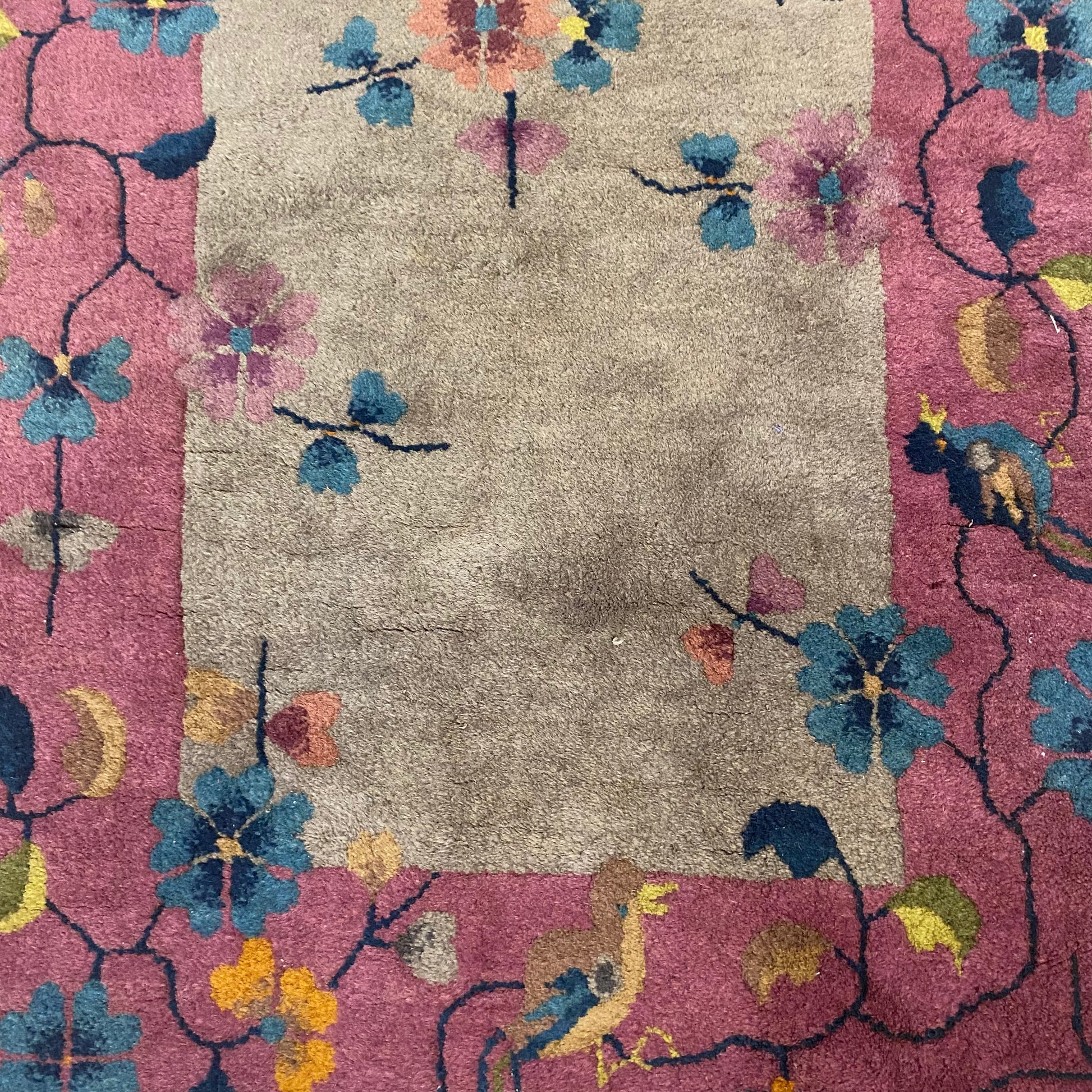 This vintage rug is in good condition. The design features an open, grey field with floral and animal motifs including birds and butterflies. There is wear on the edges, fringe ends and throughout. There are some nicks in the pile as seen in the photos.