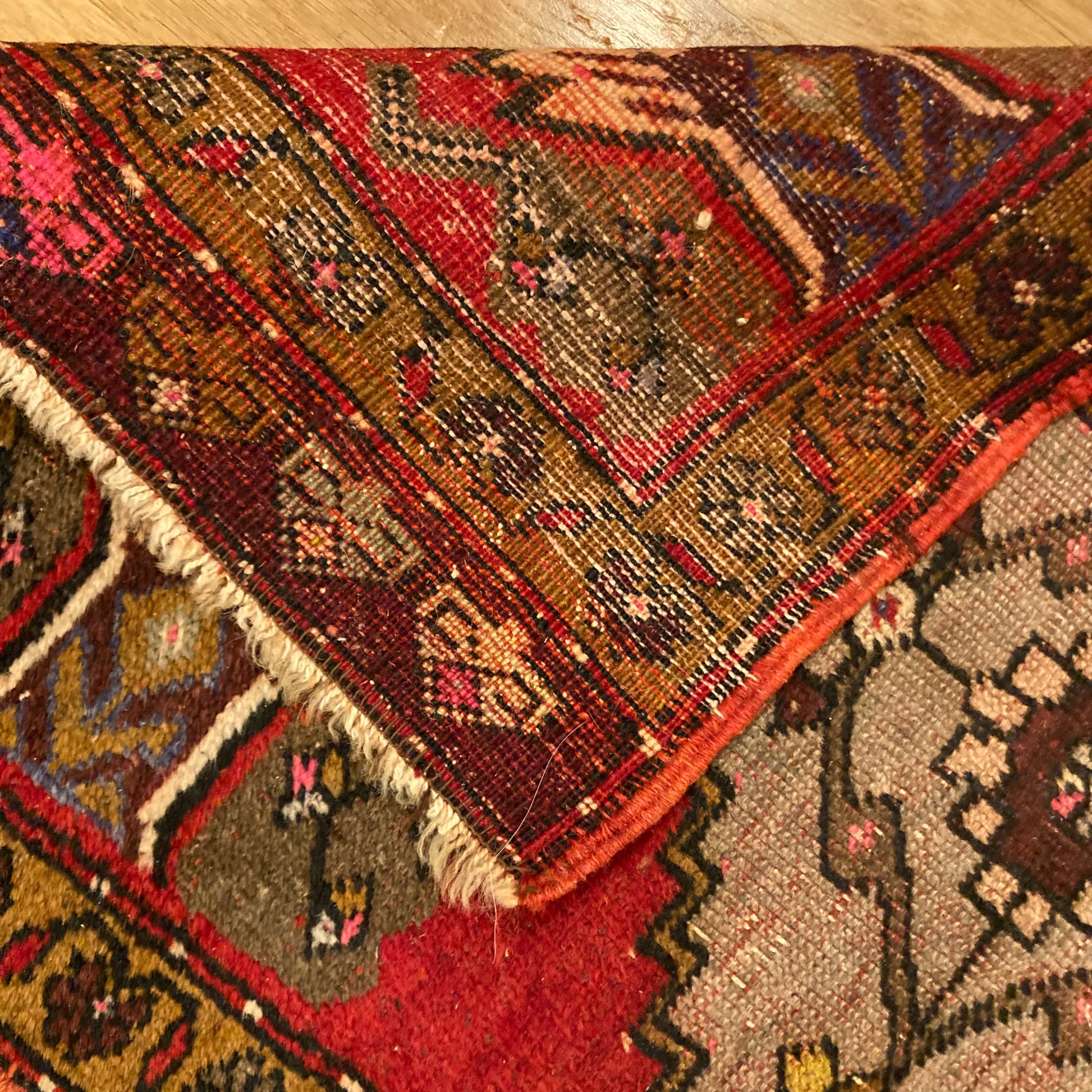 This vintage rug is in very good condition. The design features a tribal pattern set in a red field with dark gold and white highlights. There is wear on the edges, fringe ends and throughout.