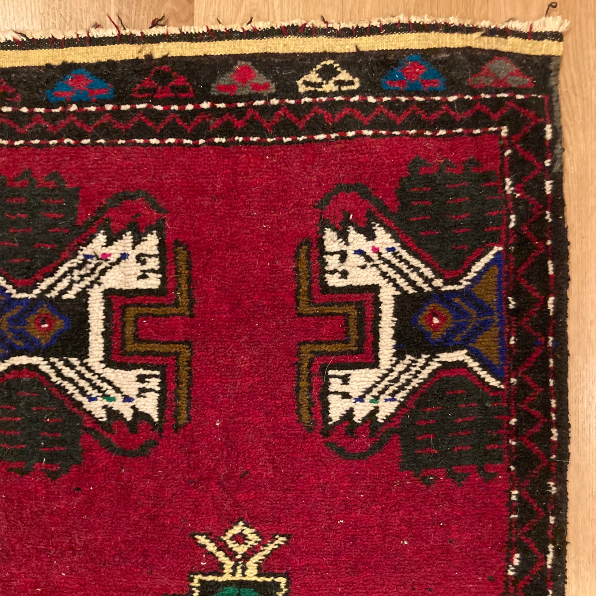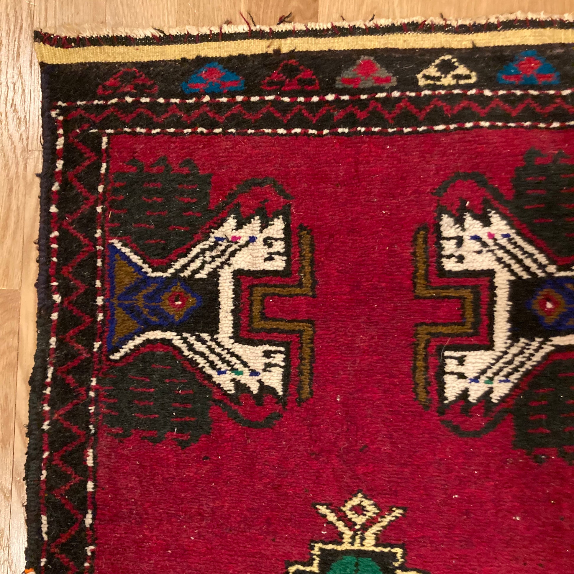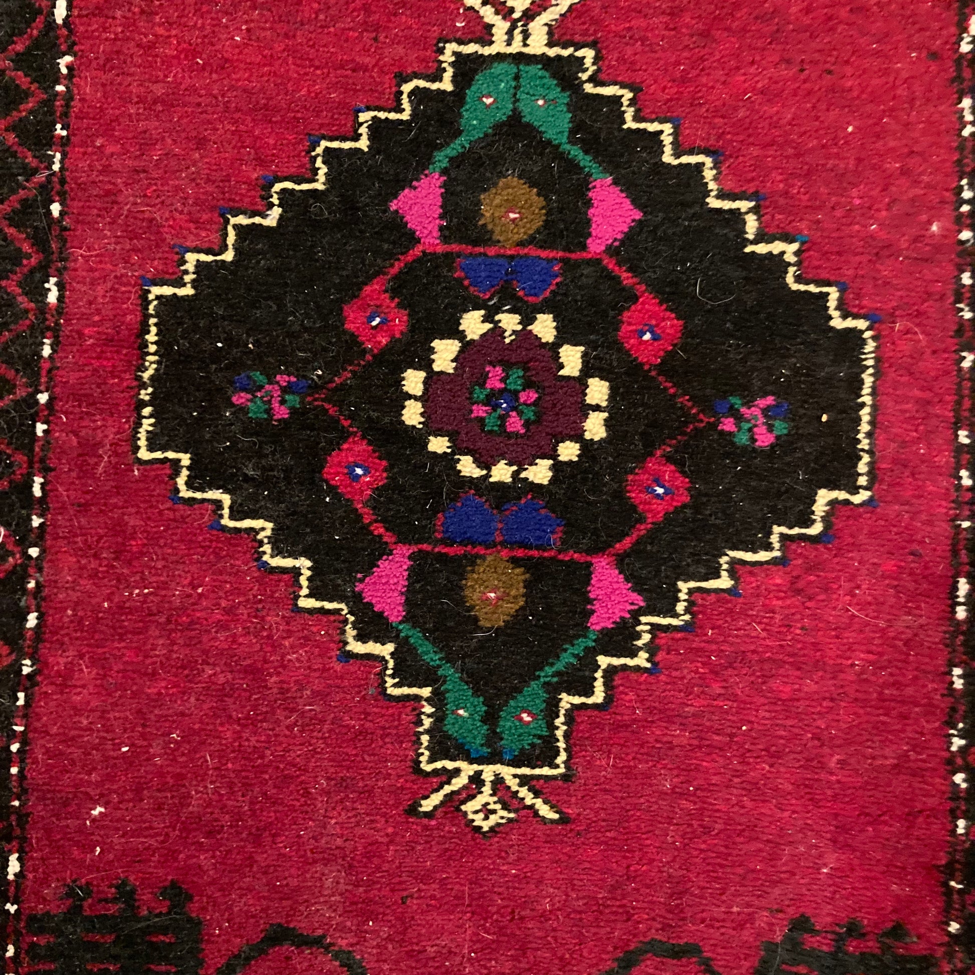 This vintage Turkish rug is in very good condition. The design features a tribal pattern set in a red field with brown, green and white highlights. There is light wear on the edges, fringe ends and throughout.