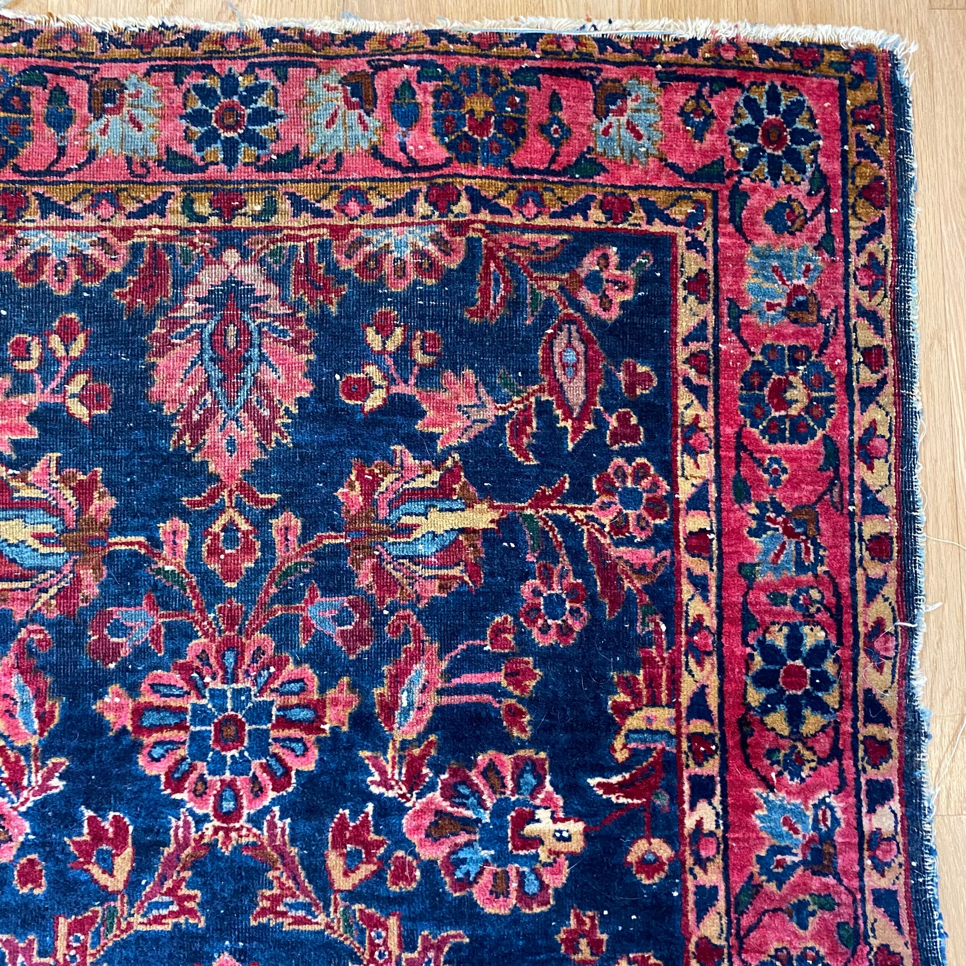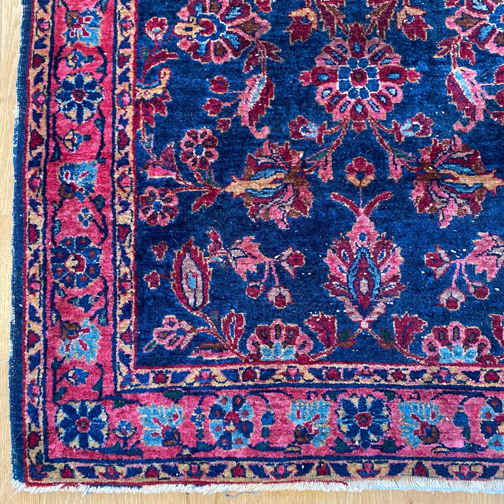 This vintage rug is in fair condition. The design features a floral pattern set in a blue field with pink and tan highlights. There is wear on the edges, fringe ends and throughout as seen in the photos.