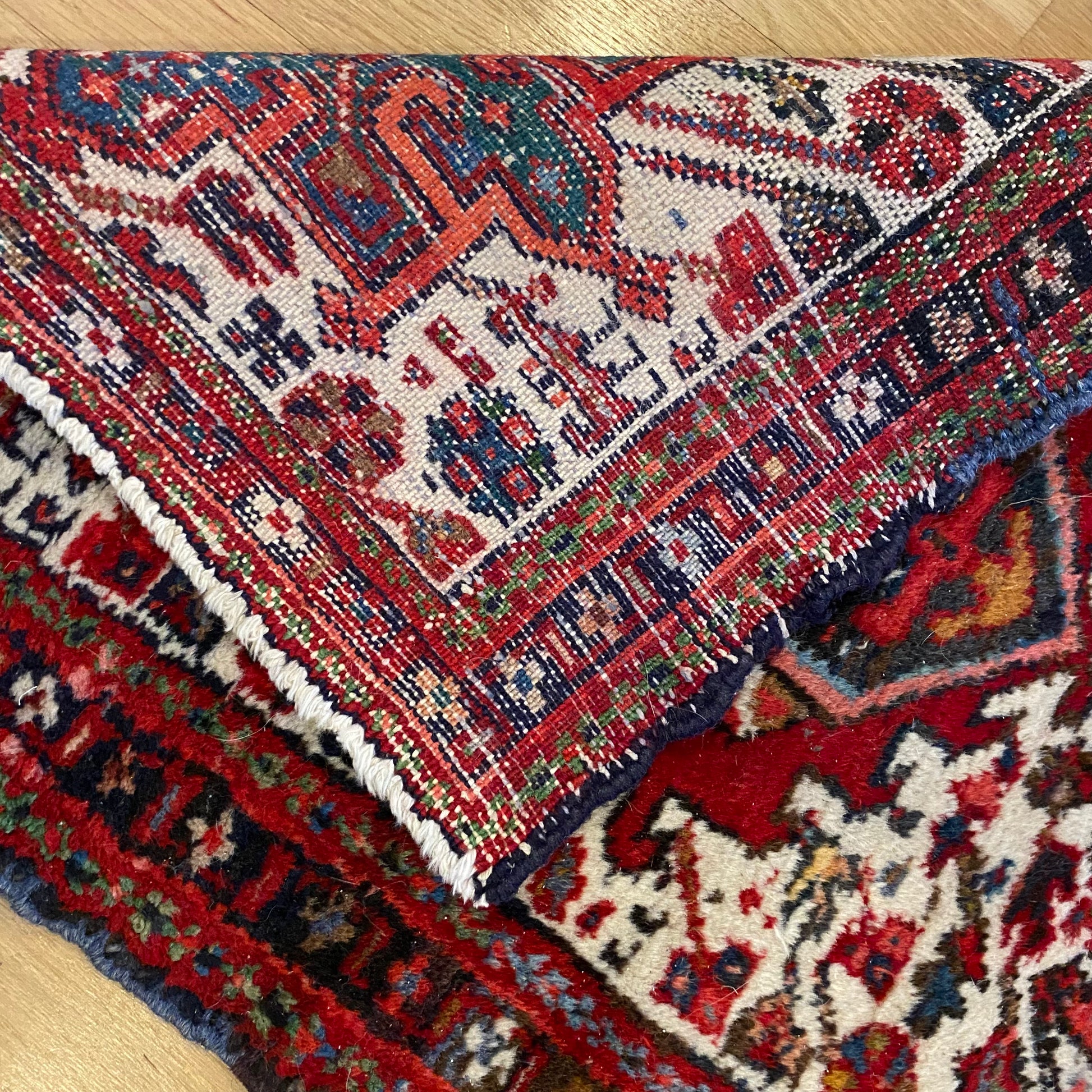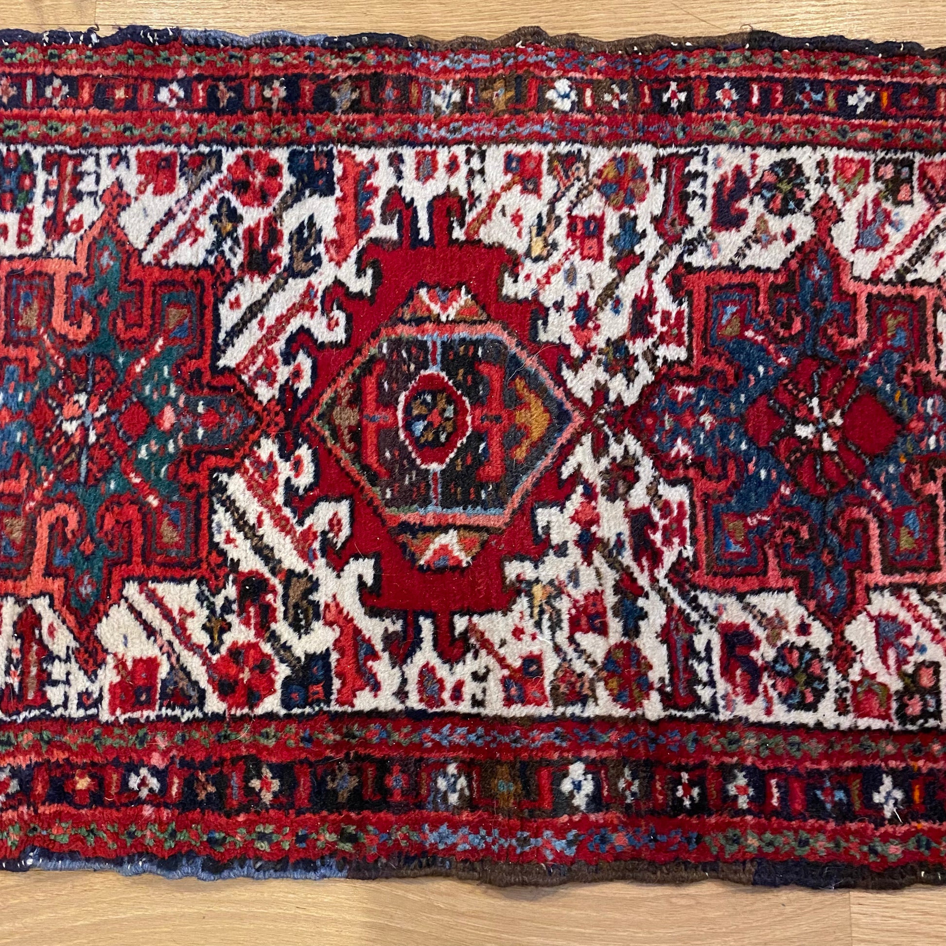 This vintage rug is in very good condition. The design features tribal medallions set in a white field with red and blue highlights. There is even wear throughout.